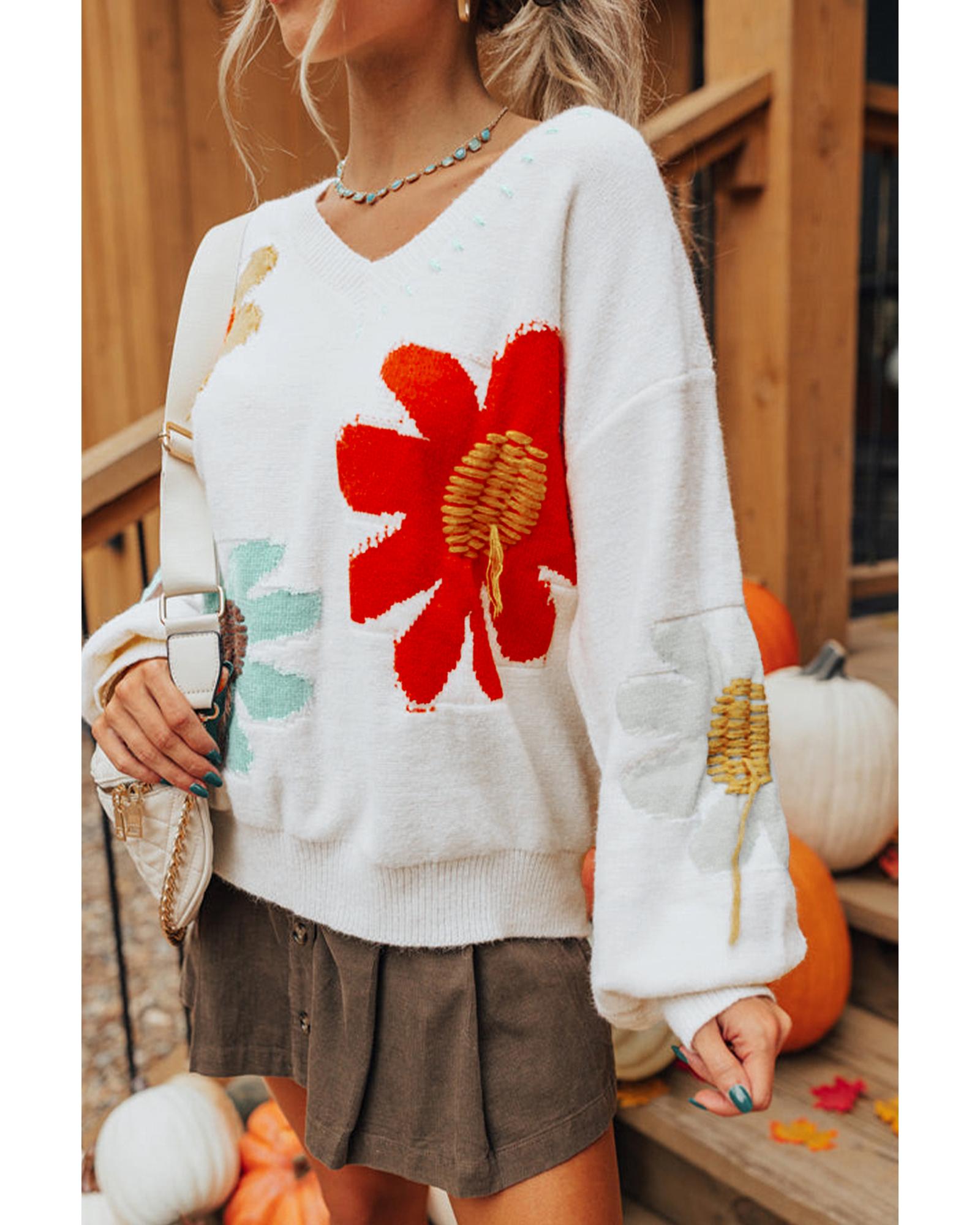 - White Big Flower Pattern V Neck Drop Shoulder Sweater