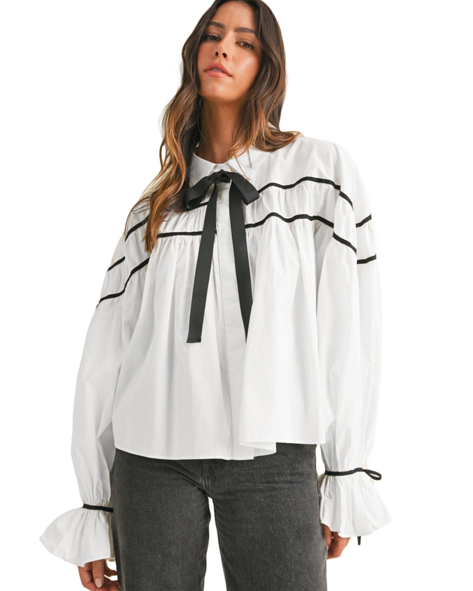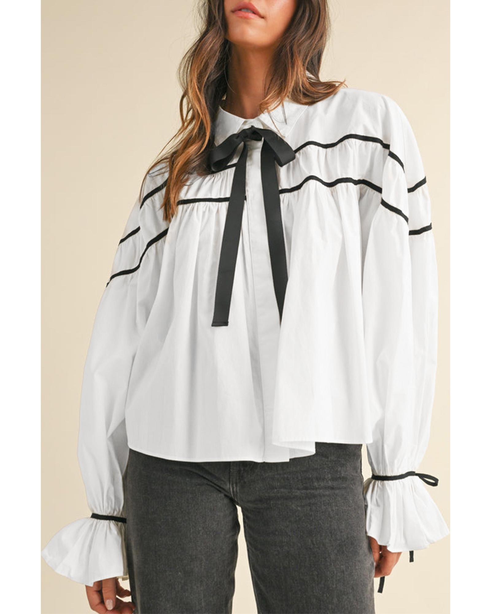 White Black Pipping Ribbon Bowtie Collared Ruffled Puff Sleeve Shirt – M