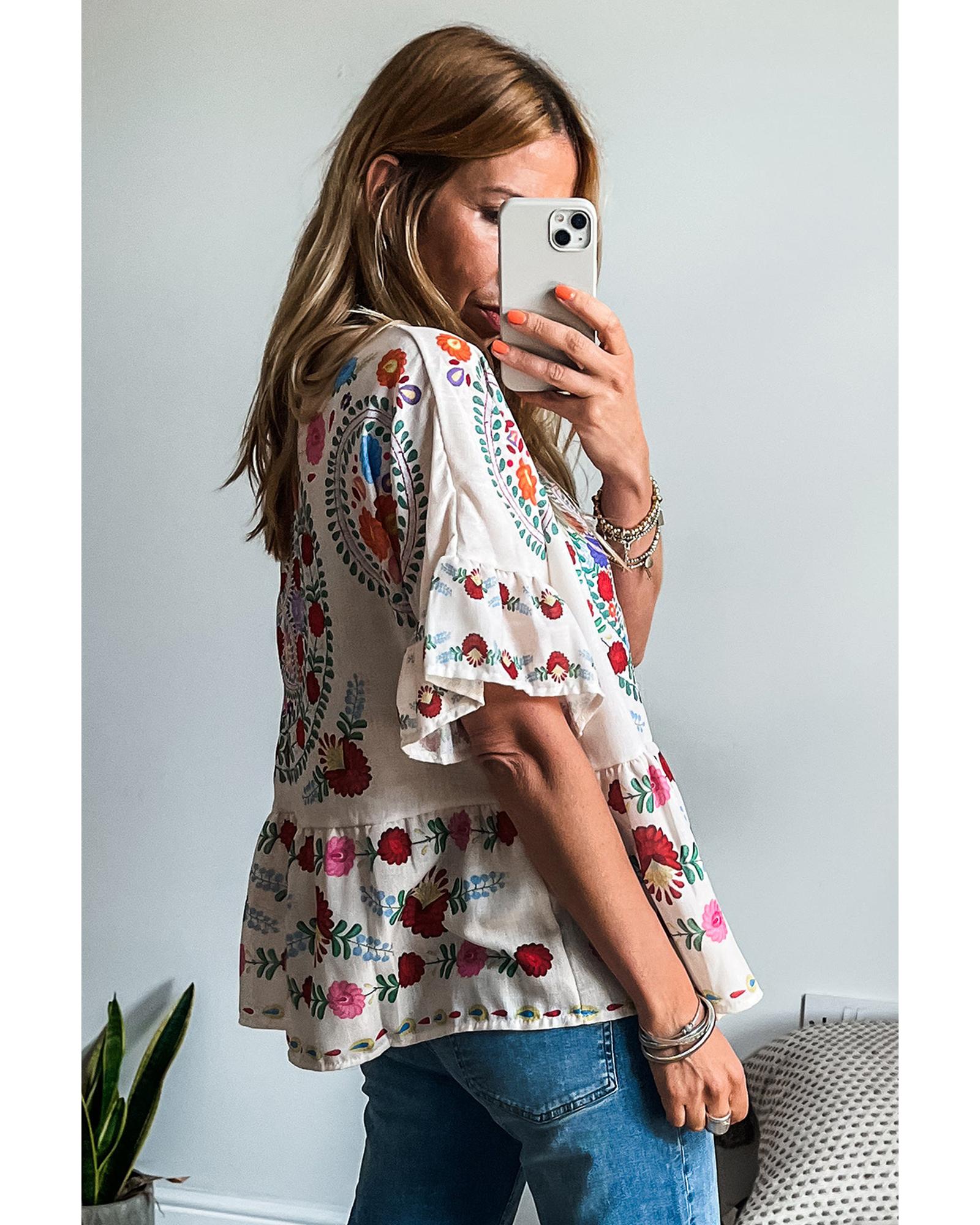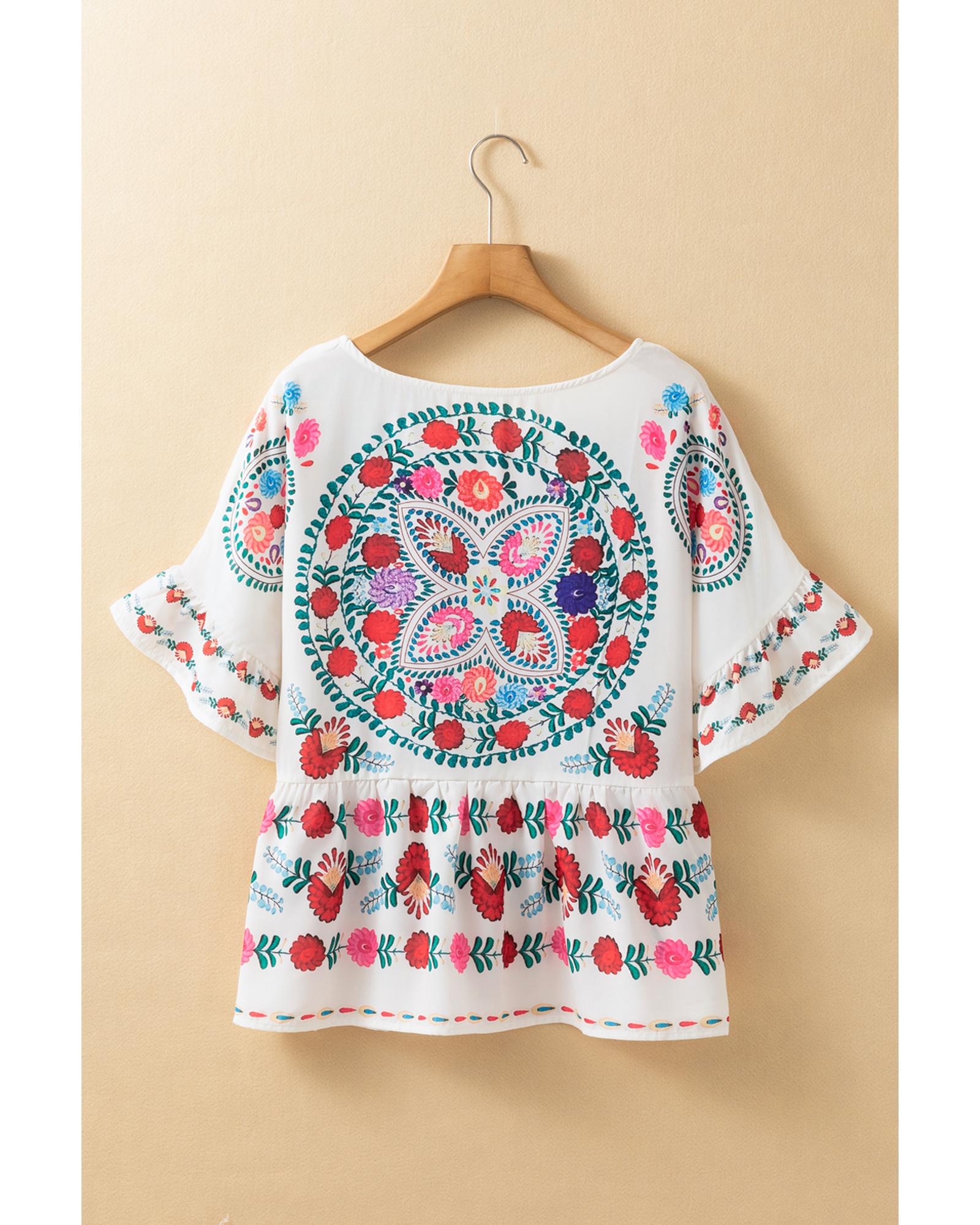 White Boho Floral Print Round Neck Ruffle Trim Blouse – S