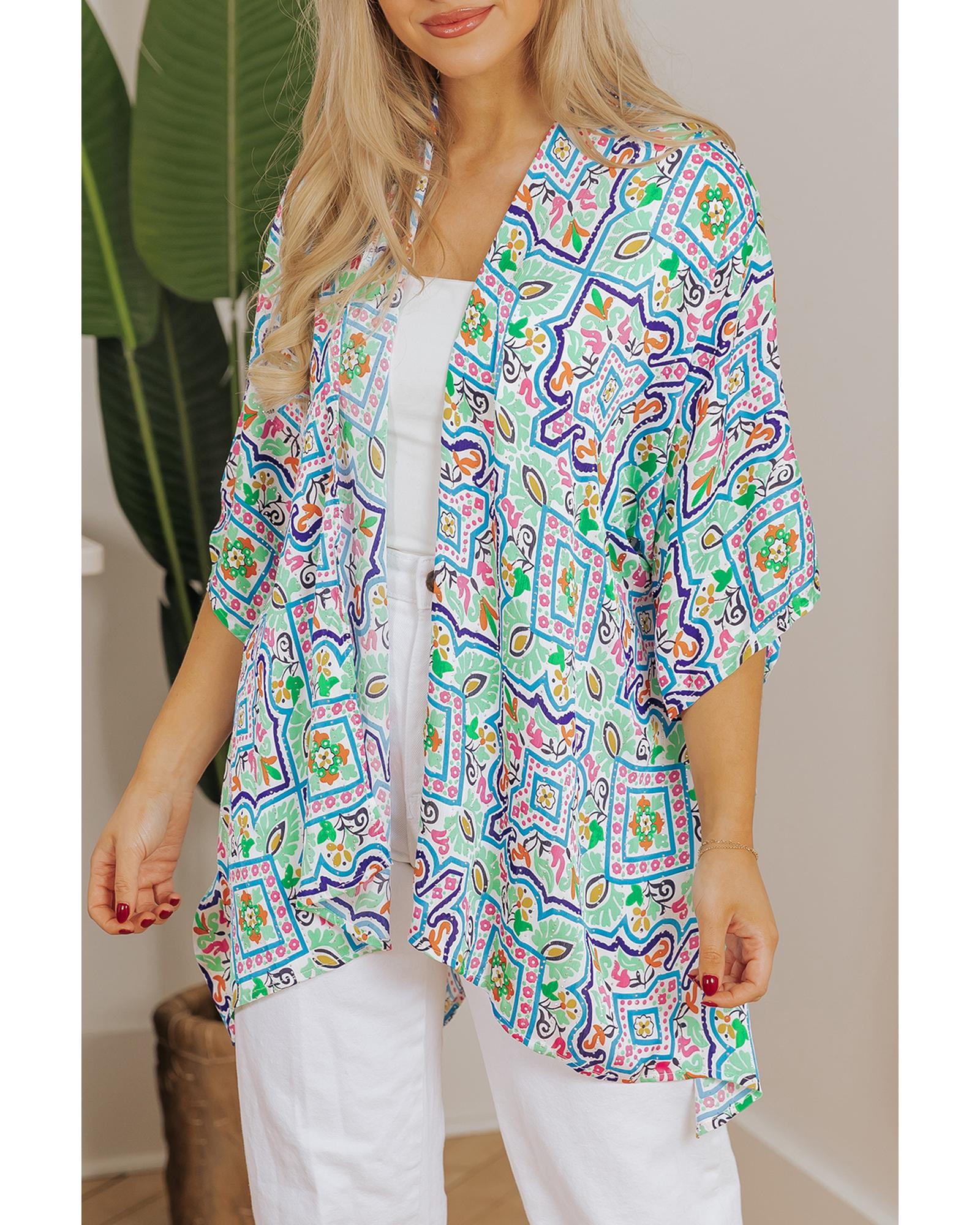 White Boho Floral Printed Rhinestone 3/4 Sleeve Open Front Kimono – M
