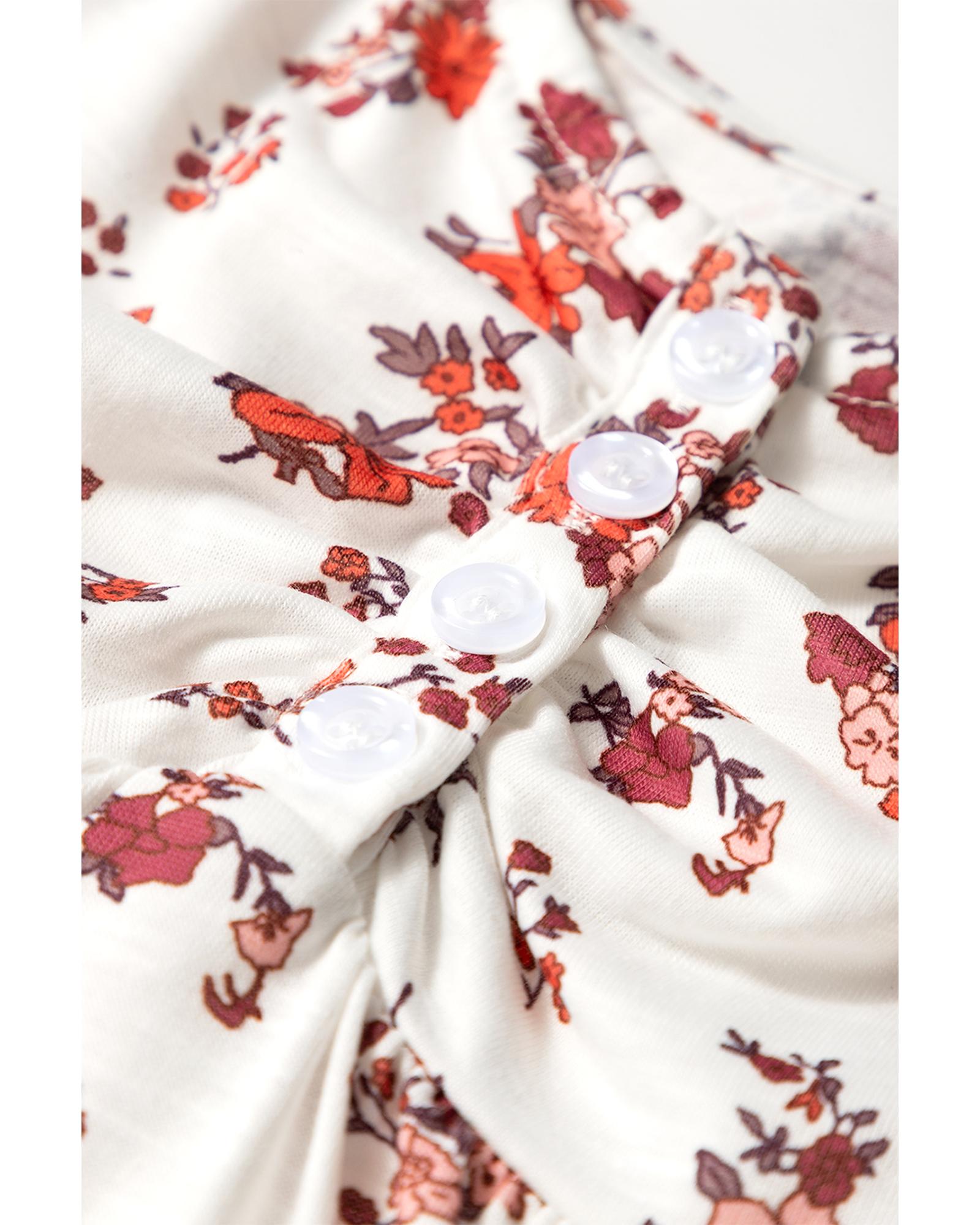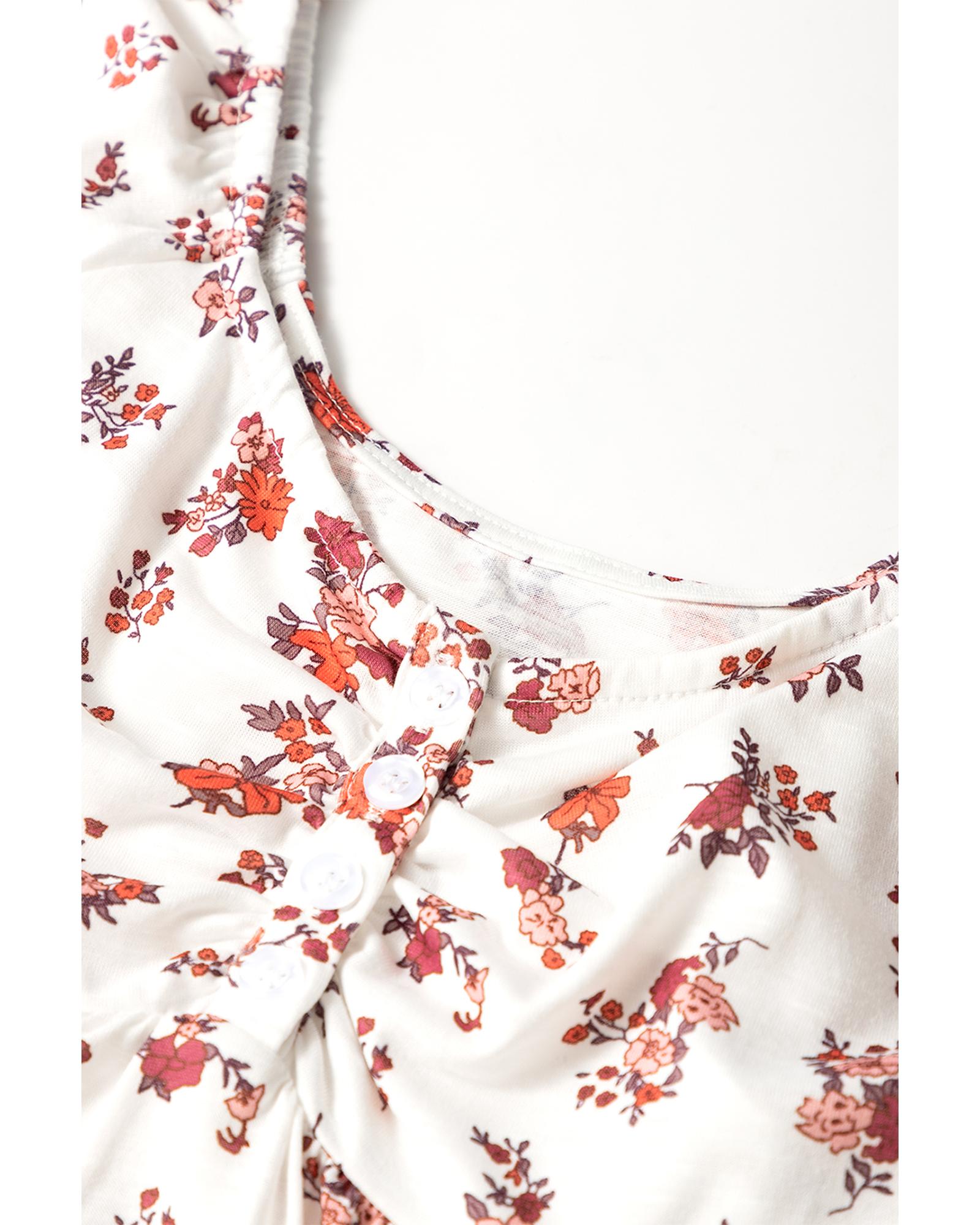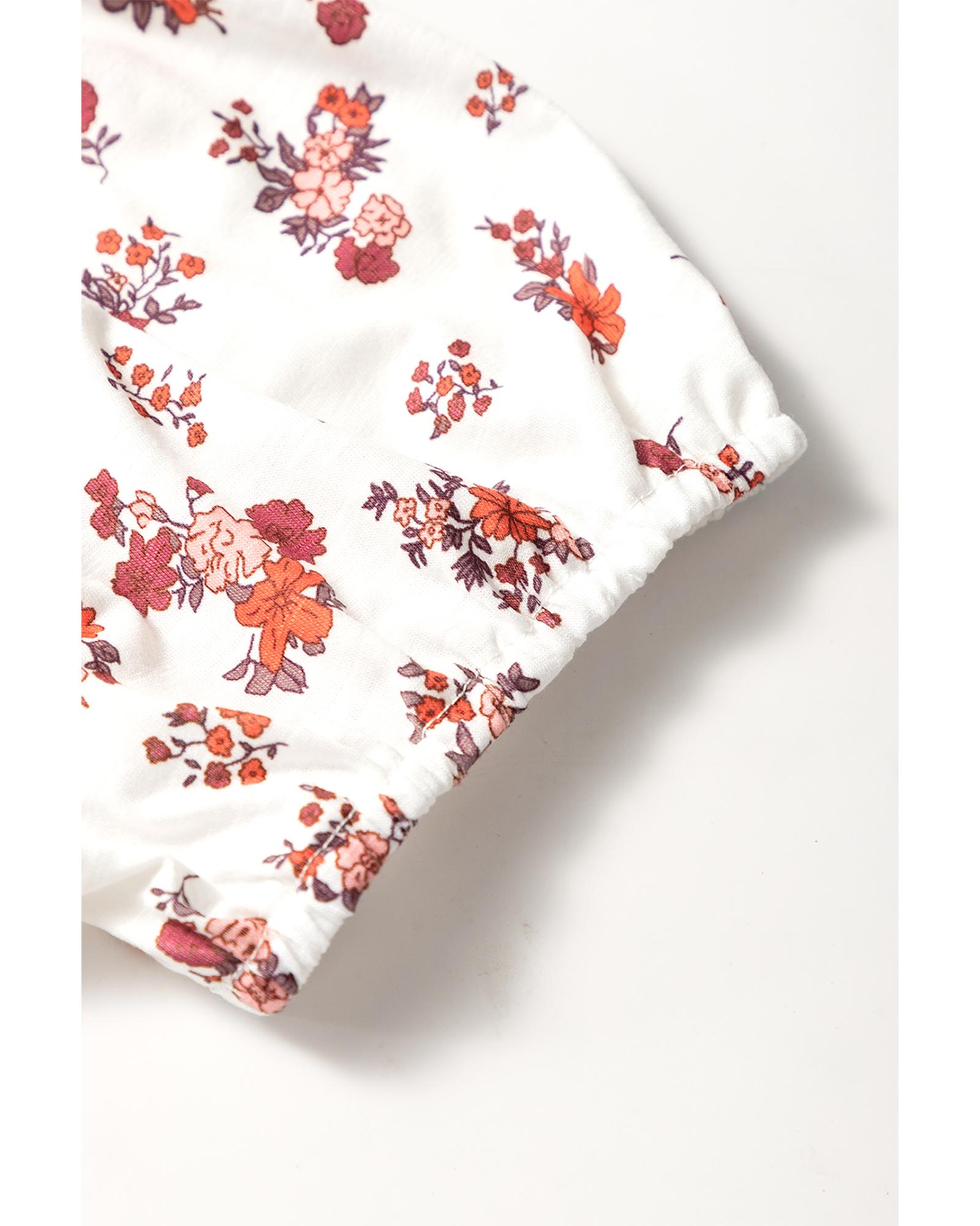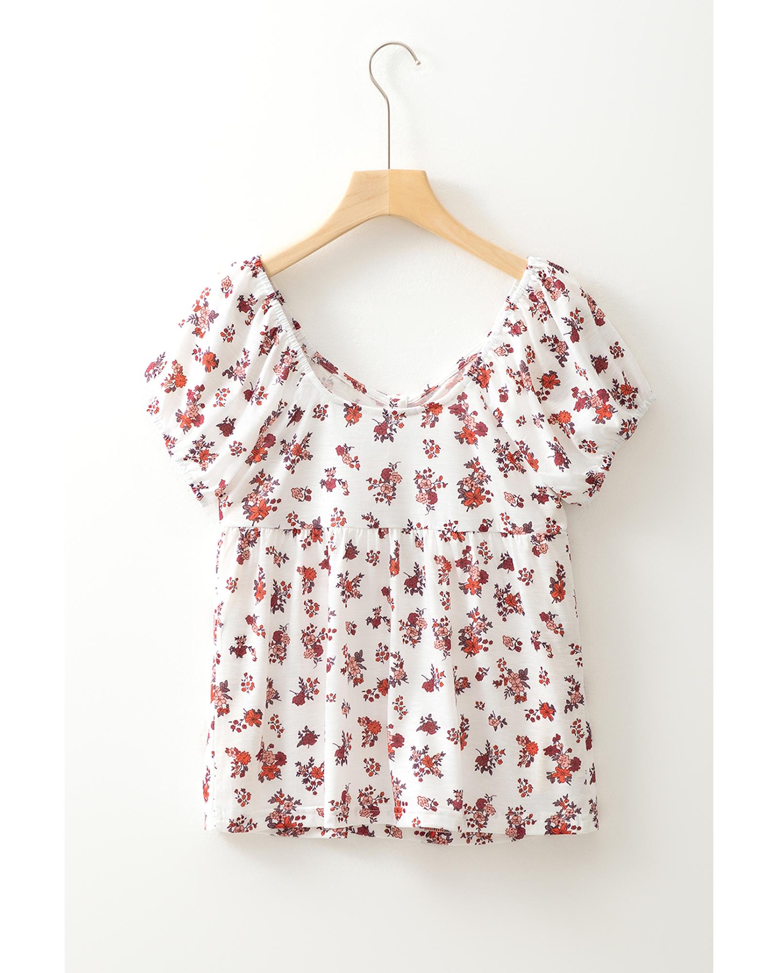 White Boho Floral Ruched Cinched Short Sleeve Blouse – M