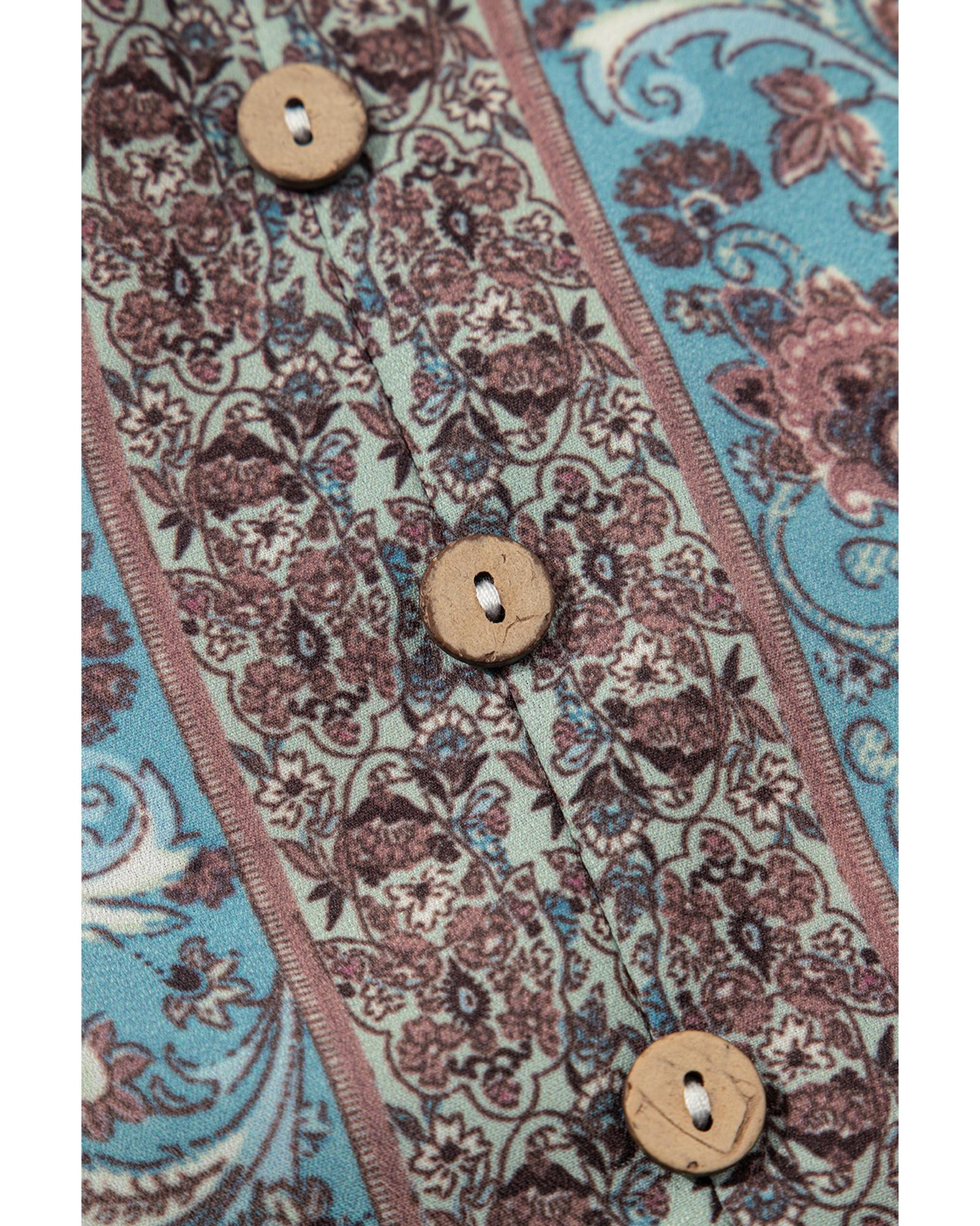 - White Boho Pattern Tiered Ruffled Sleeve V Neck Buttoned Blouse