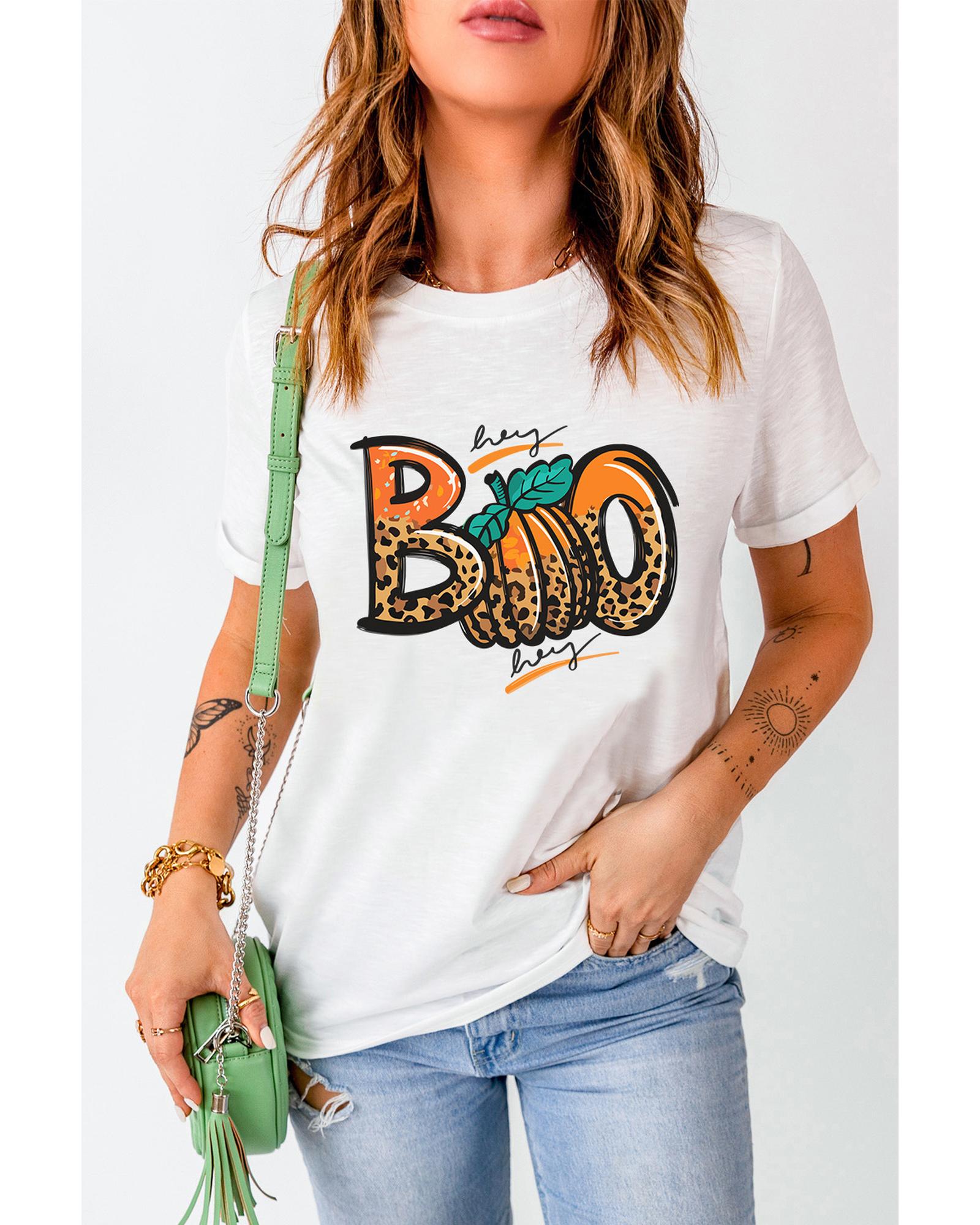 Stylish and trendy white t - shirt for women Crew neck design with a unique leopard print pattern Features a BOO pumpkin graphic Made with high
