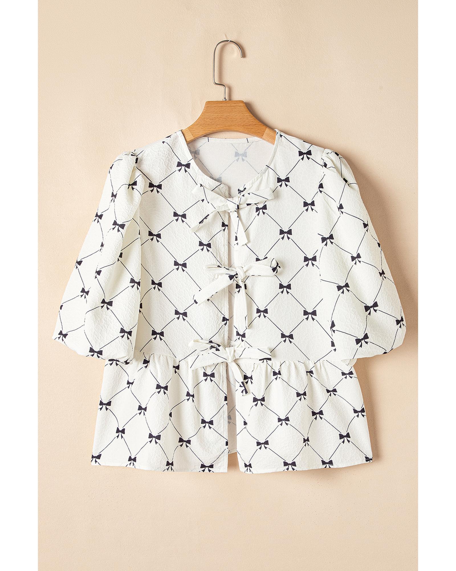 White Bowknot Print Front Knots Bubble Sleeve Blouse – M