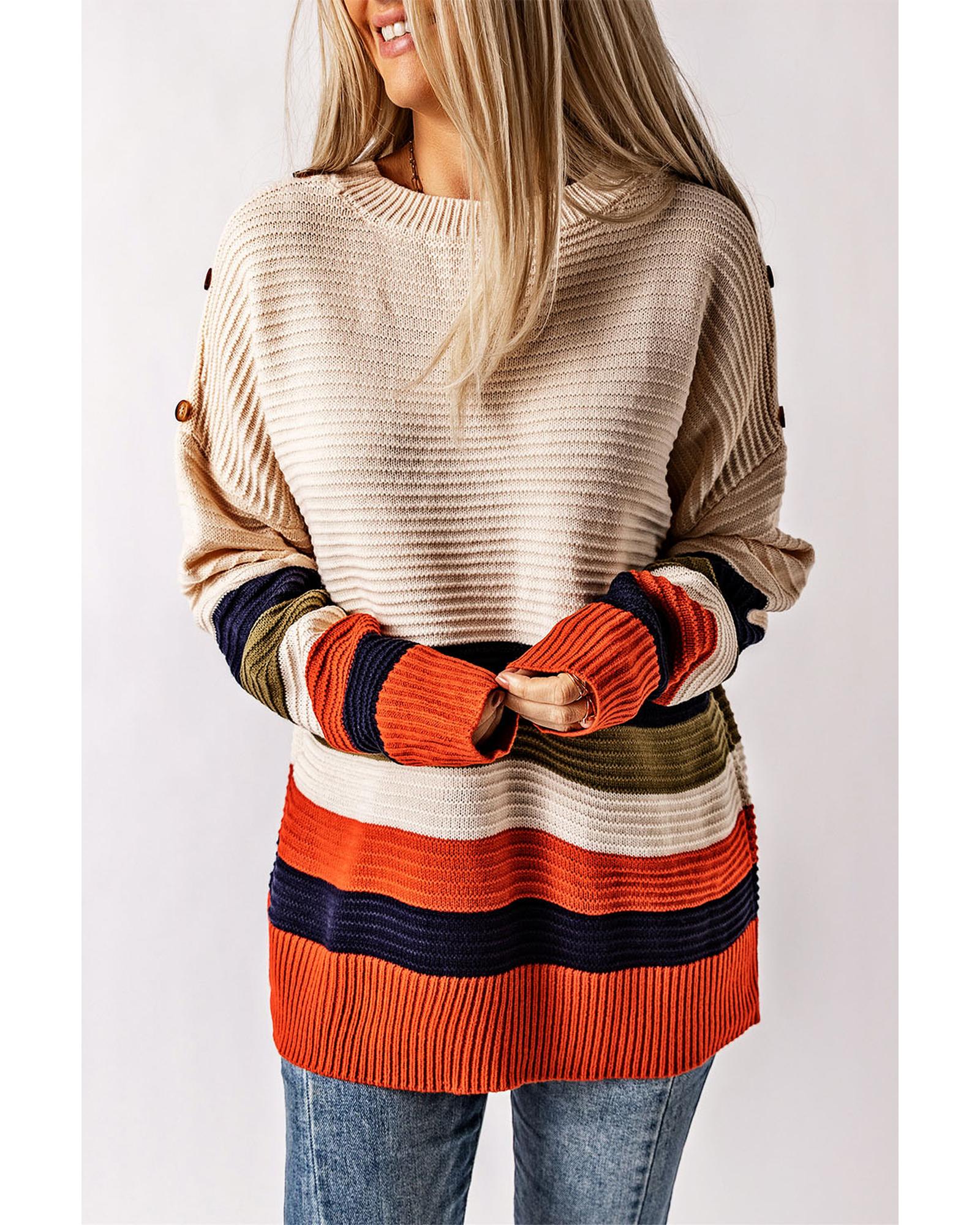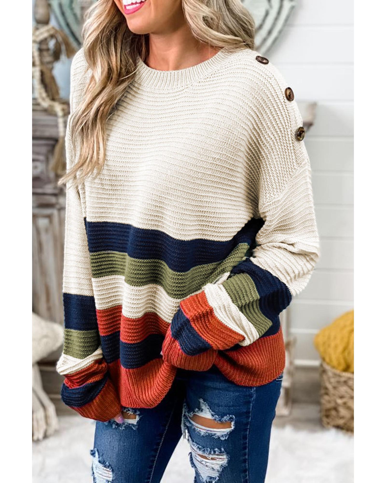 White Buttoned Shoulder Drop Shoulder Striped Sweater – S