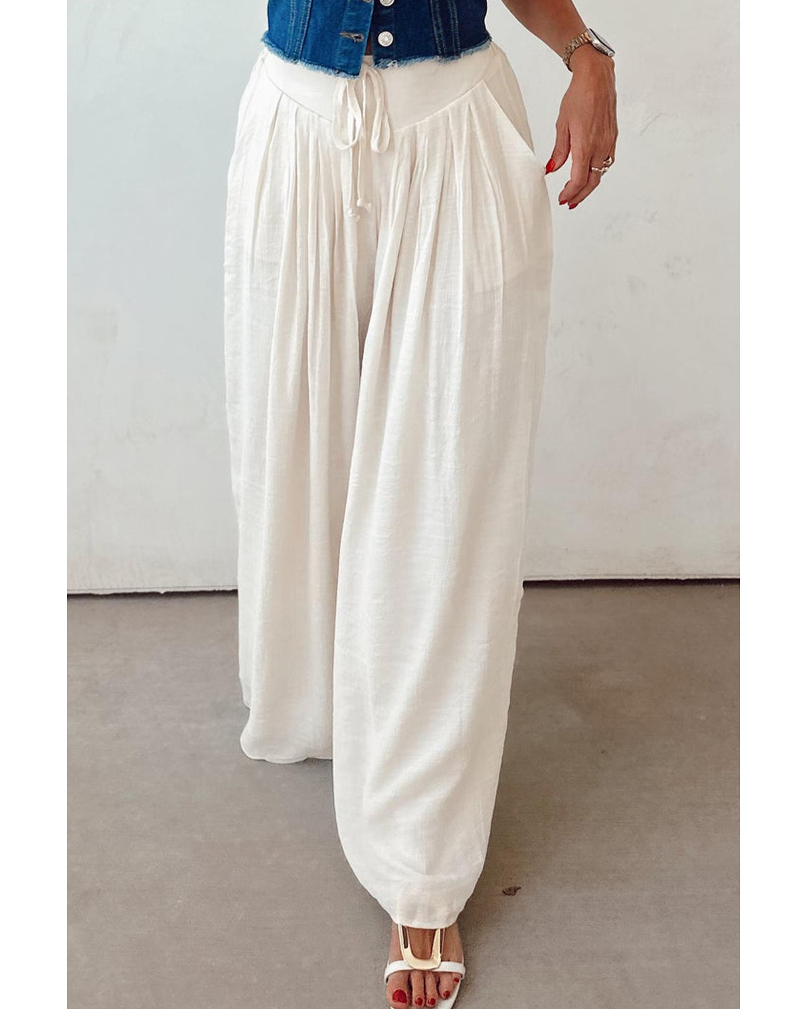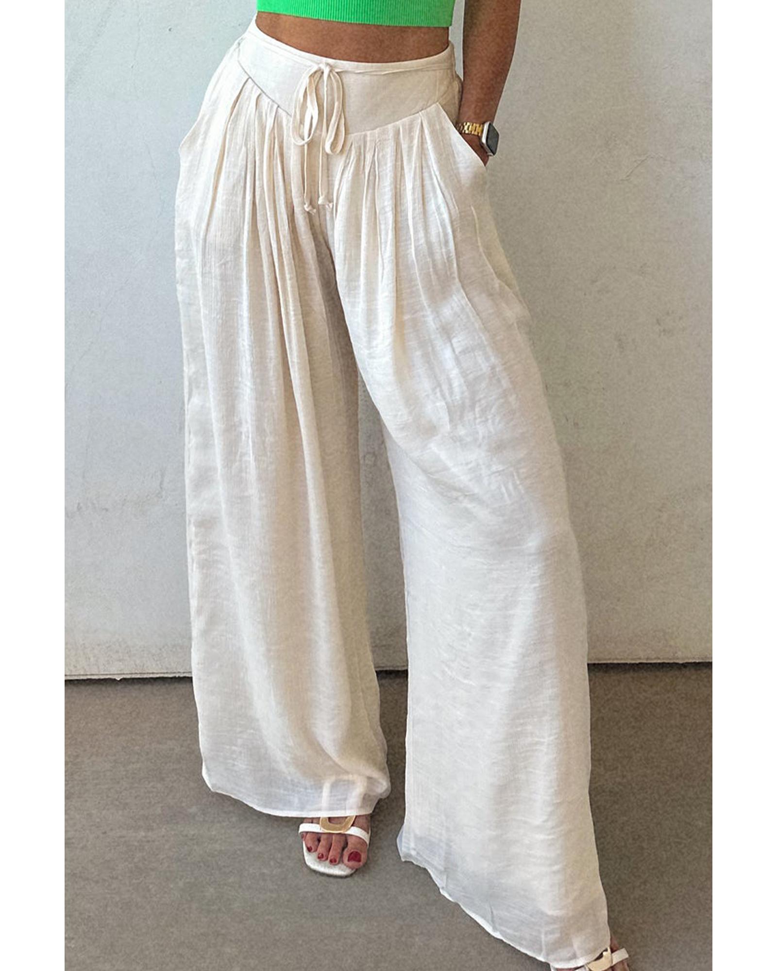 White Casual Tie Waist Pleated Wide Leg Pants – XL