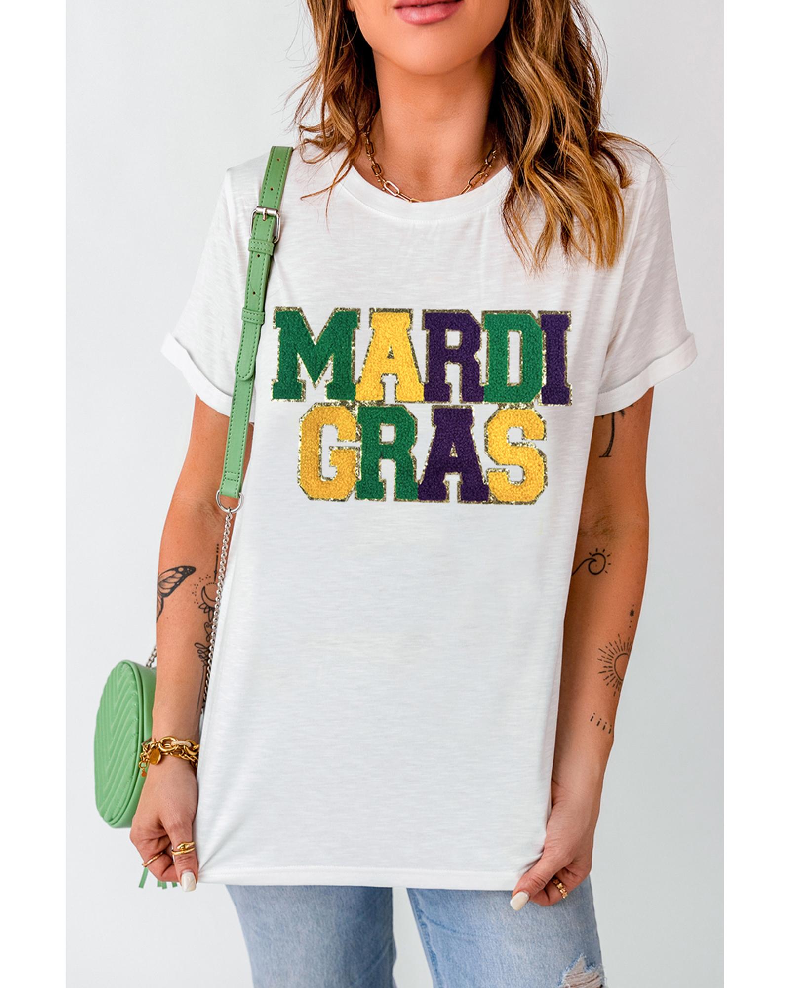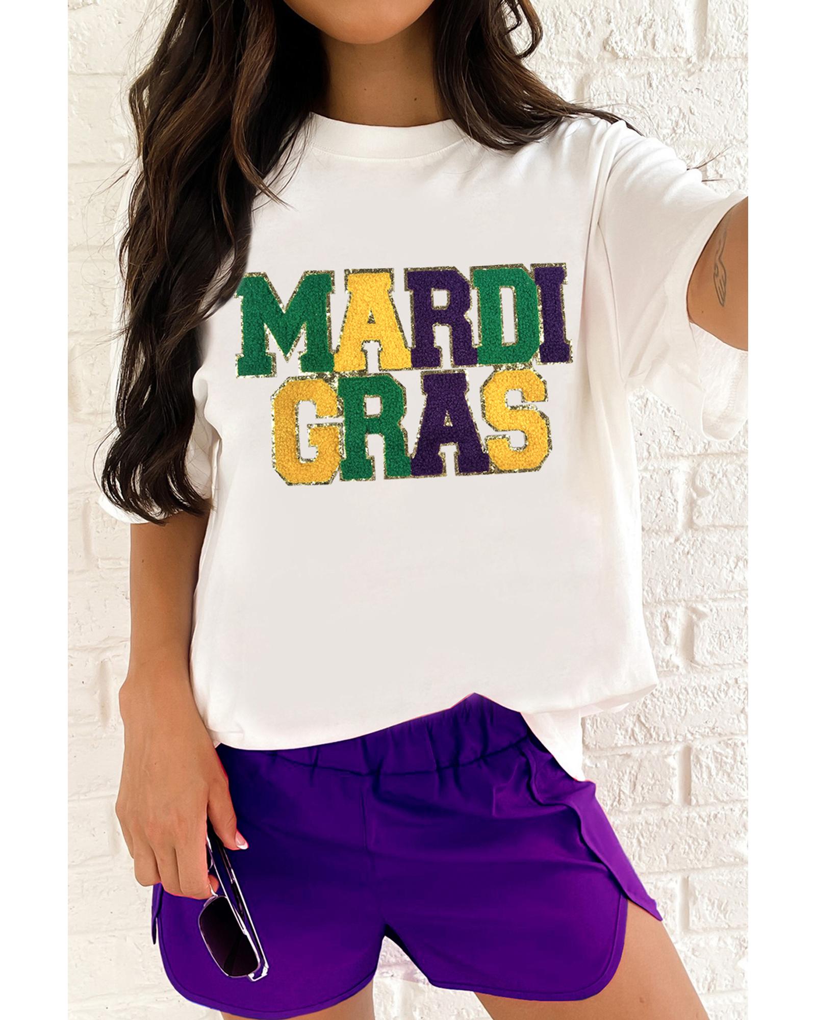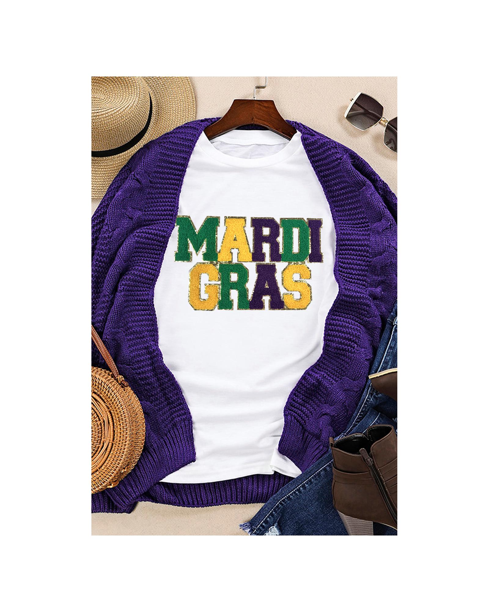 White Chenille MARDI GRAS Patched Graphic T Shirt – 3XL