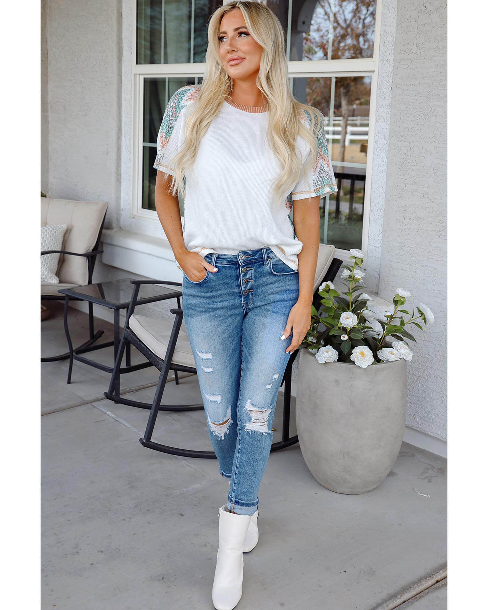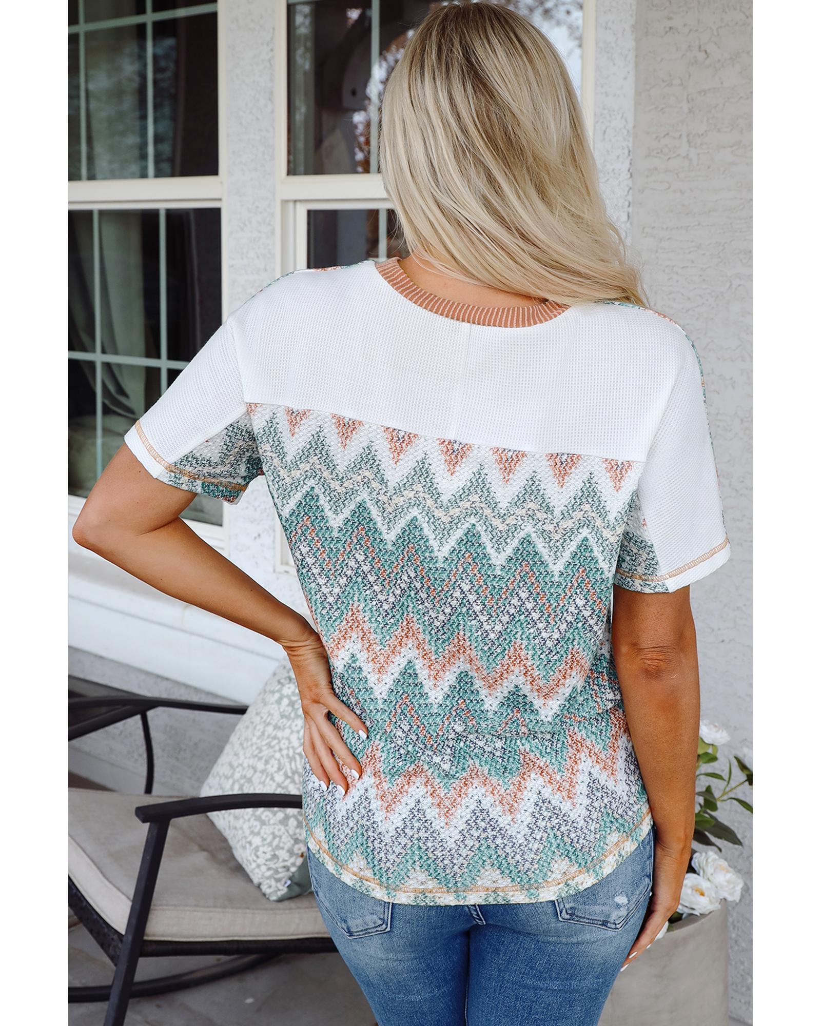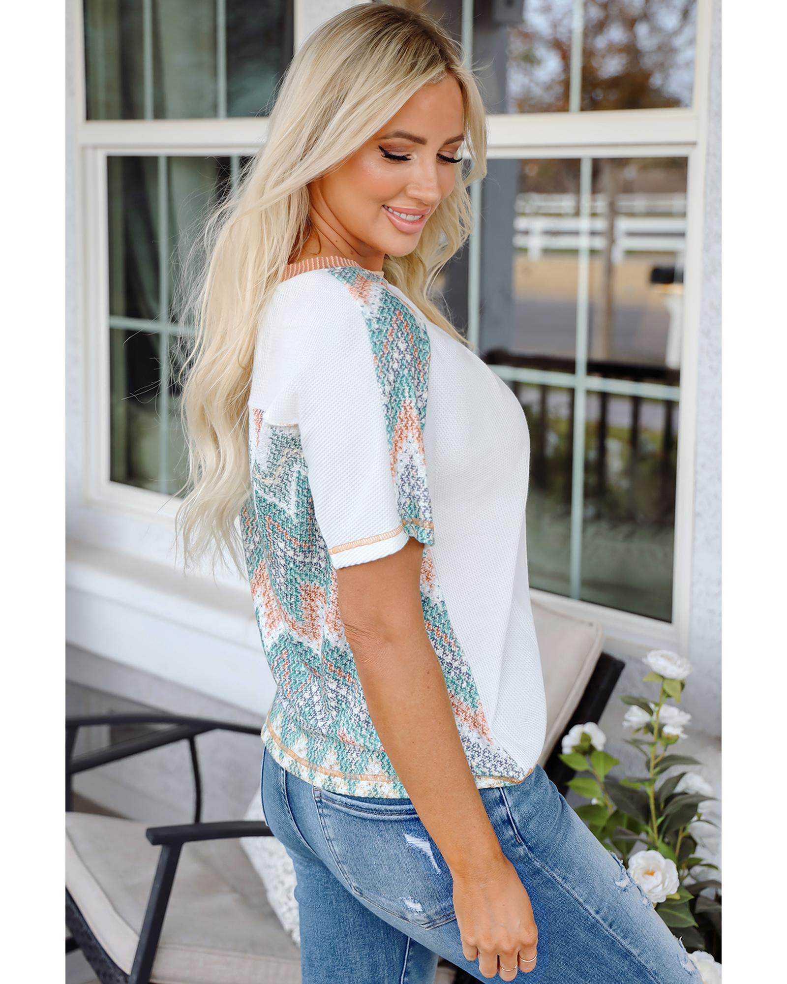 White Chevron Patchwork Raglan Sleeve Knitted T Shirt – S