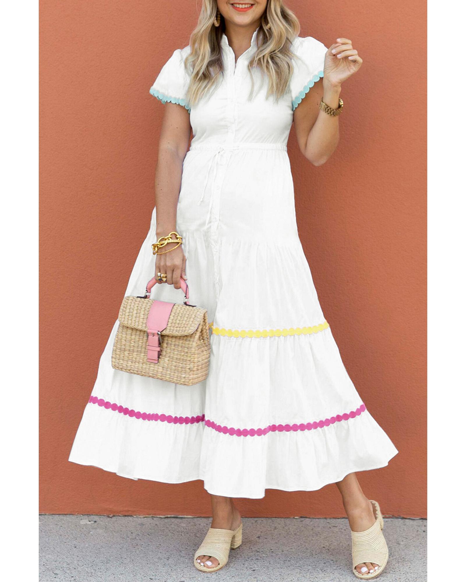 • White Colorblock Rickrack Trim Short Sleeve Drawstring Waist Long Dress
