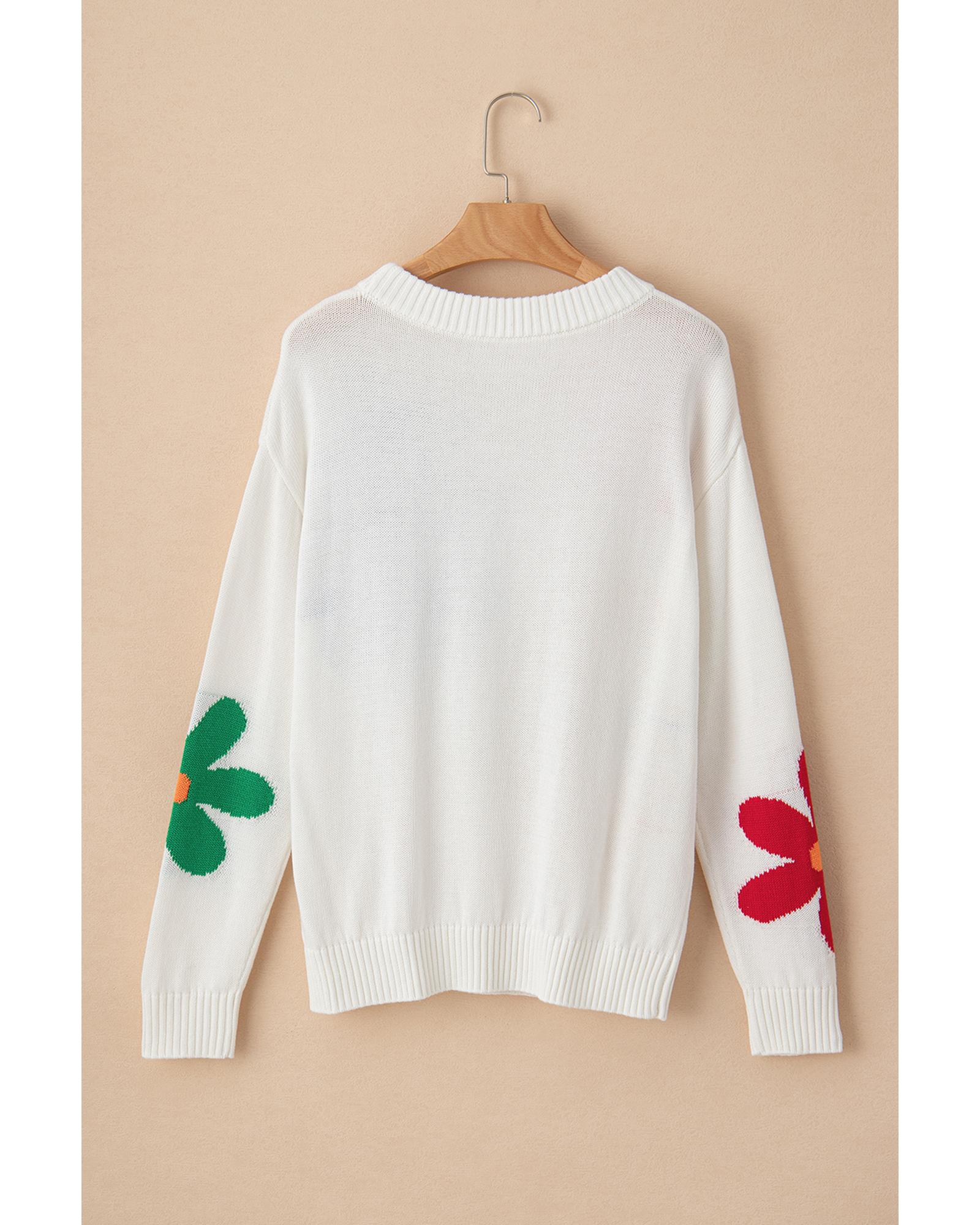 White Colorful Big Flower Pattern Crewneck Sweater – S