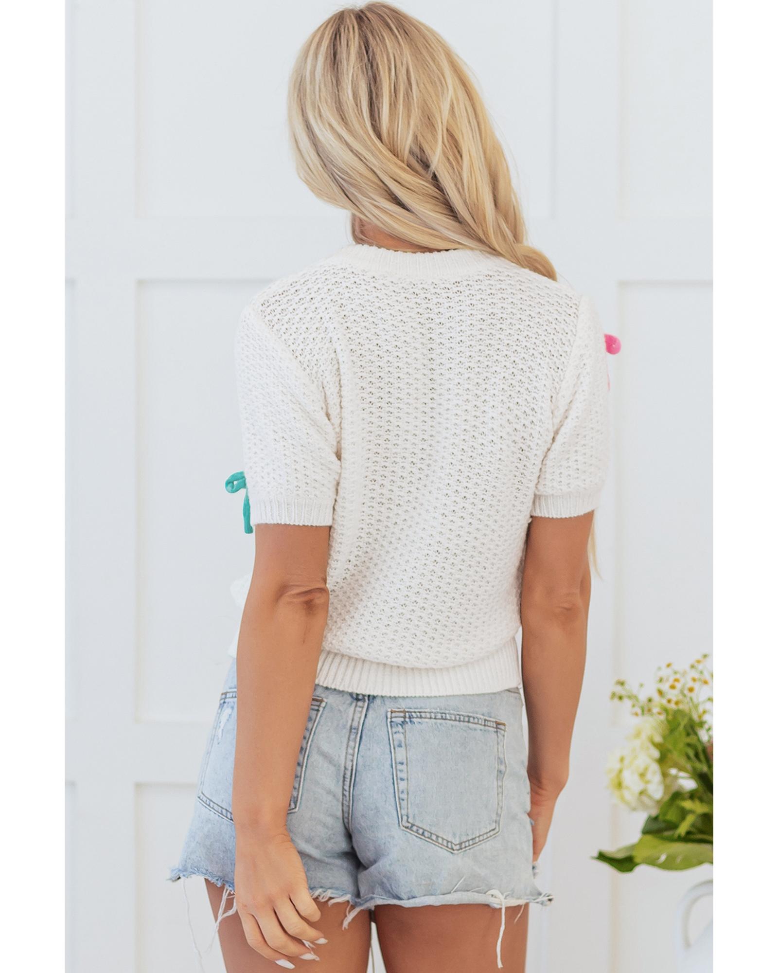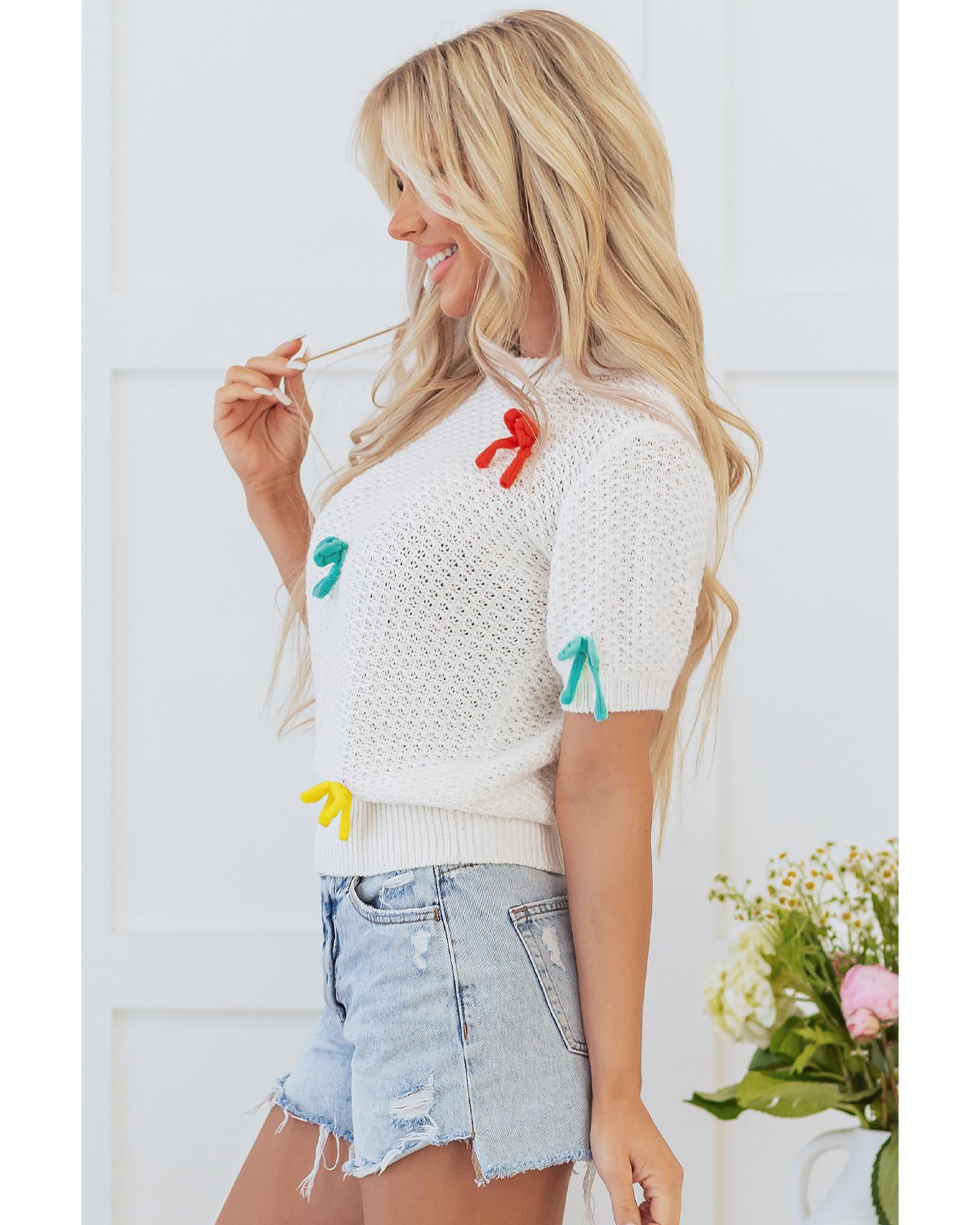White Colorful Bow Knit Mock Neck Short Sleeve Sweater – XL