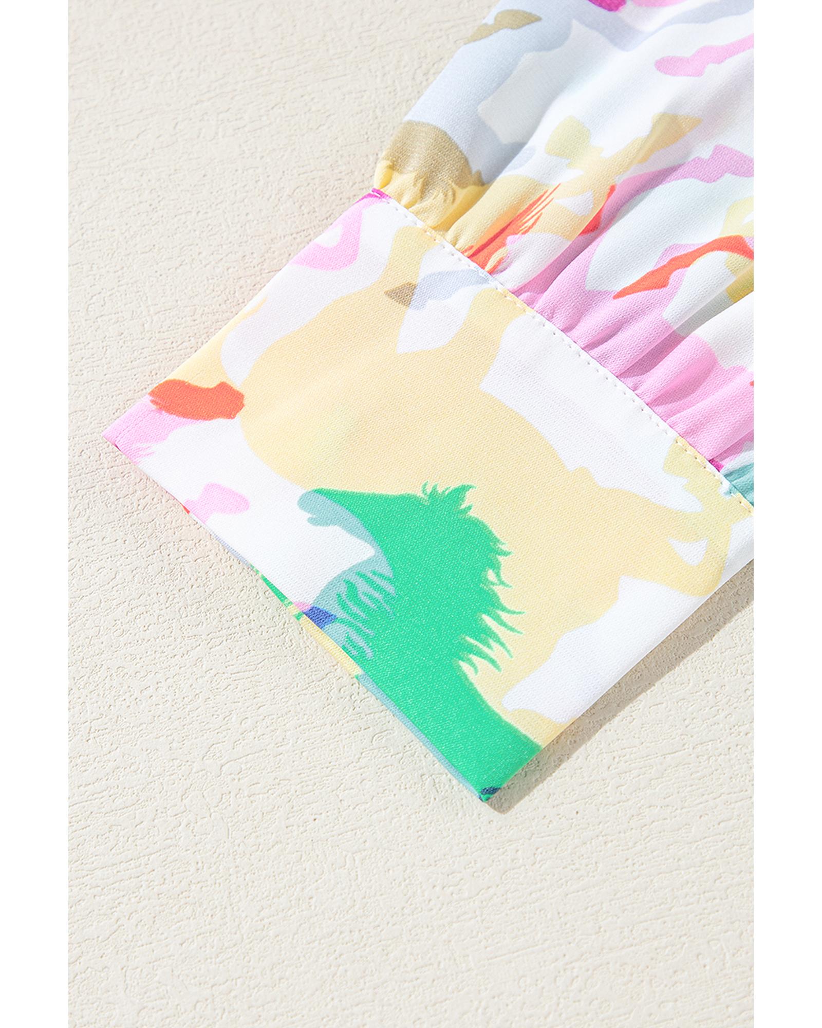 White Colorful Horse Printed Long Sleeve Button Up Casual Shirt – M