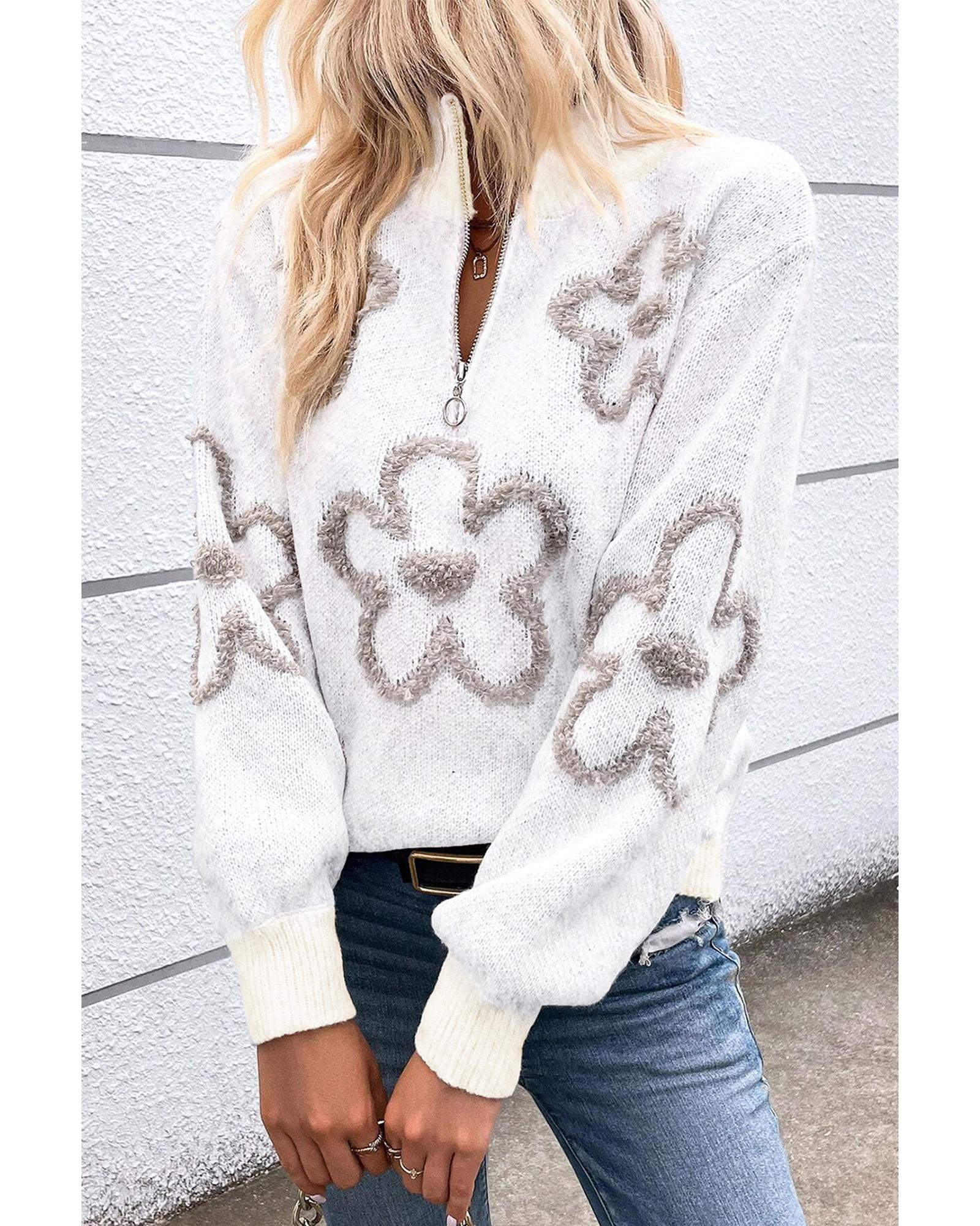 White Contrast Flower Half Zipper Stand Neck Sweater – 2XL