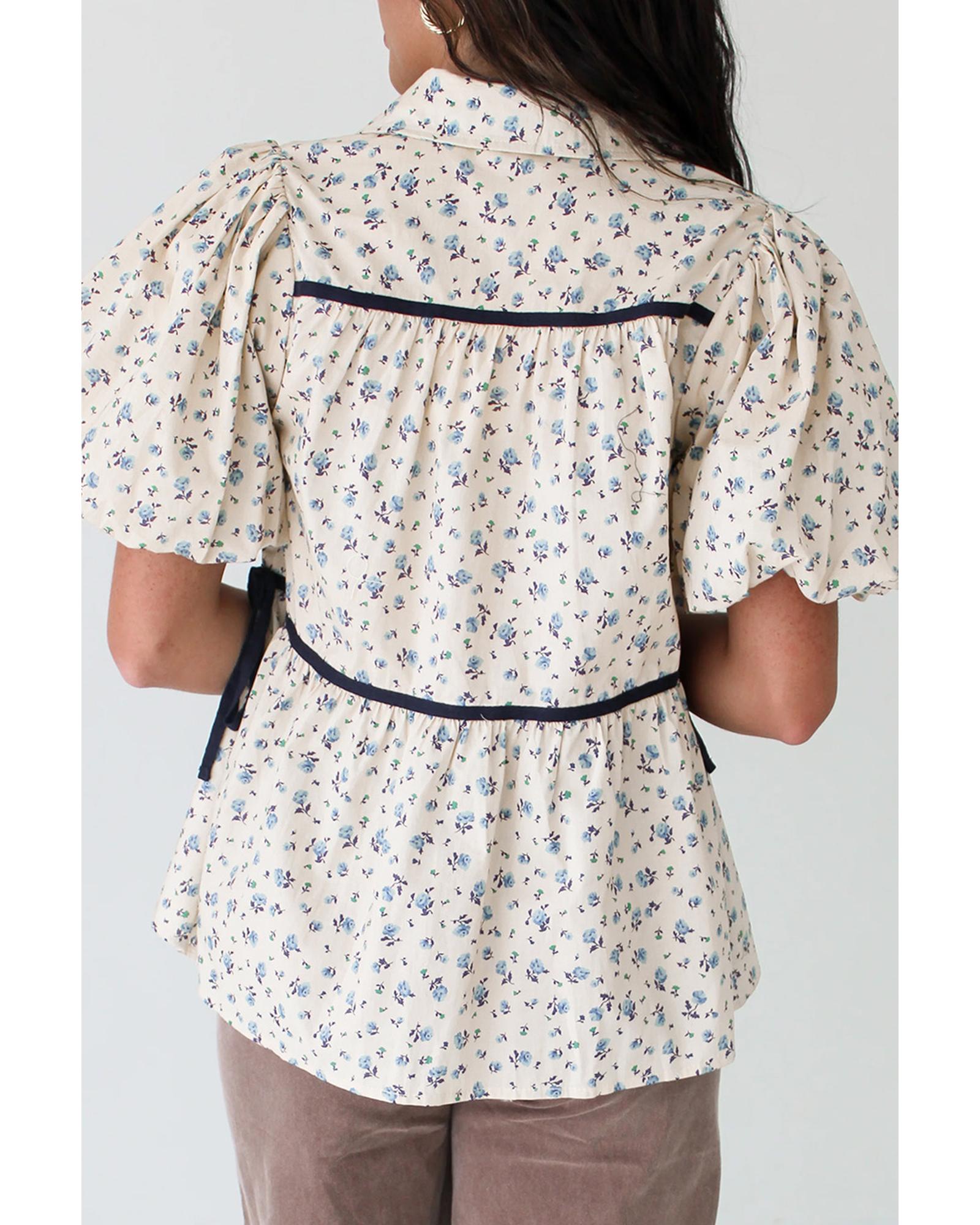 White Contrast Trim Floral Puff Short Sleeve Shirt – M