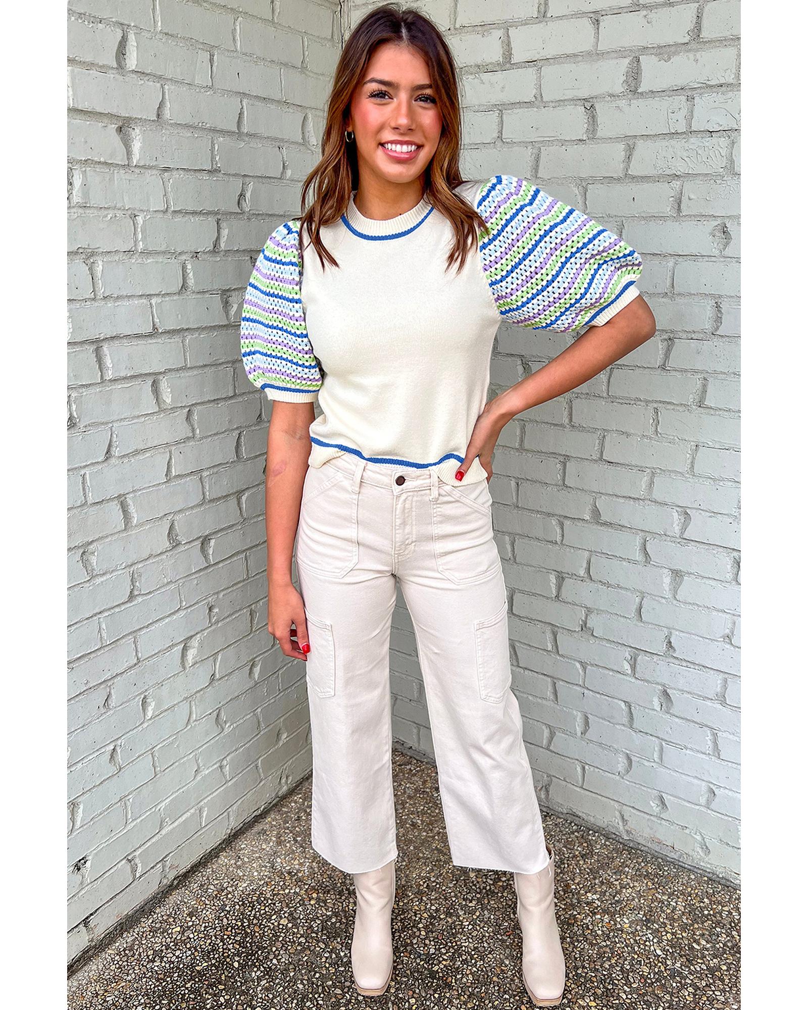 White Crochet Striped Bubble Sleeve Knit Sweater – L