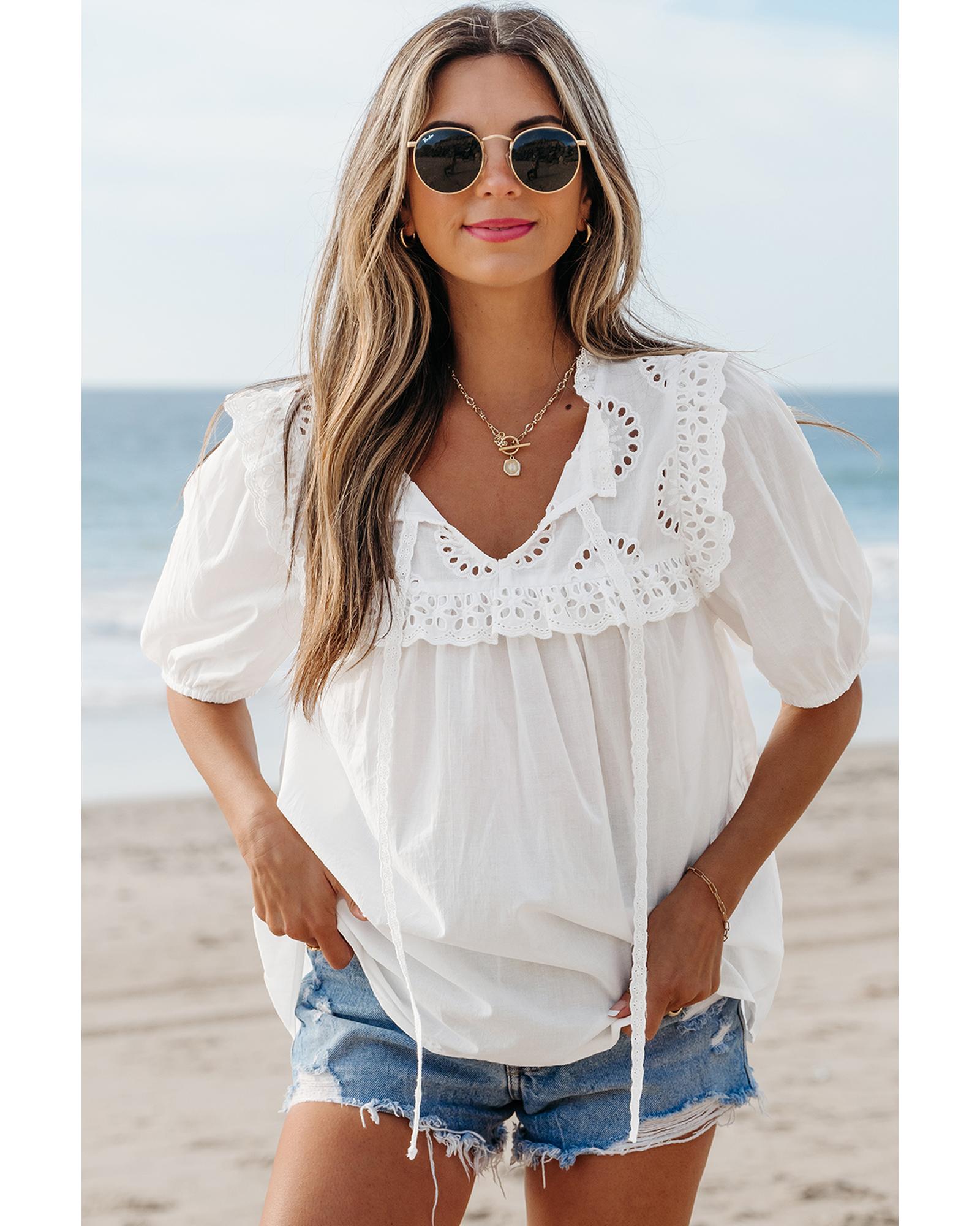 White Embroidered Lace Patchwork Tie Neck Puff Short Sleeve Blouse – M