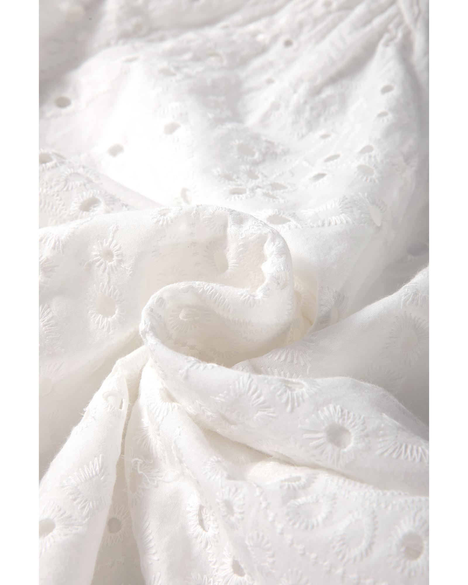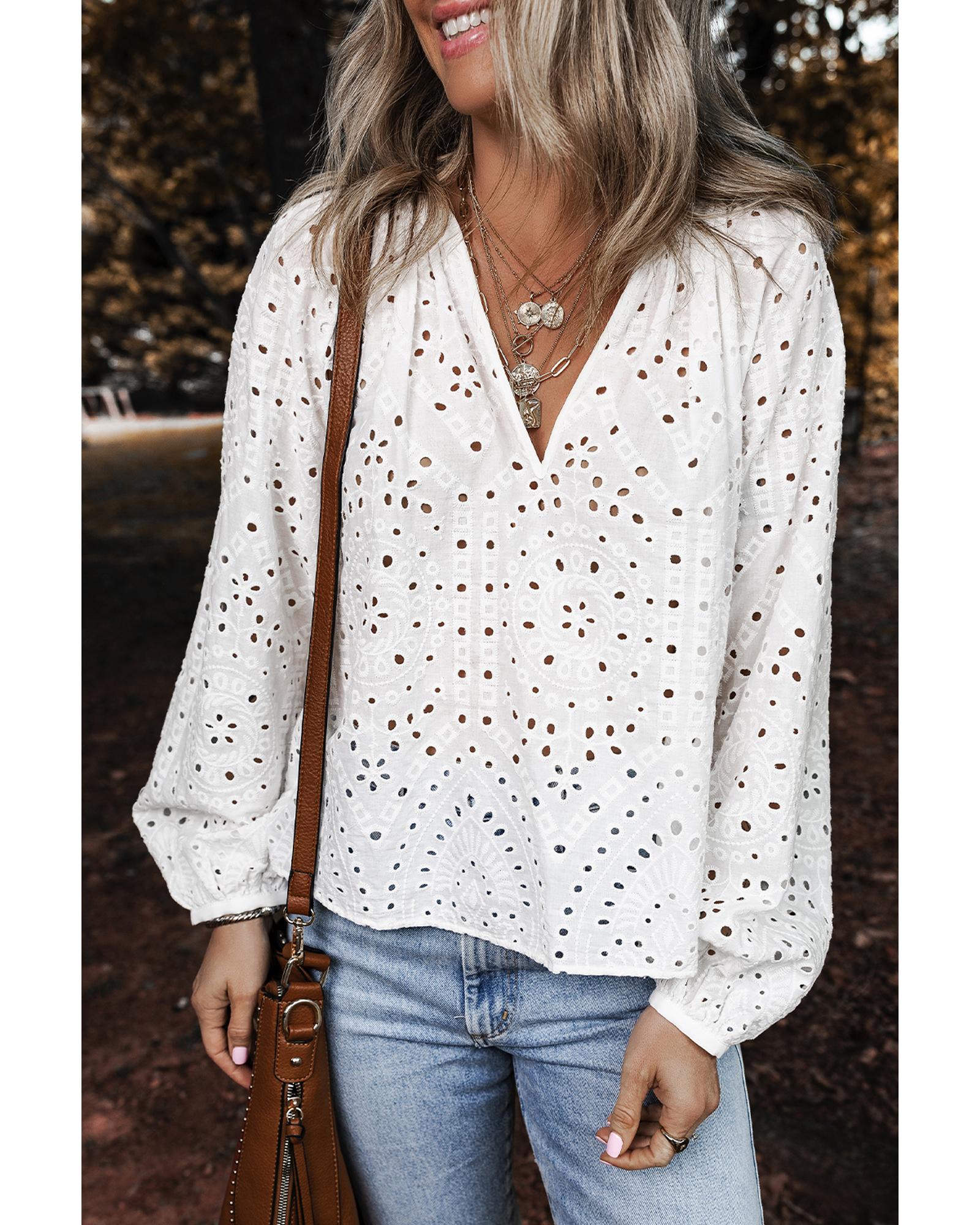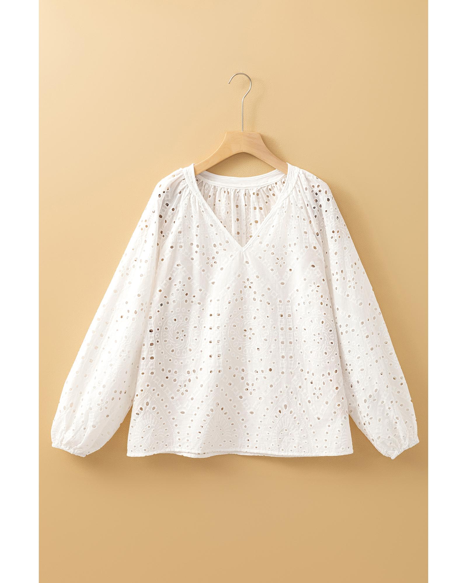White Eyelet Embroidered Puff Sleeve V Neck Blouse – S