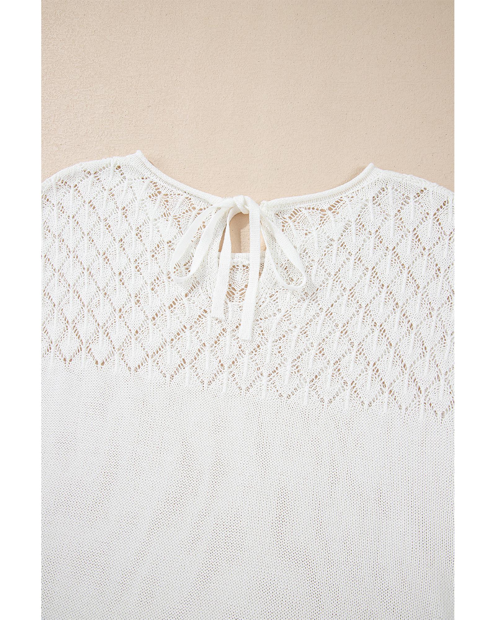 White Eyelet Knit Tied Back Short Sleeve Sweater – 2XL