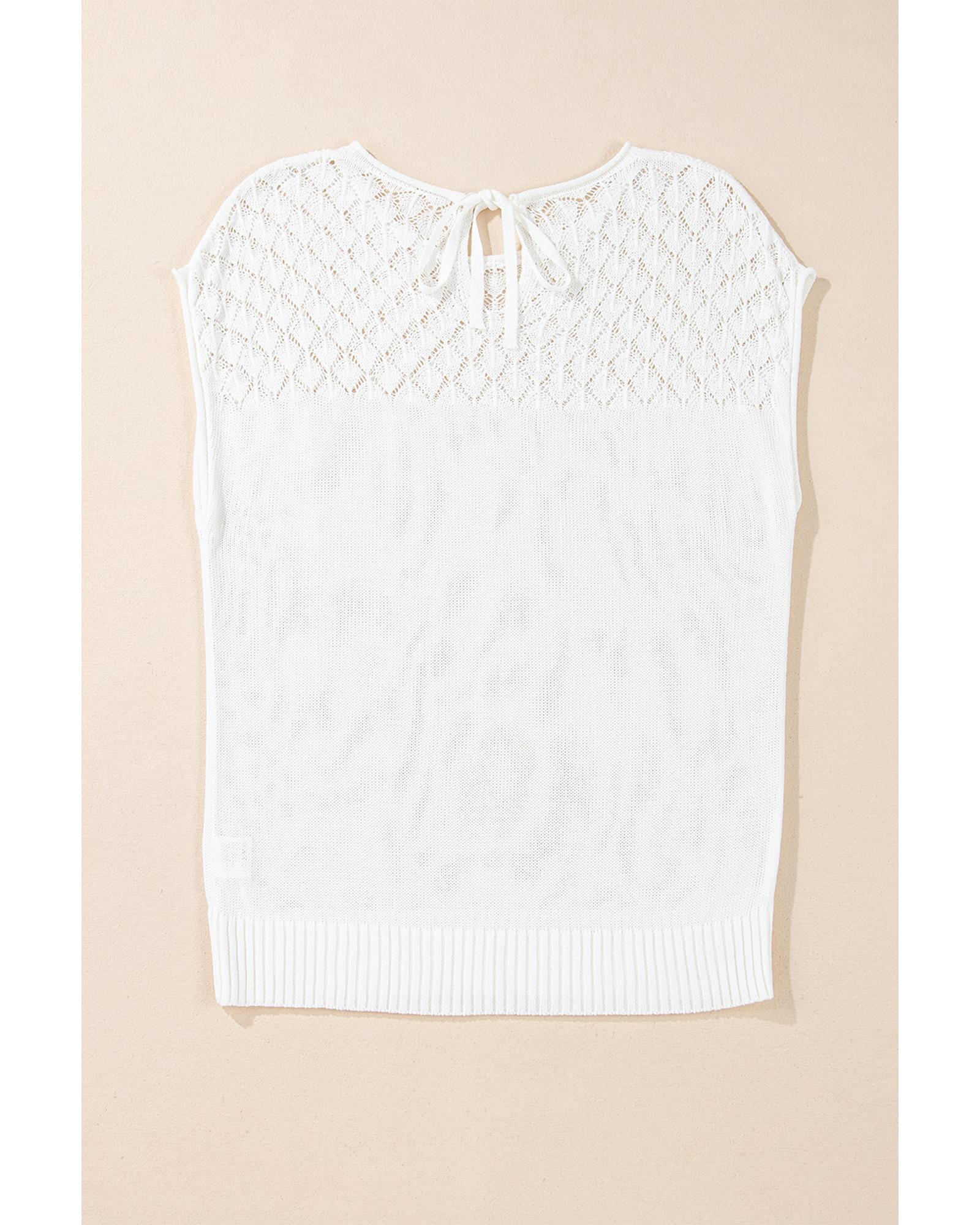 White Eyelet Knit Tied Back Short Sleeve Sweater – S