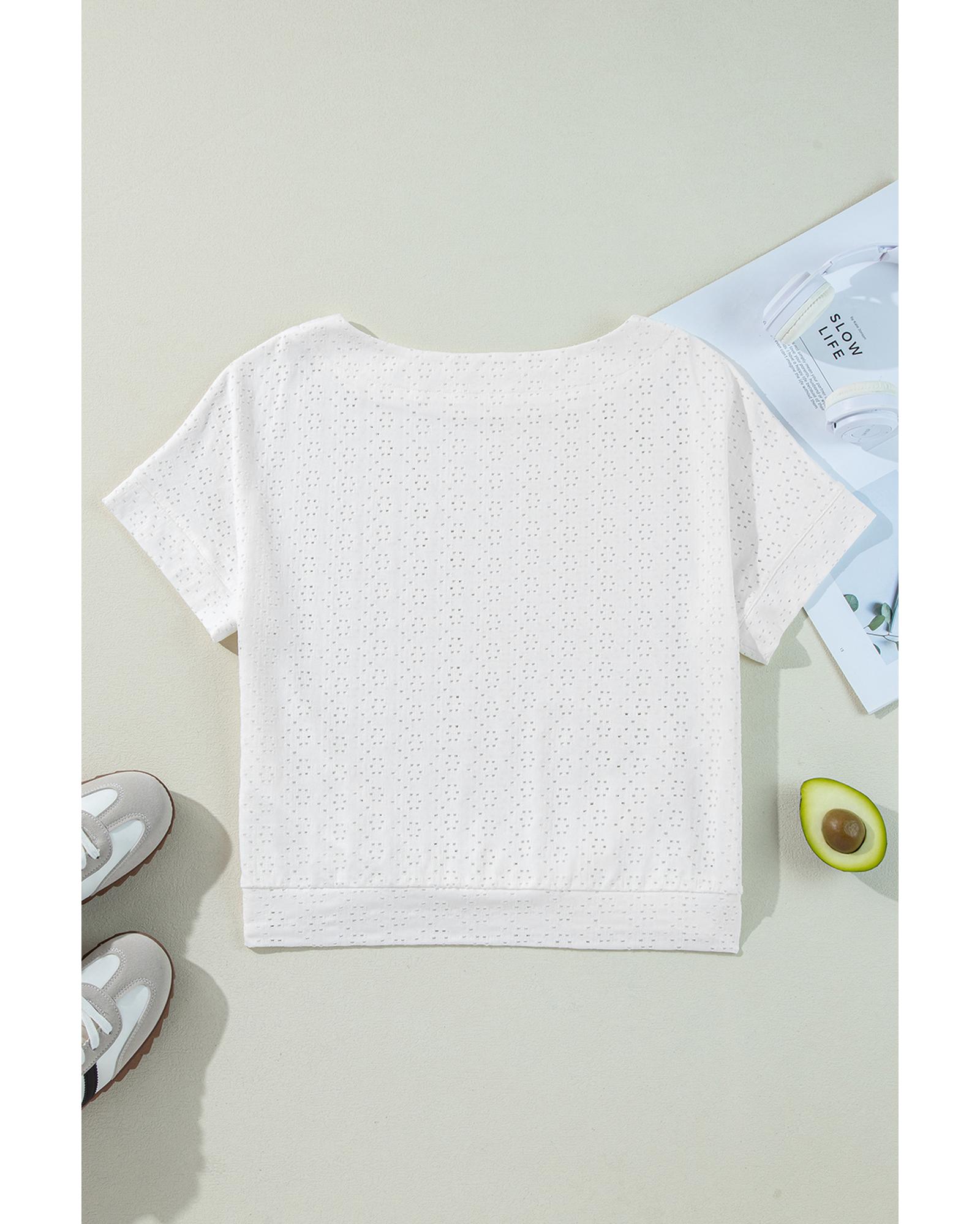 White Eyelet Pattern Boat Neck Casual Tee – L