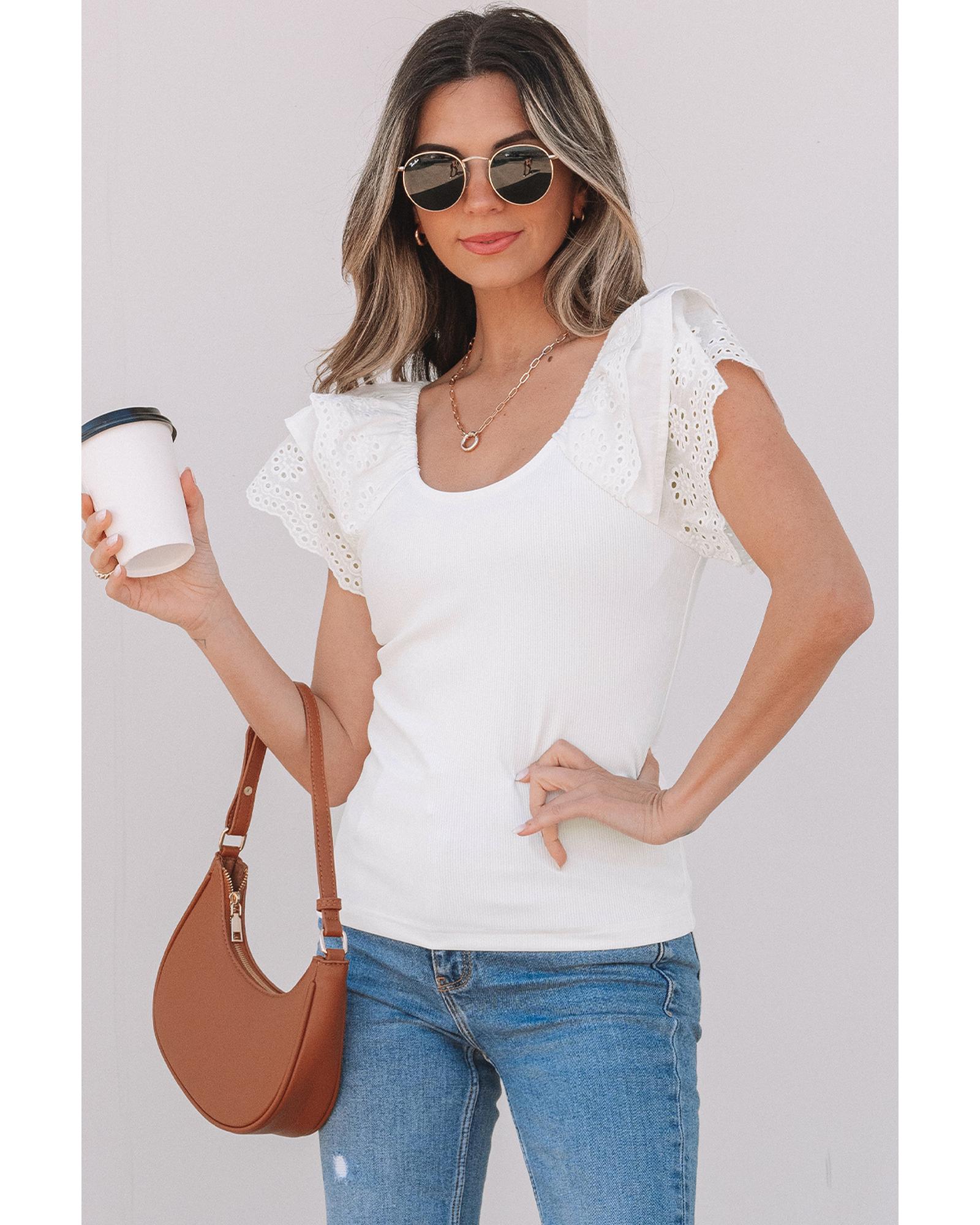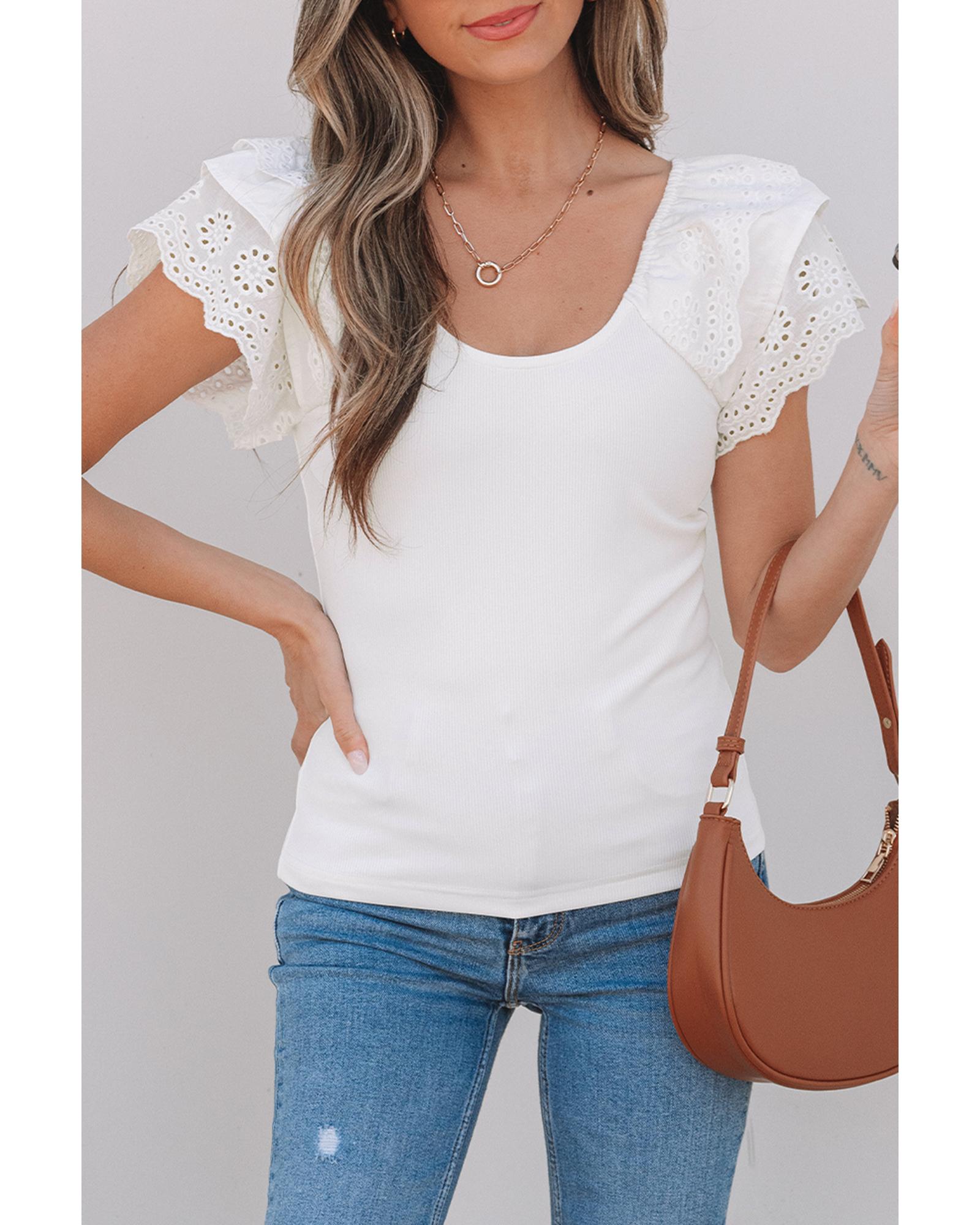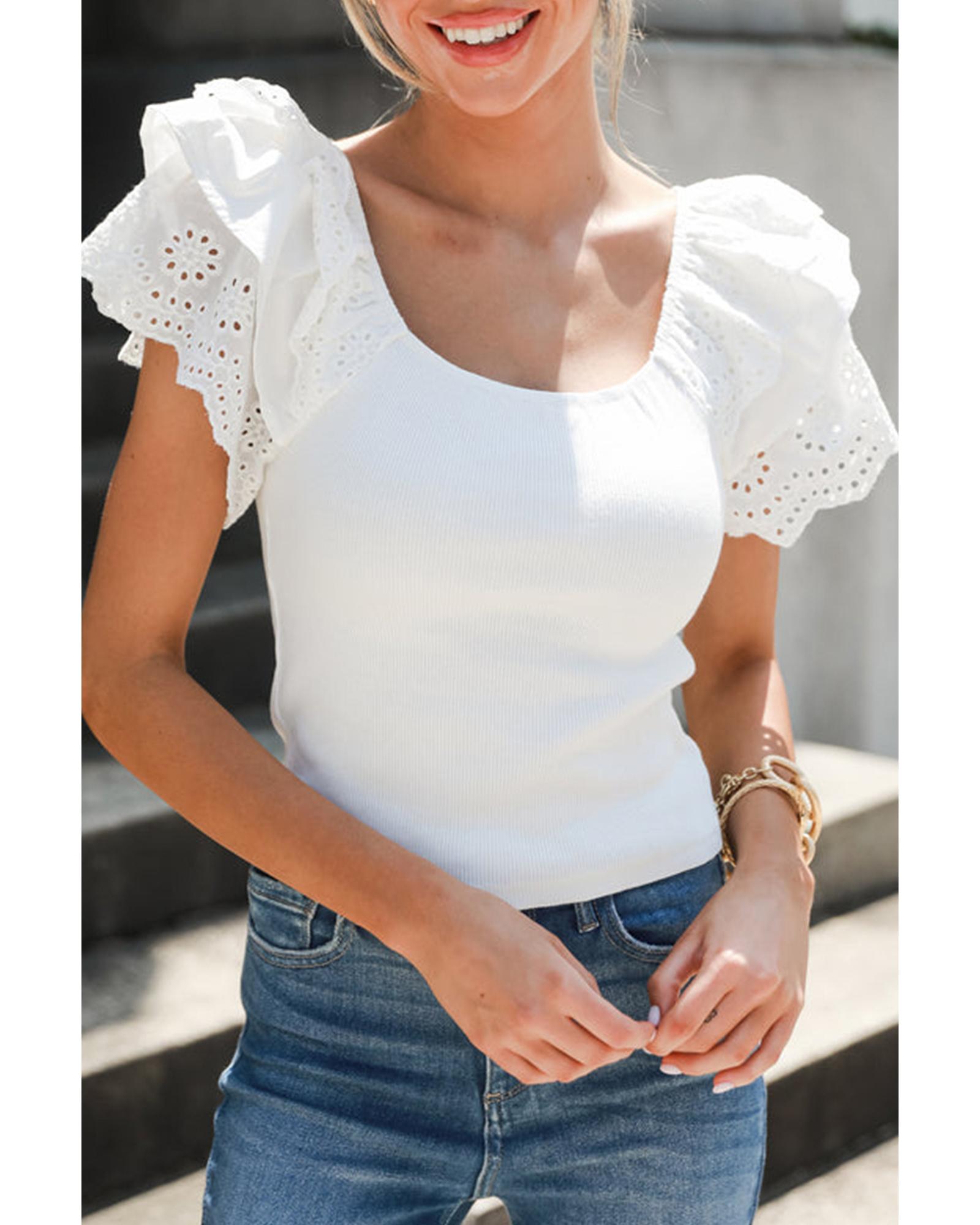- White top with eyelet ruffle sleeve detailing