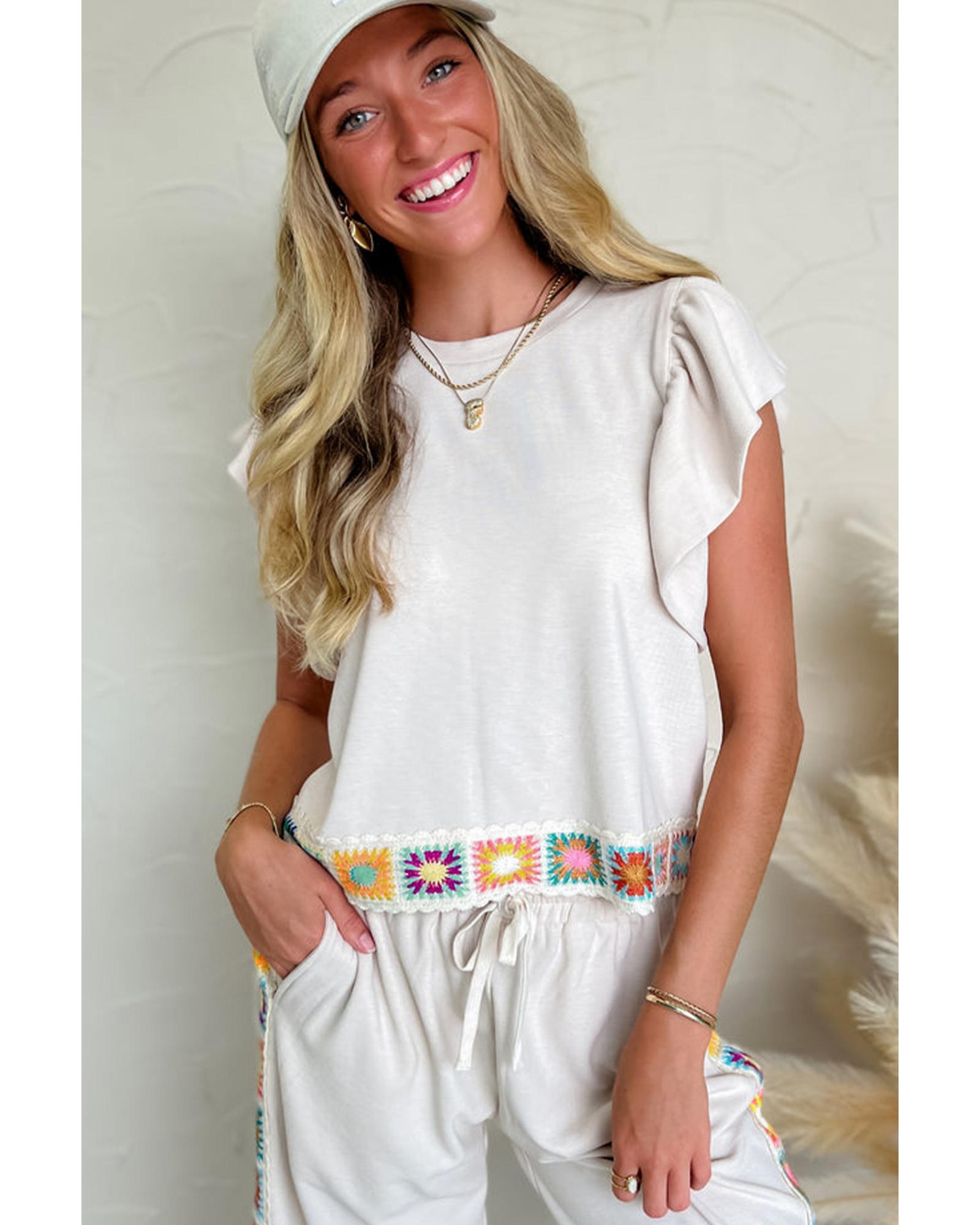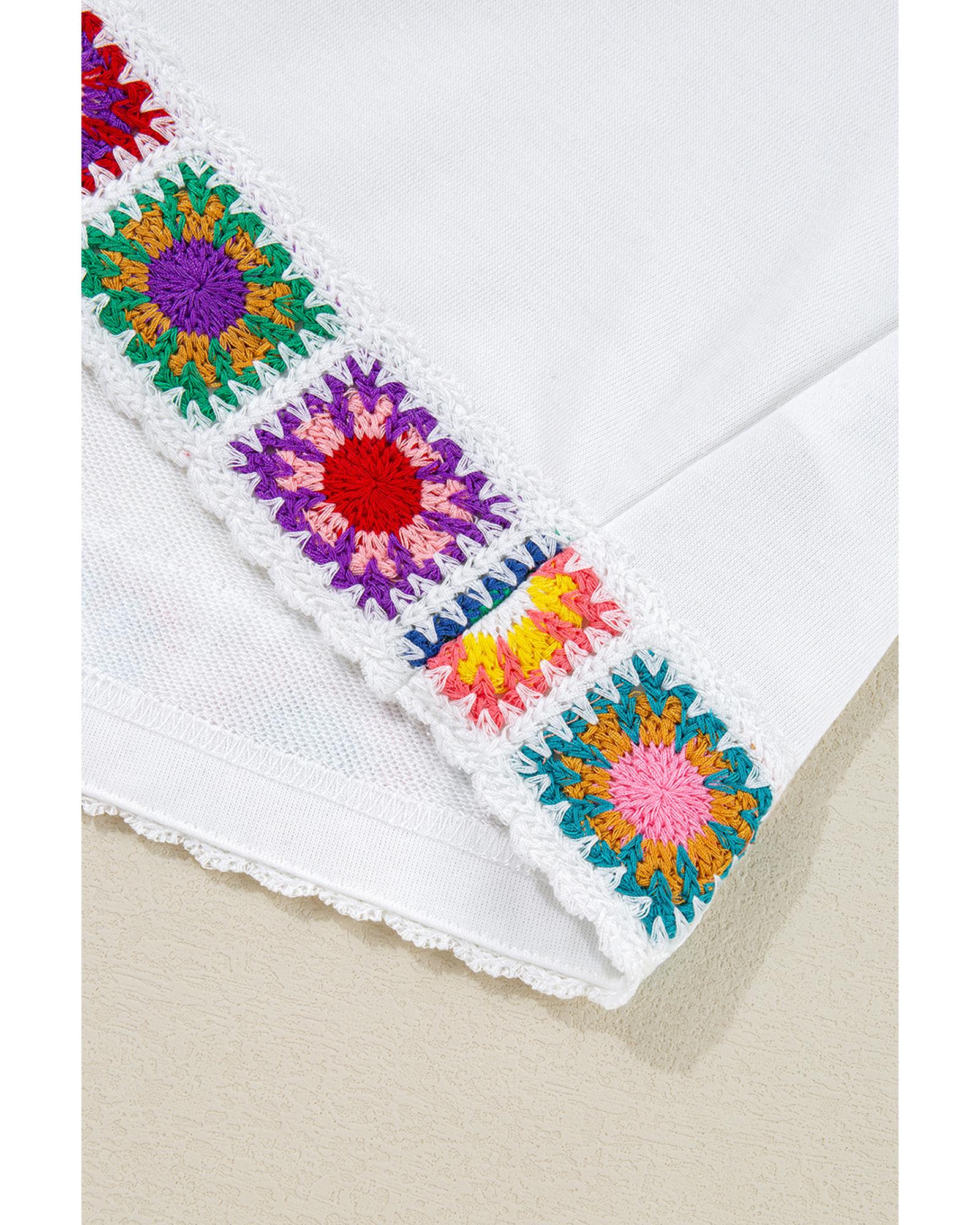 White Floral Crochet Patched Ruffled Sleeve Crewneck Blouse – M