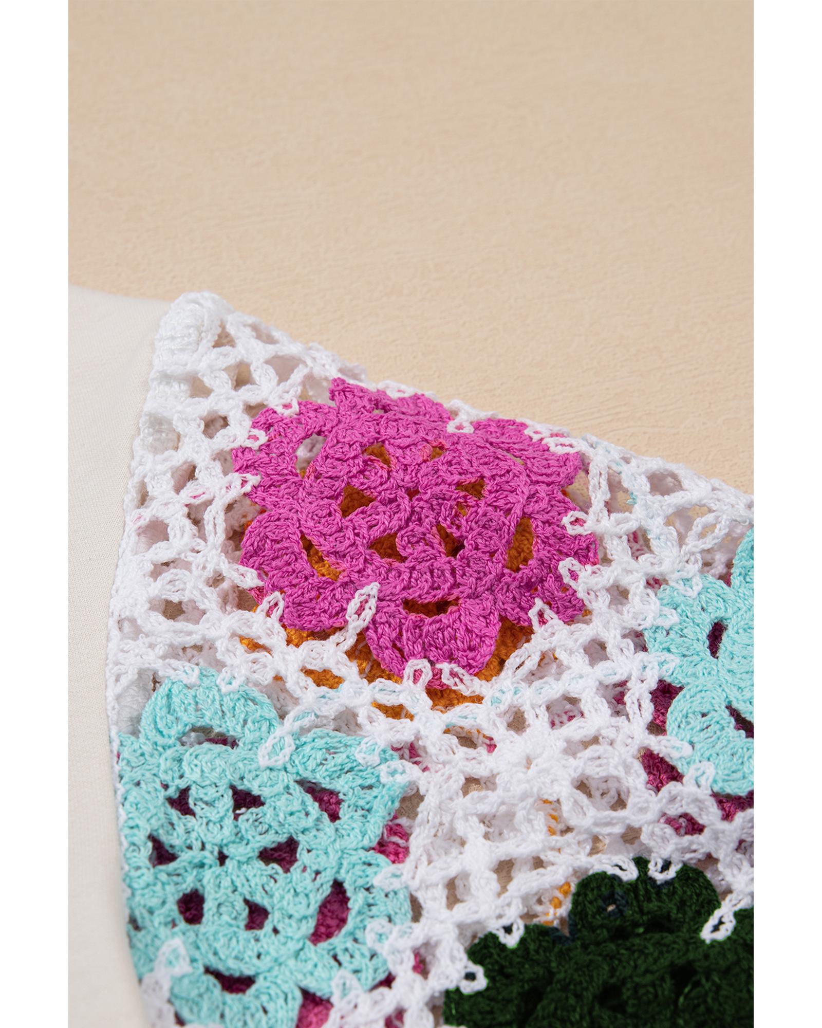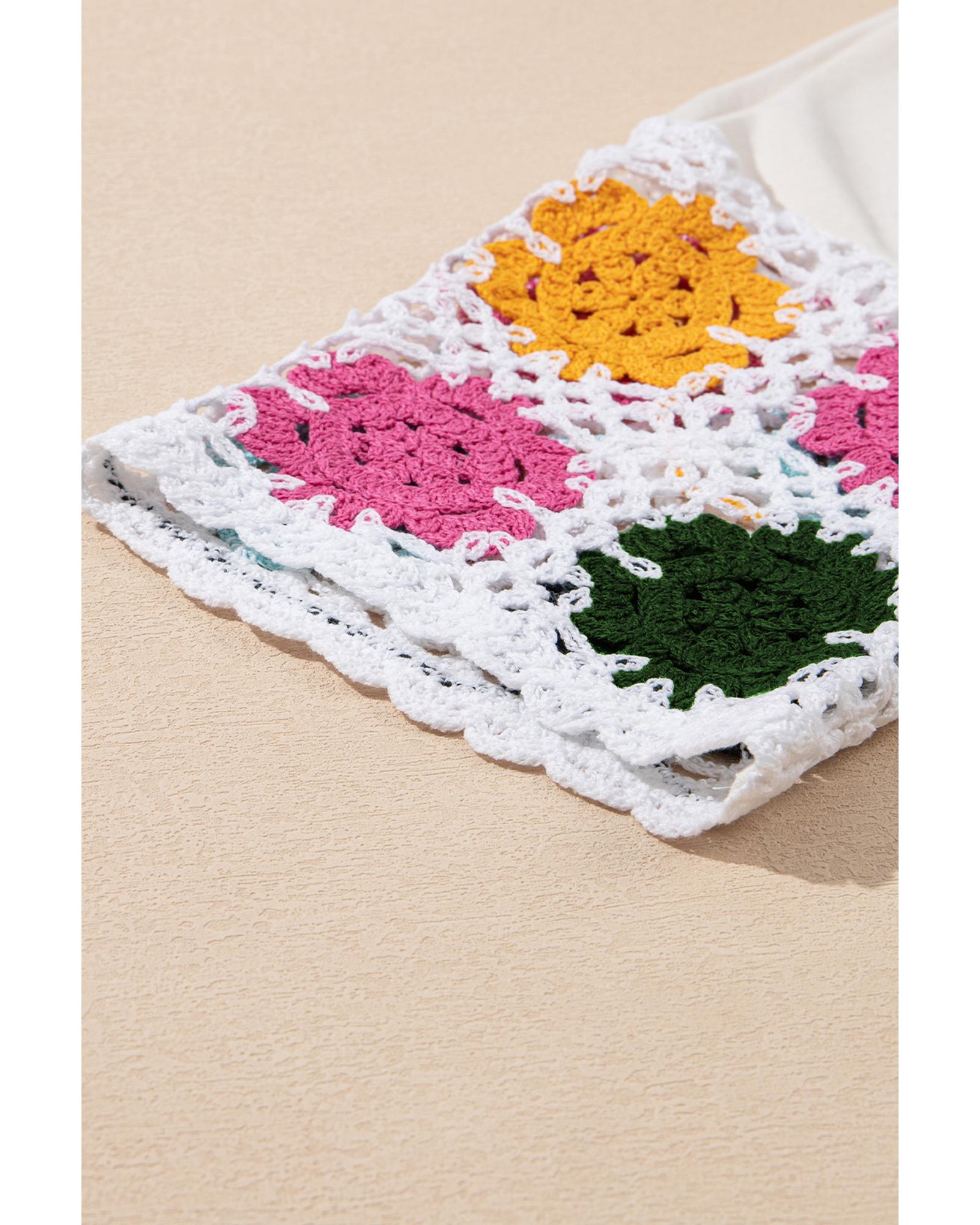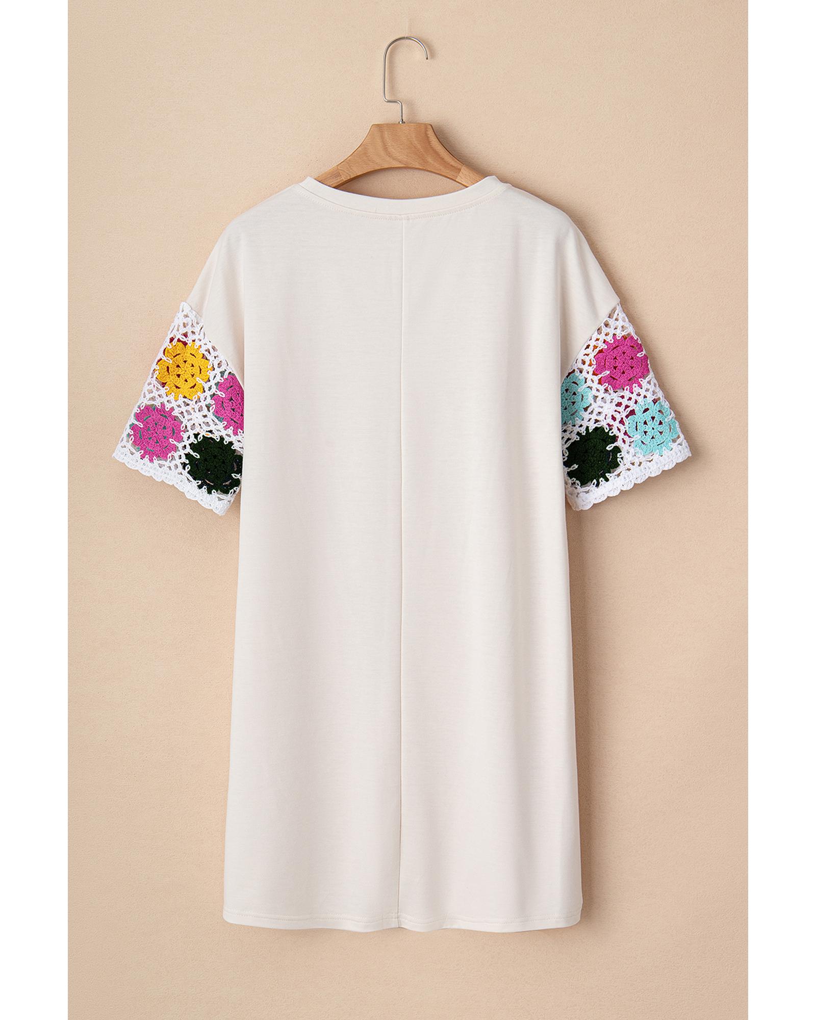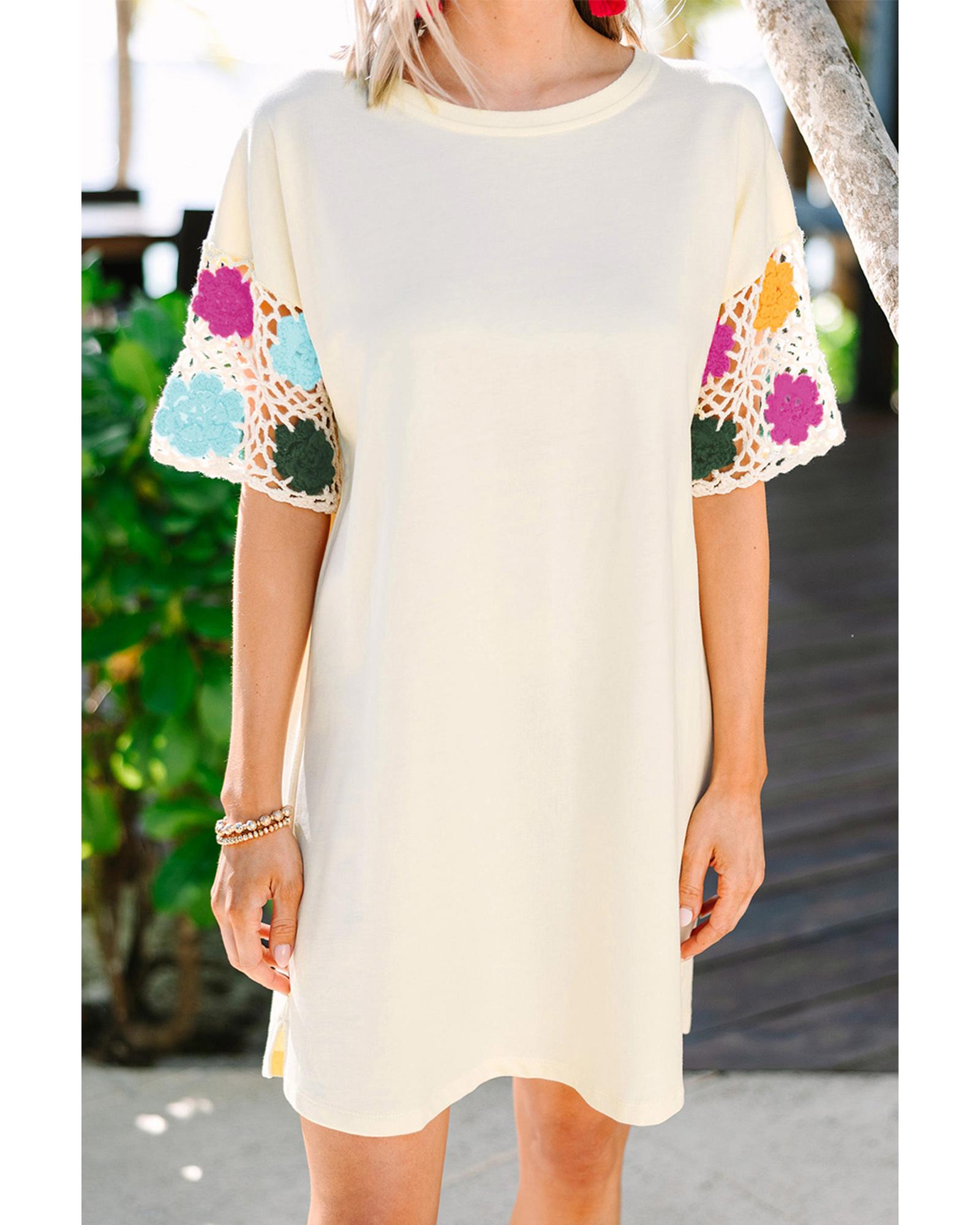 White Floral Crochet Splicing Sleeve T Shirt Dress – M