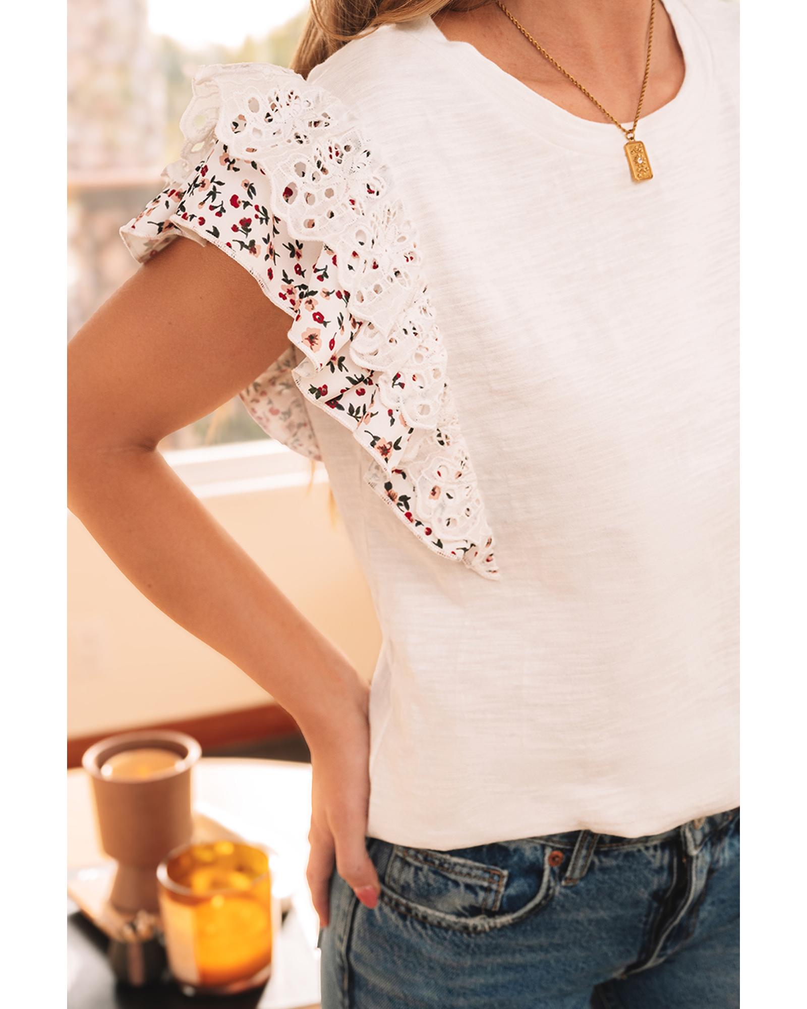 White Floral Lace Eyelet Patched Butterfly Sleeve Blouse – XL