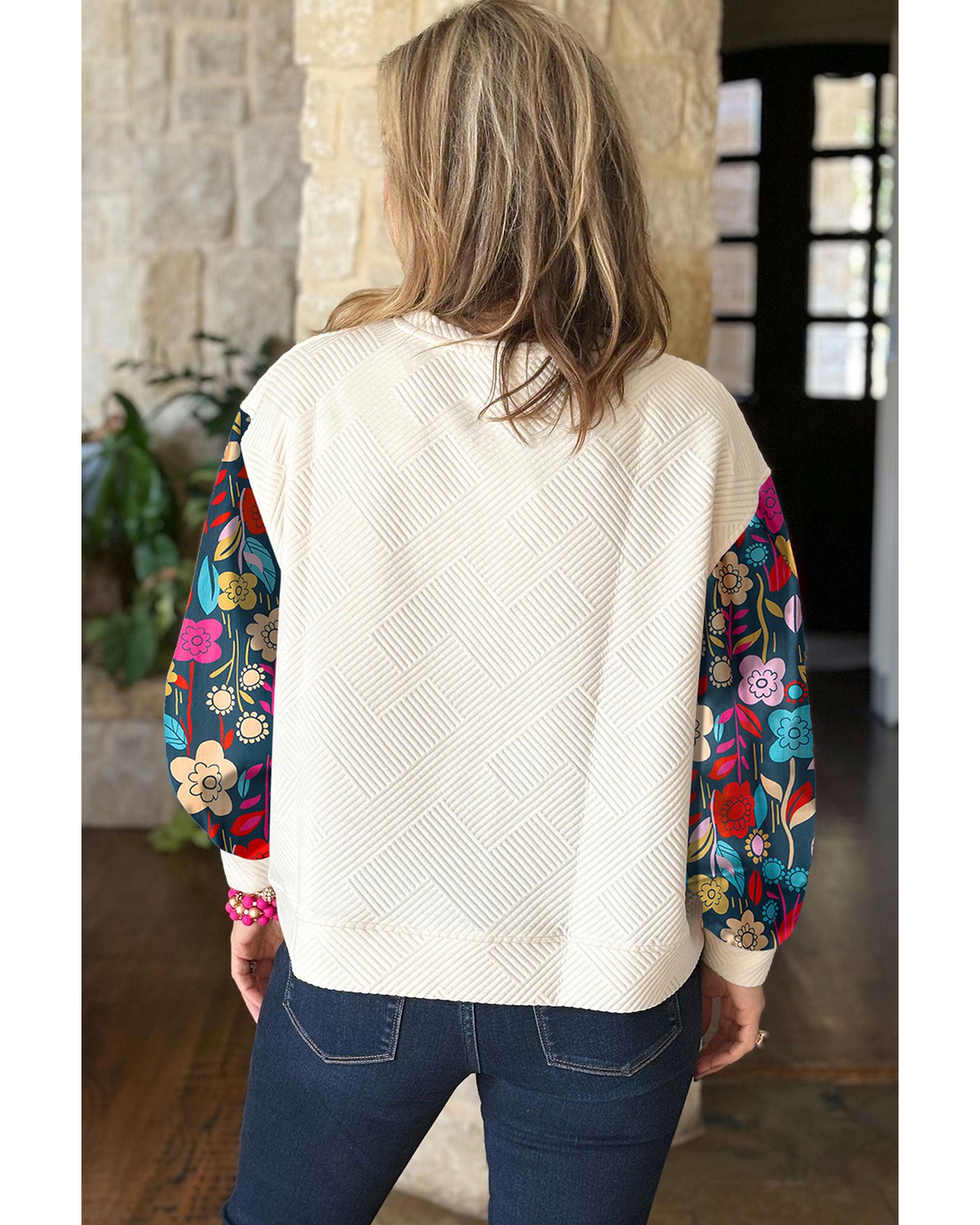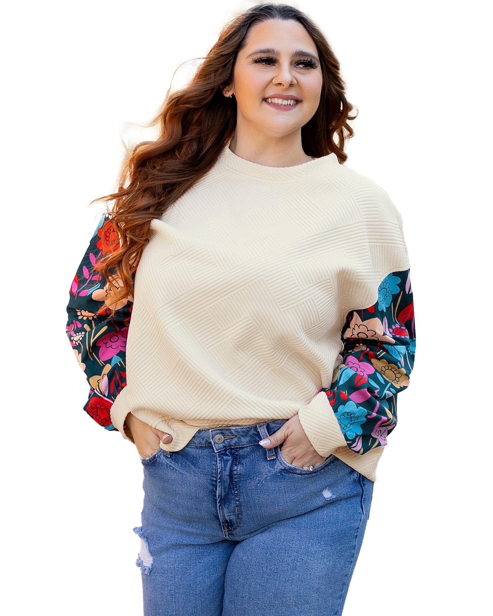 • White Floral Patchwork Sleeve Textured Plus Size Pullover Top