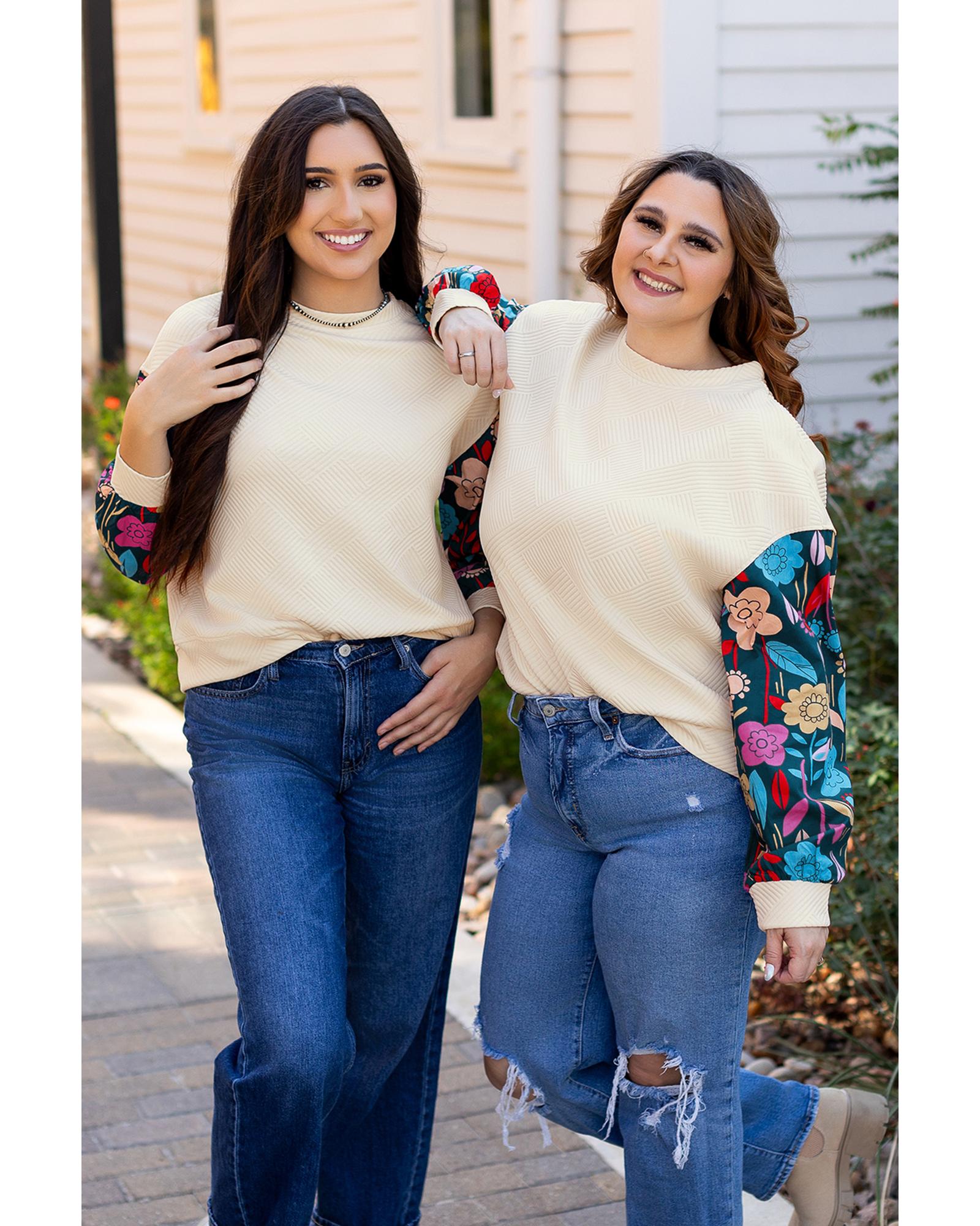 White Floral Patchwork Sleeve Textured Plus Size Pullover Top - 2X Original price was: $60.99.Current price is: $32.99.