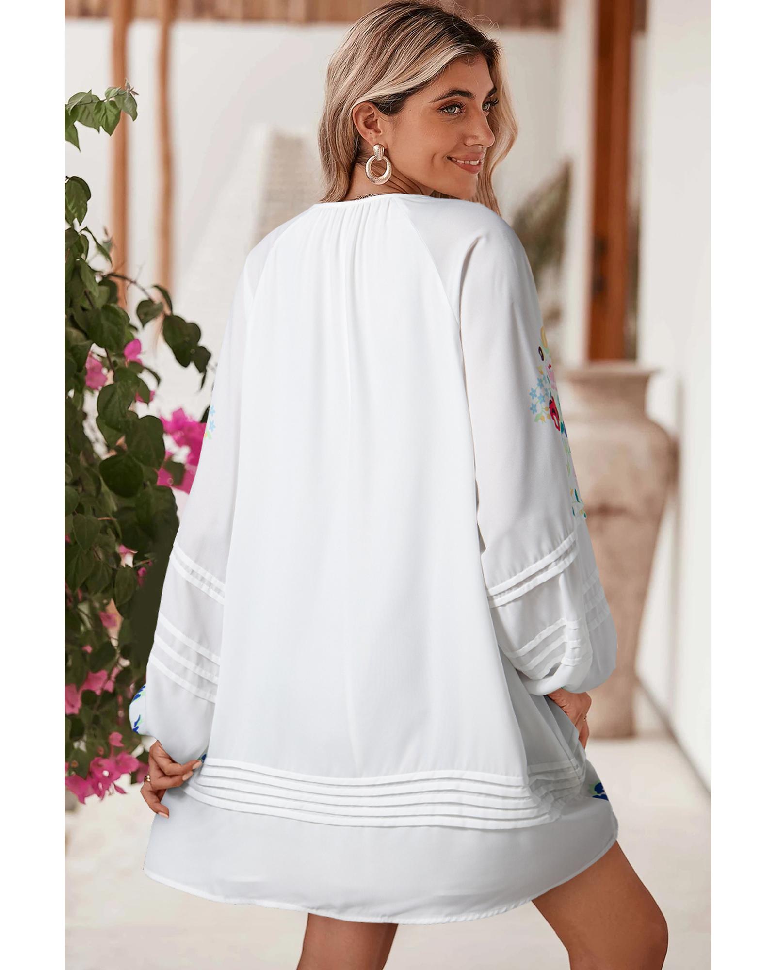 White Floral Print Boho Tassel Tie Split Neck Tucking Detail Puff Sleeve Mini Dress – XL