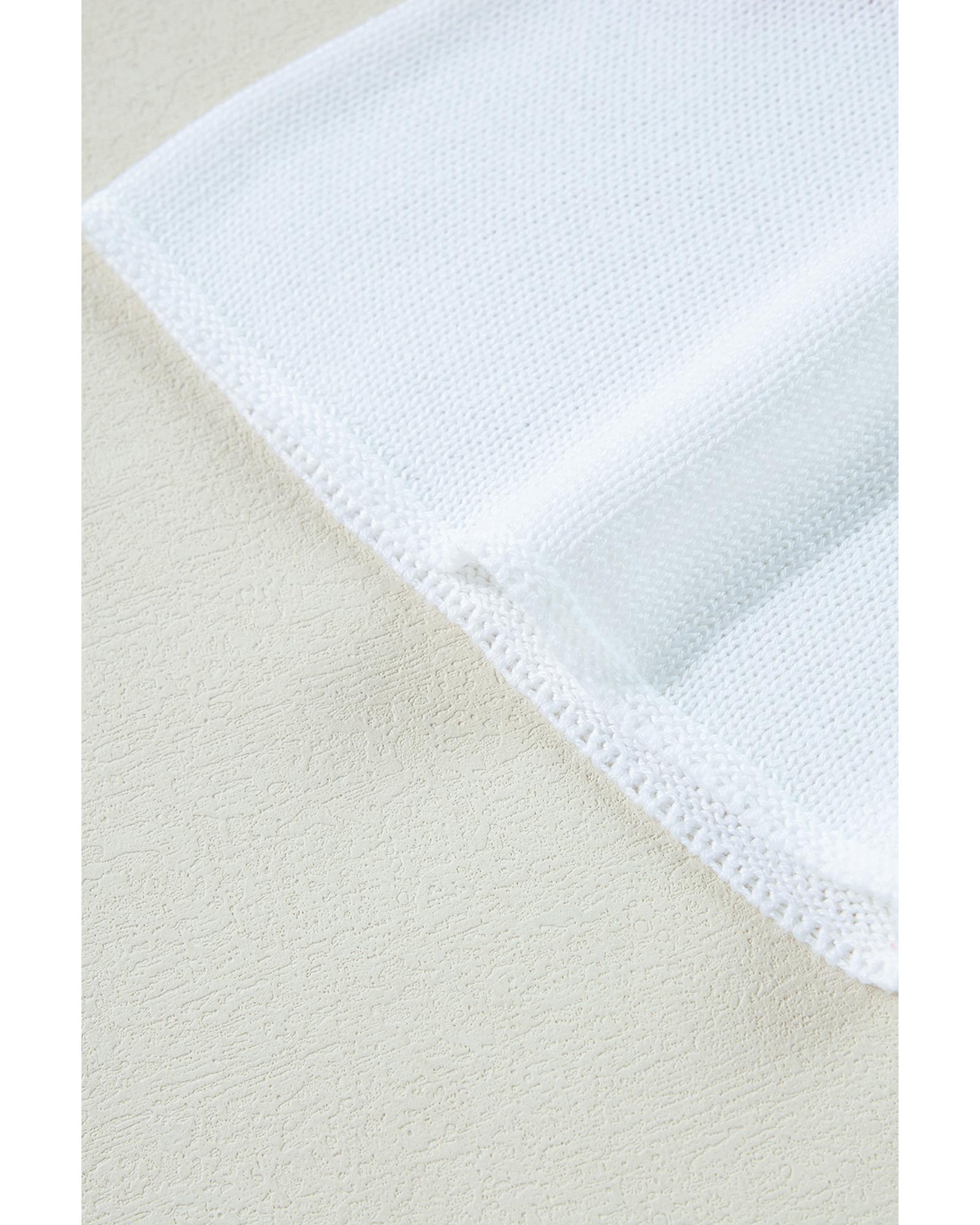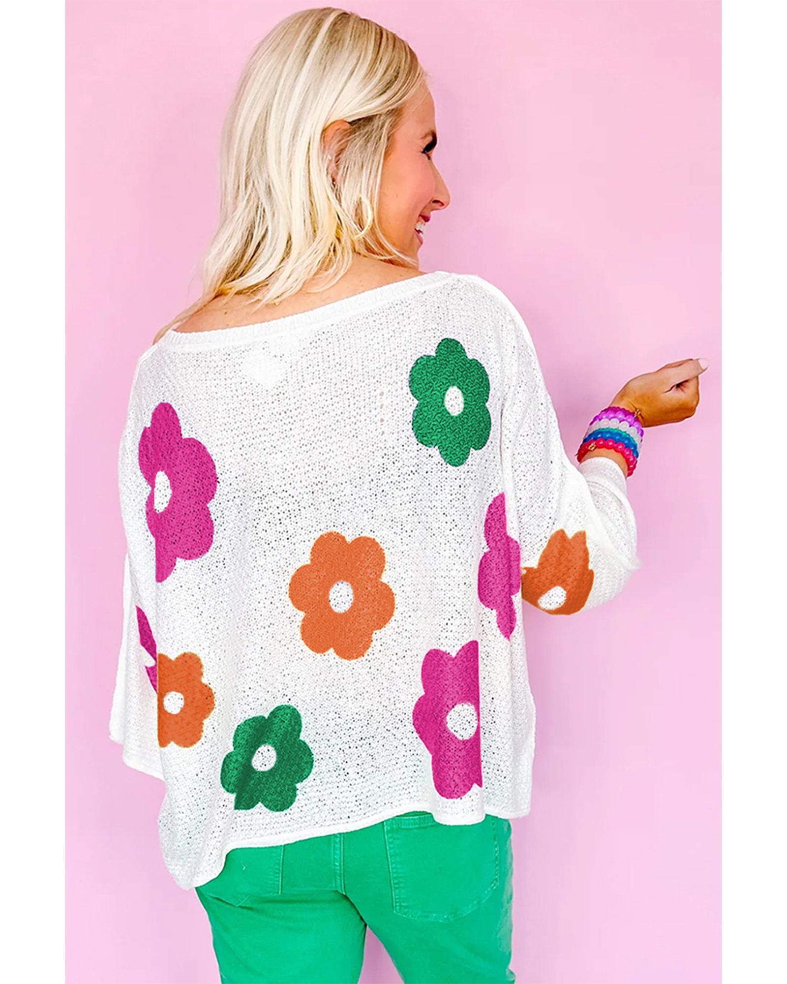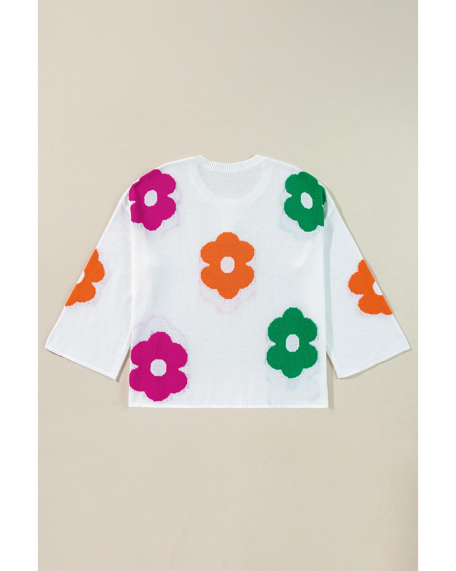 White Floral Print Buttoned Loose Lightweight Sweater – L