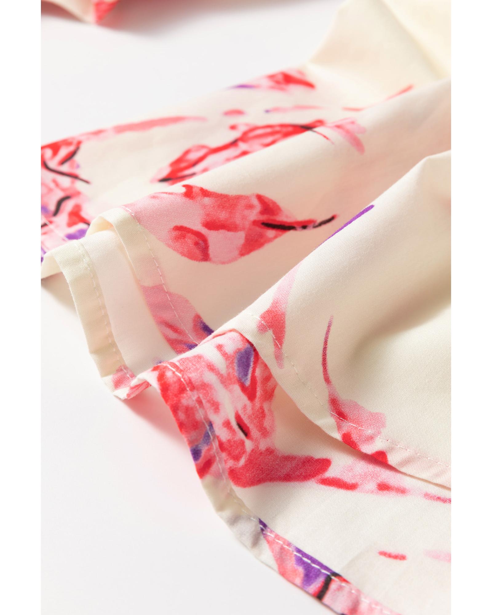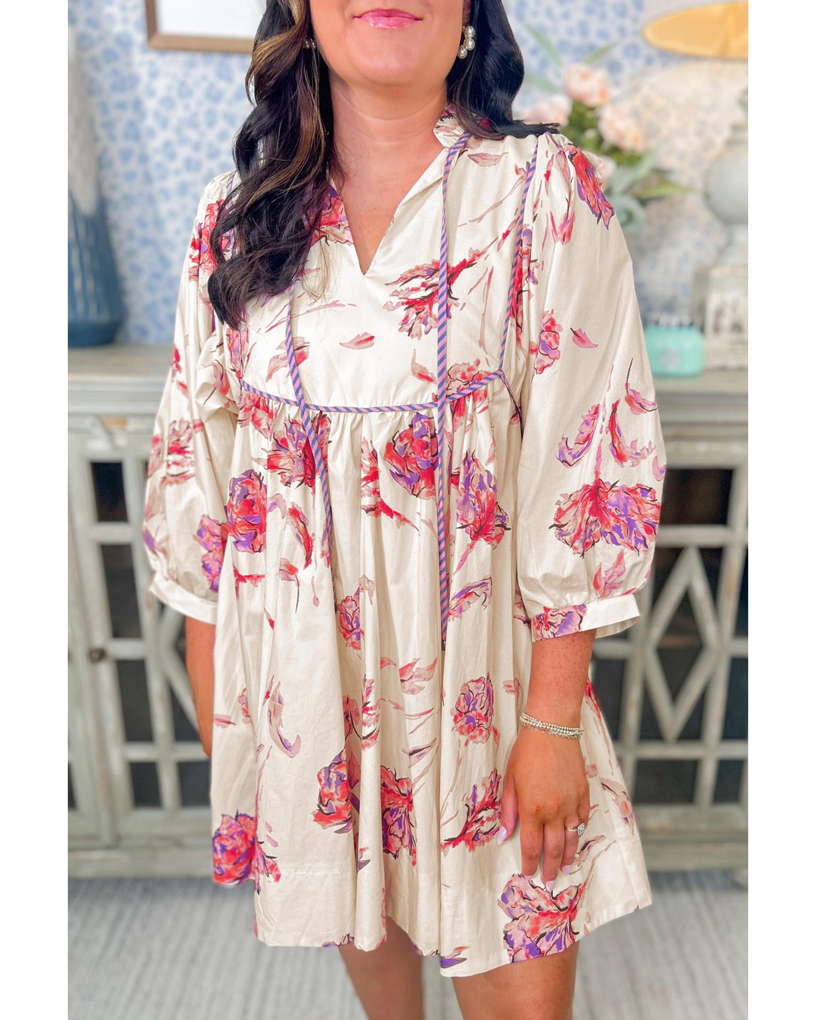 White Floral Print Lace up V Neck Balloon Sleeve Plus Size Shift Mini Dress – 2X