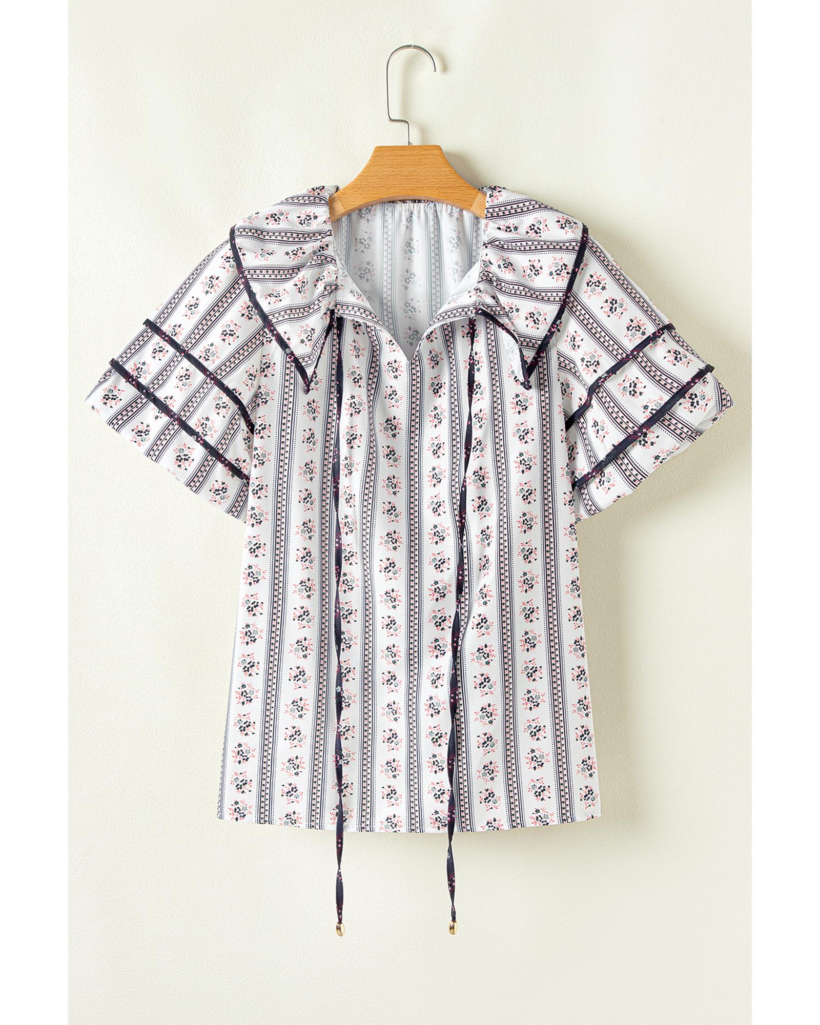 White Floral Ruffled Collar Short Puff Sleeve Printed Blouse – L
