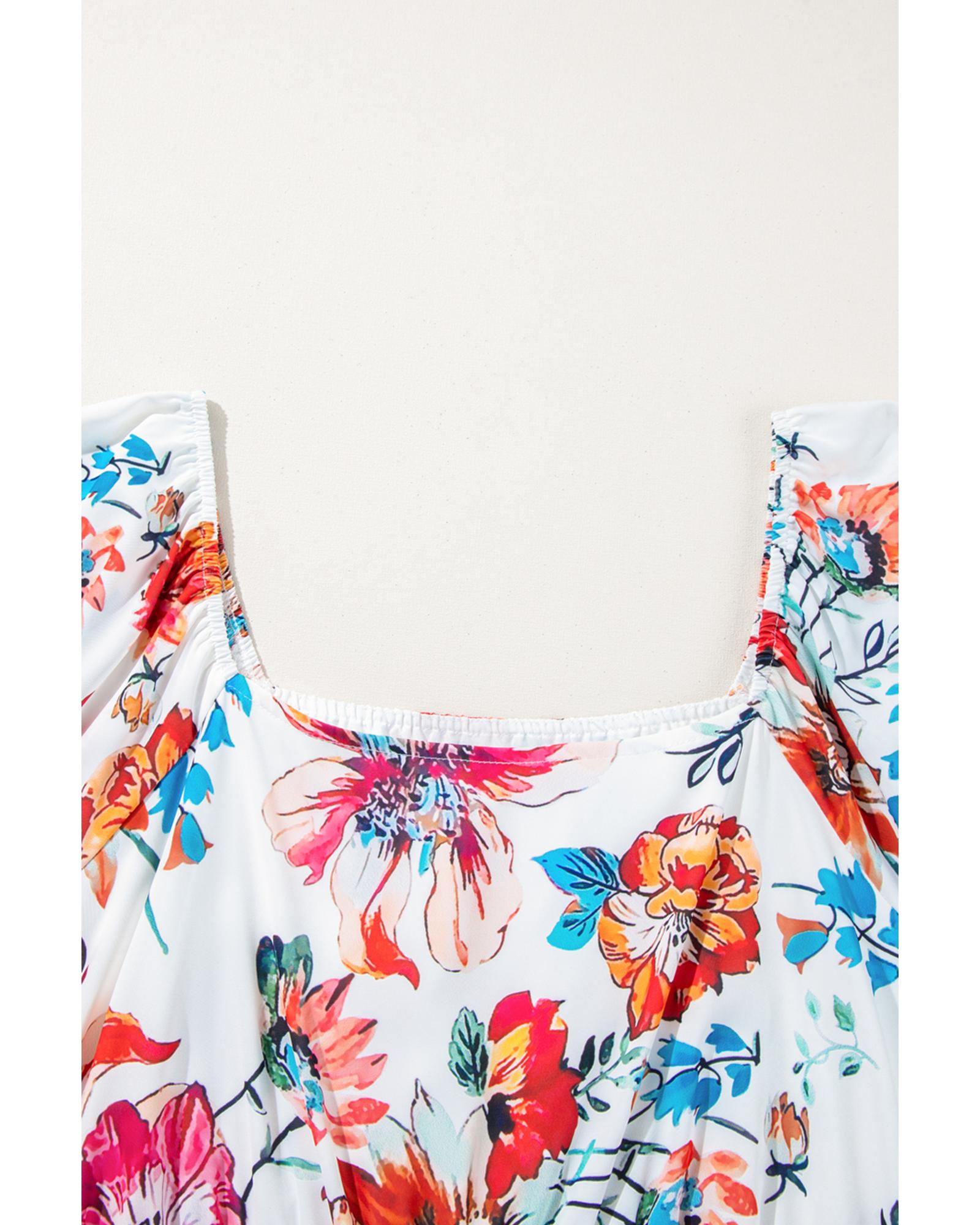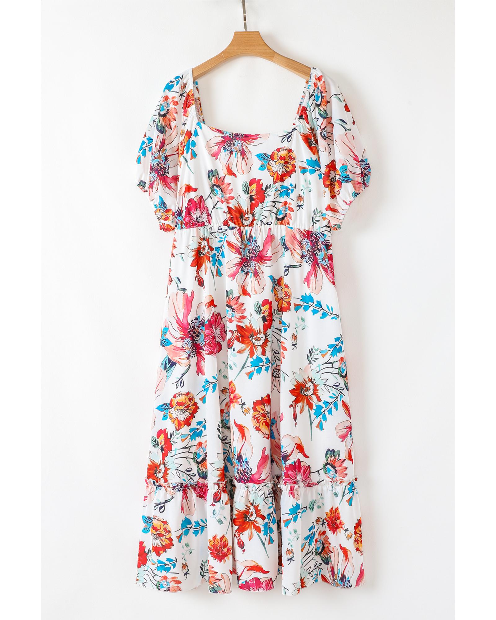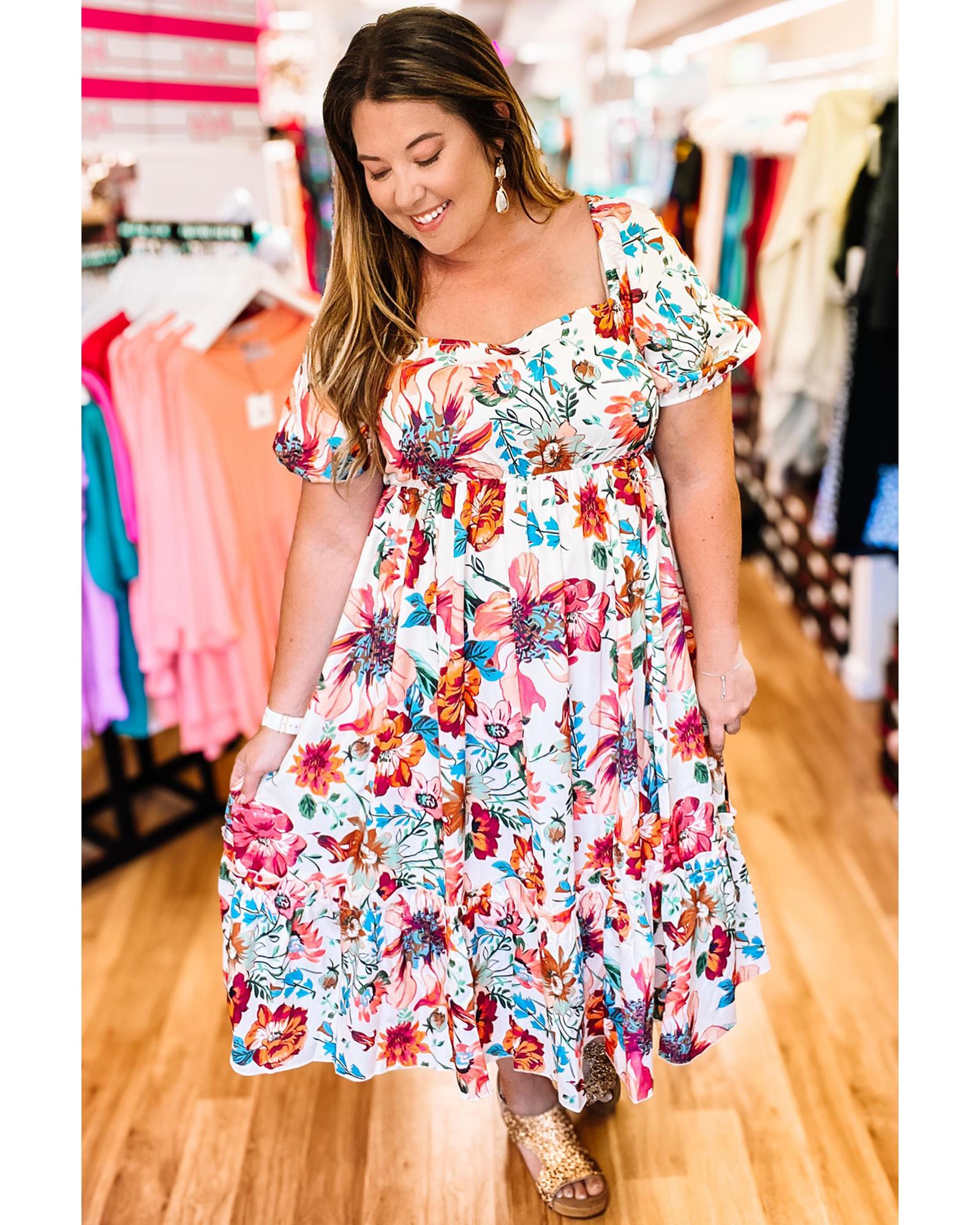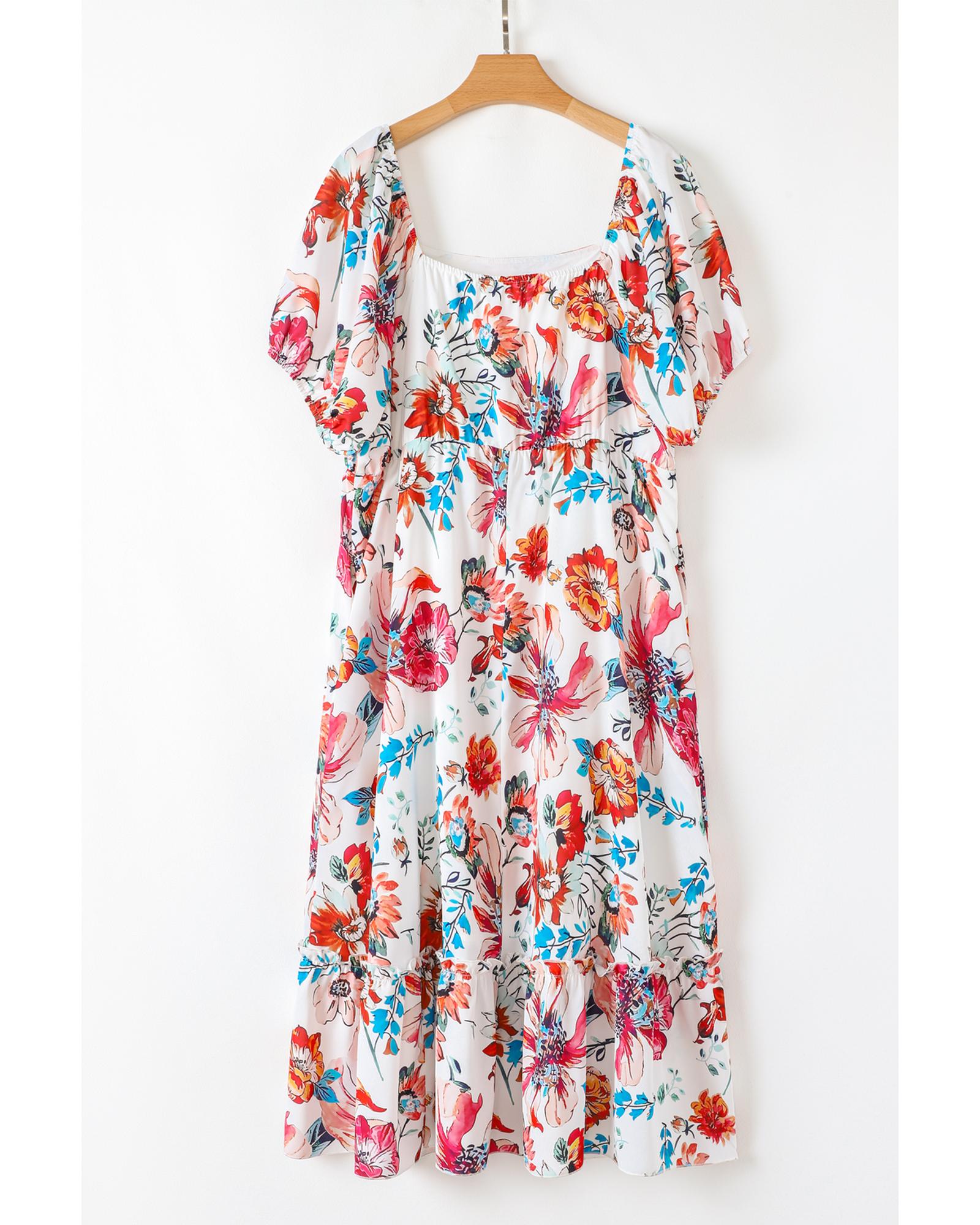 White Floral Square Neck Puff Sleeve Flowy Plus Size Midi Dress – 4X