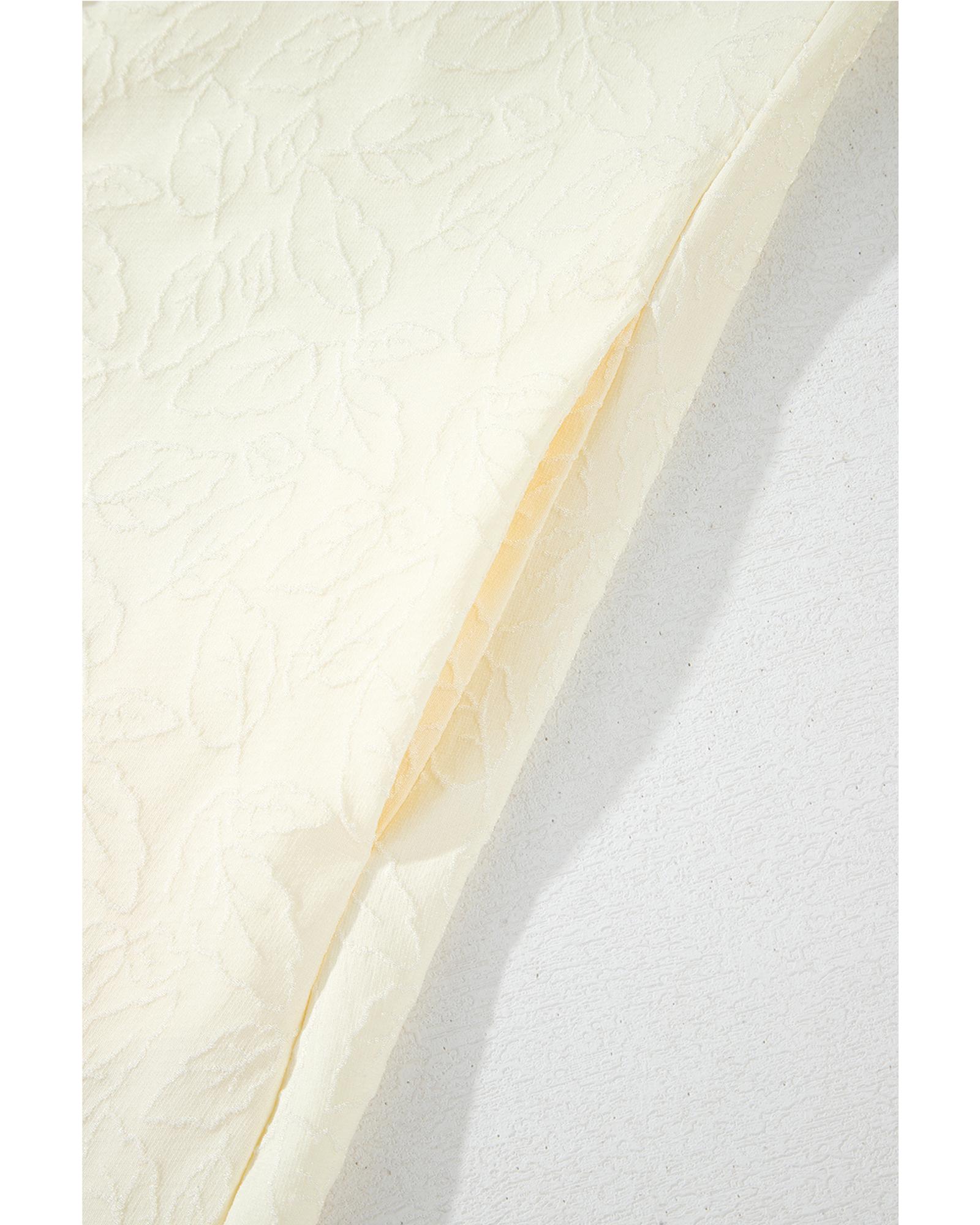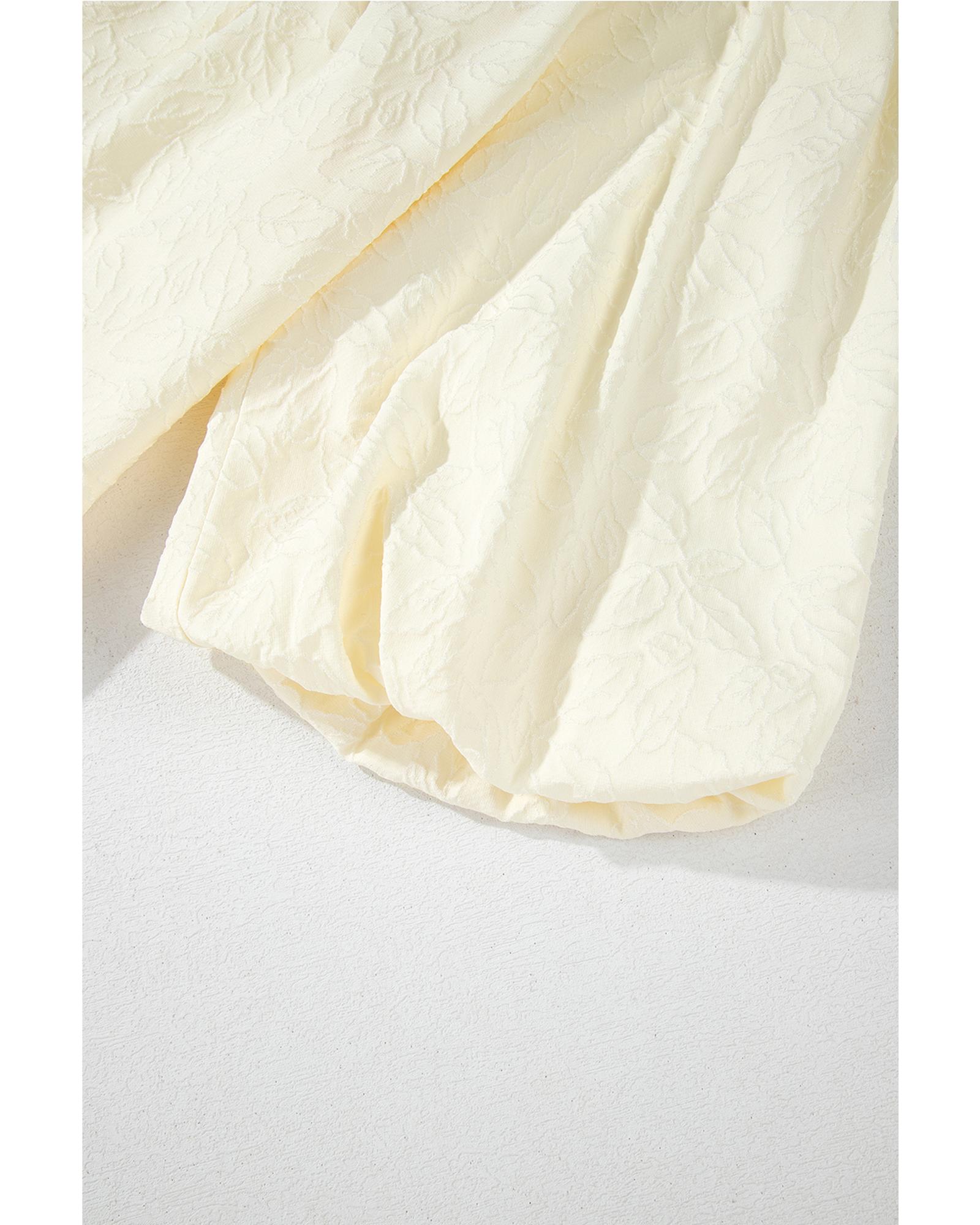 White Floral Textured Bubble Sleeve Frilled Notched Neck Dress – L