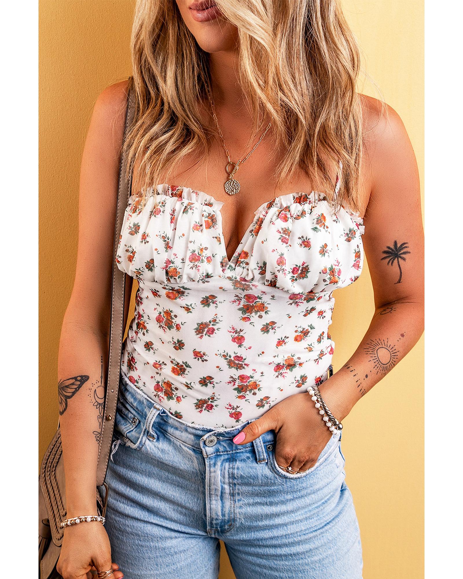- White Floral V Cut Frilled Trim Spaghetti Straps Bodysuit