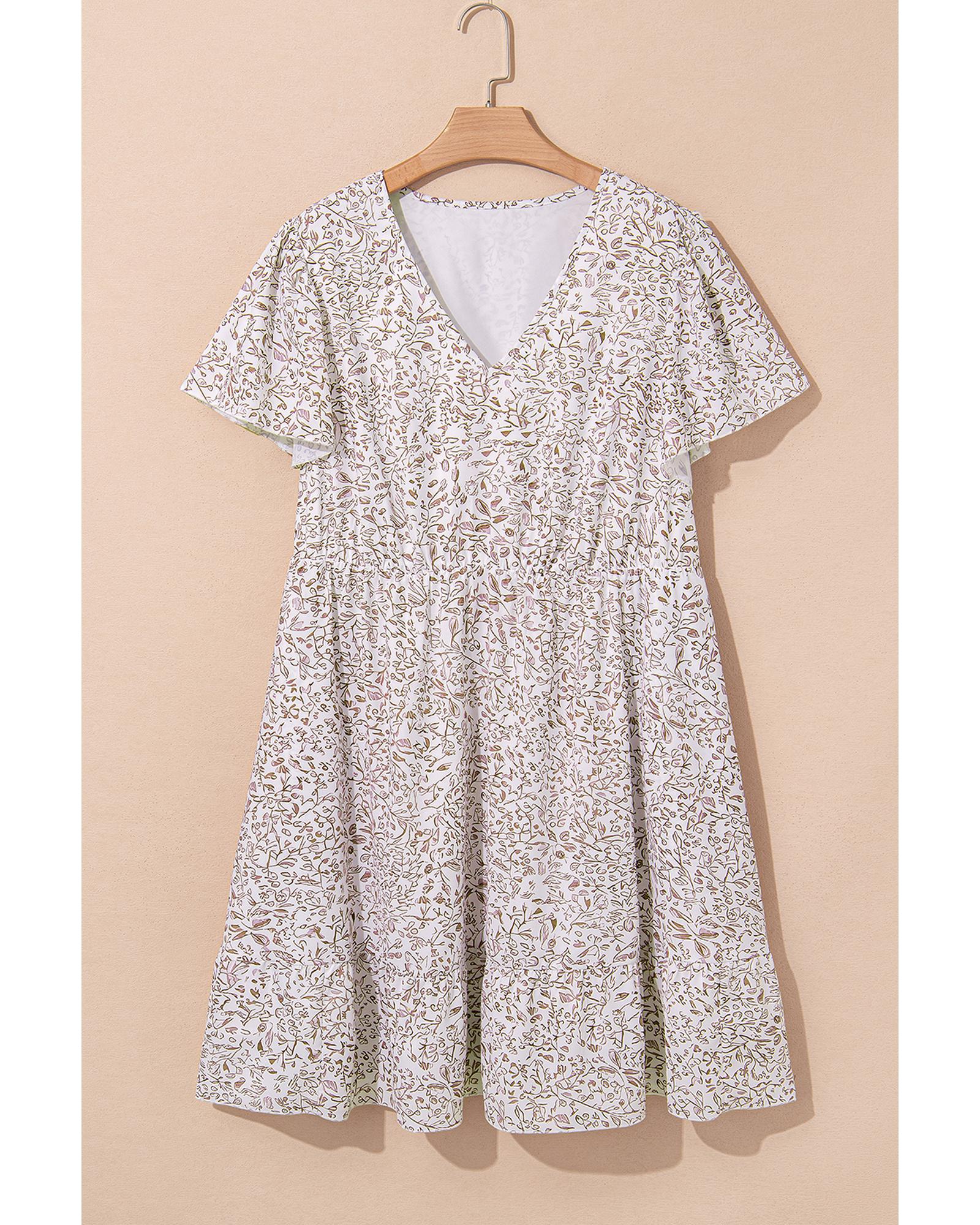 - White Floral V Neck Ruffled Short Sleeve Plus Size Dress