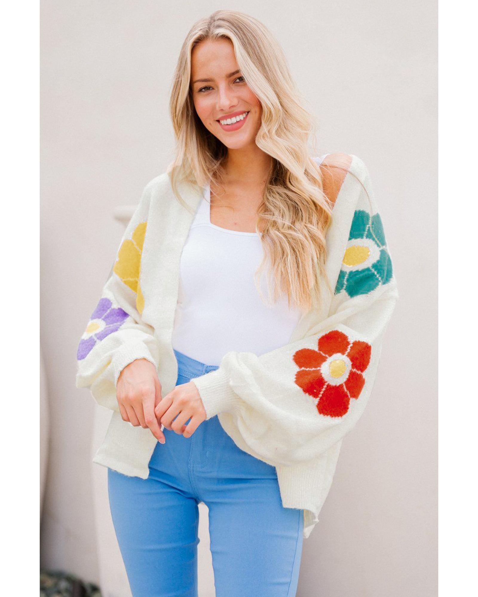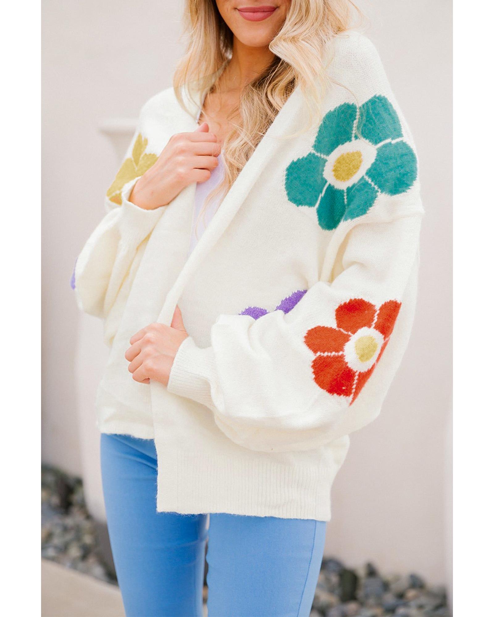 White Flower Jacquared Bubble Sleeve Open Cardigan – S