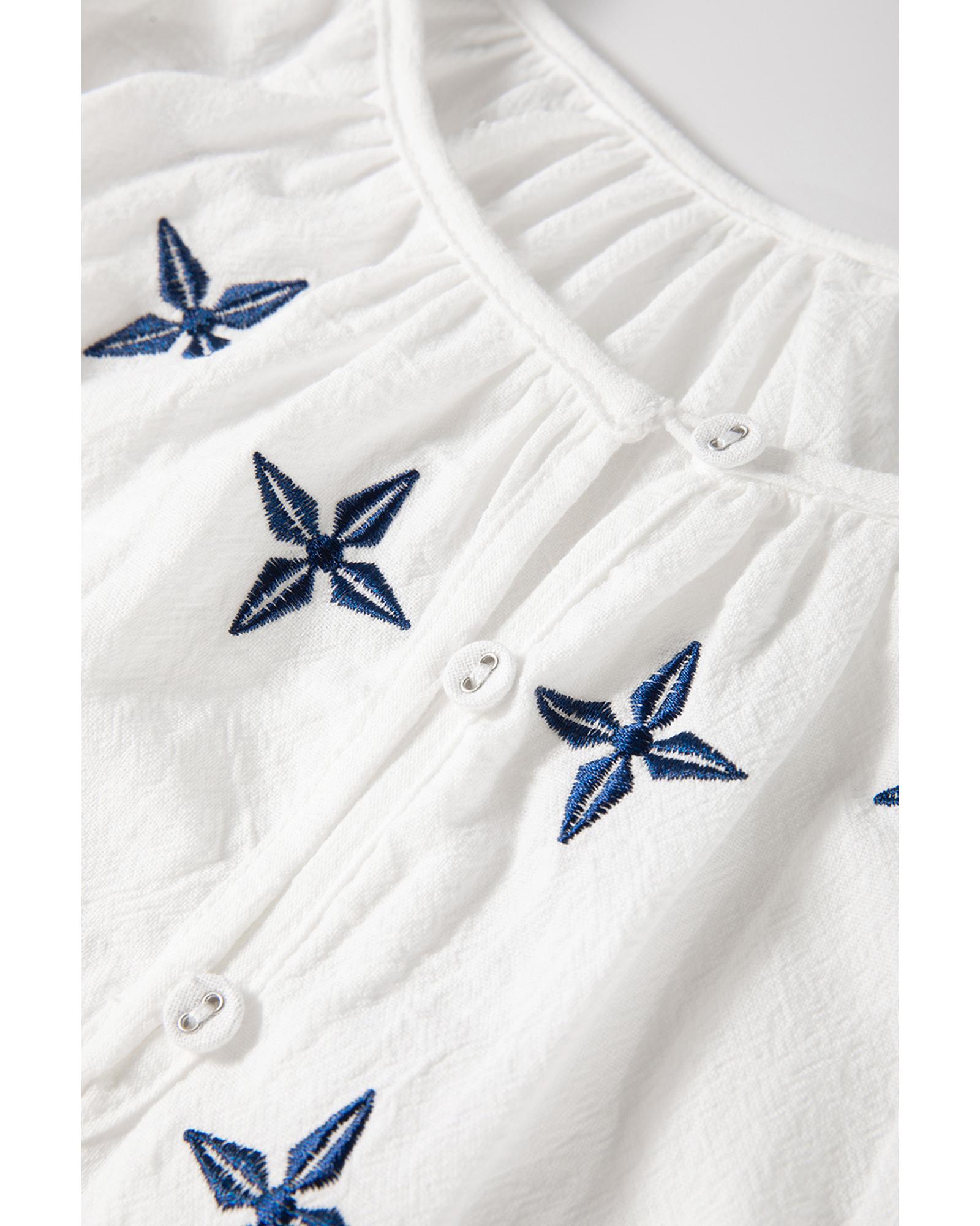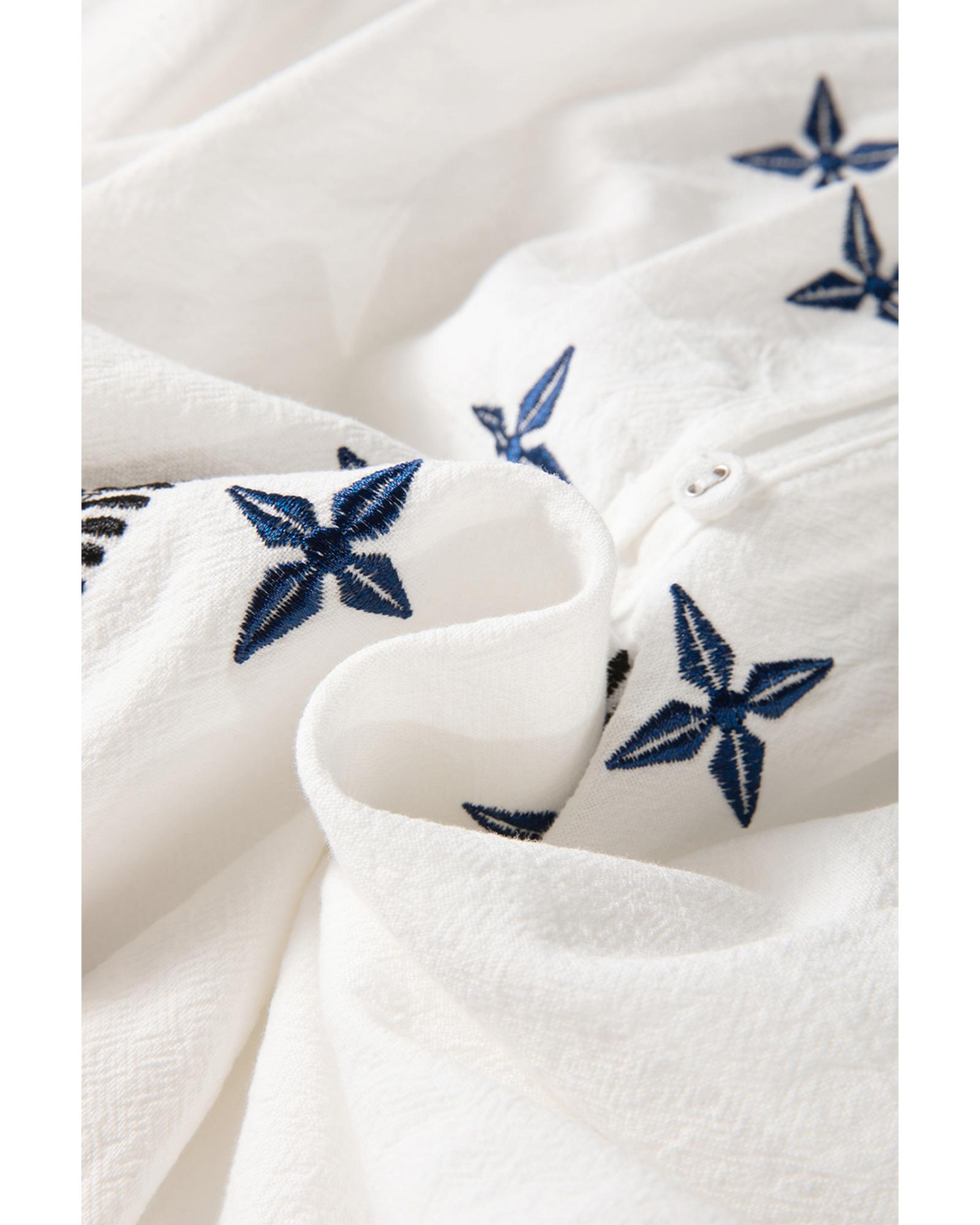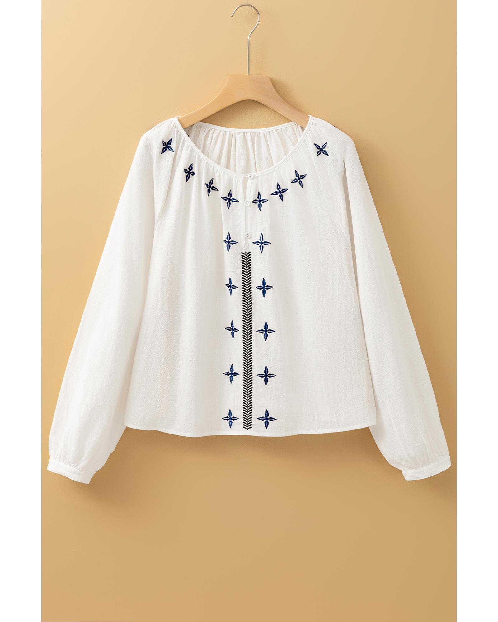 • White geometric embroidered long sleeve buttoned blouse