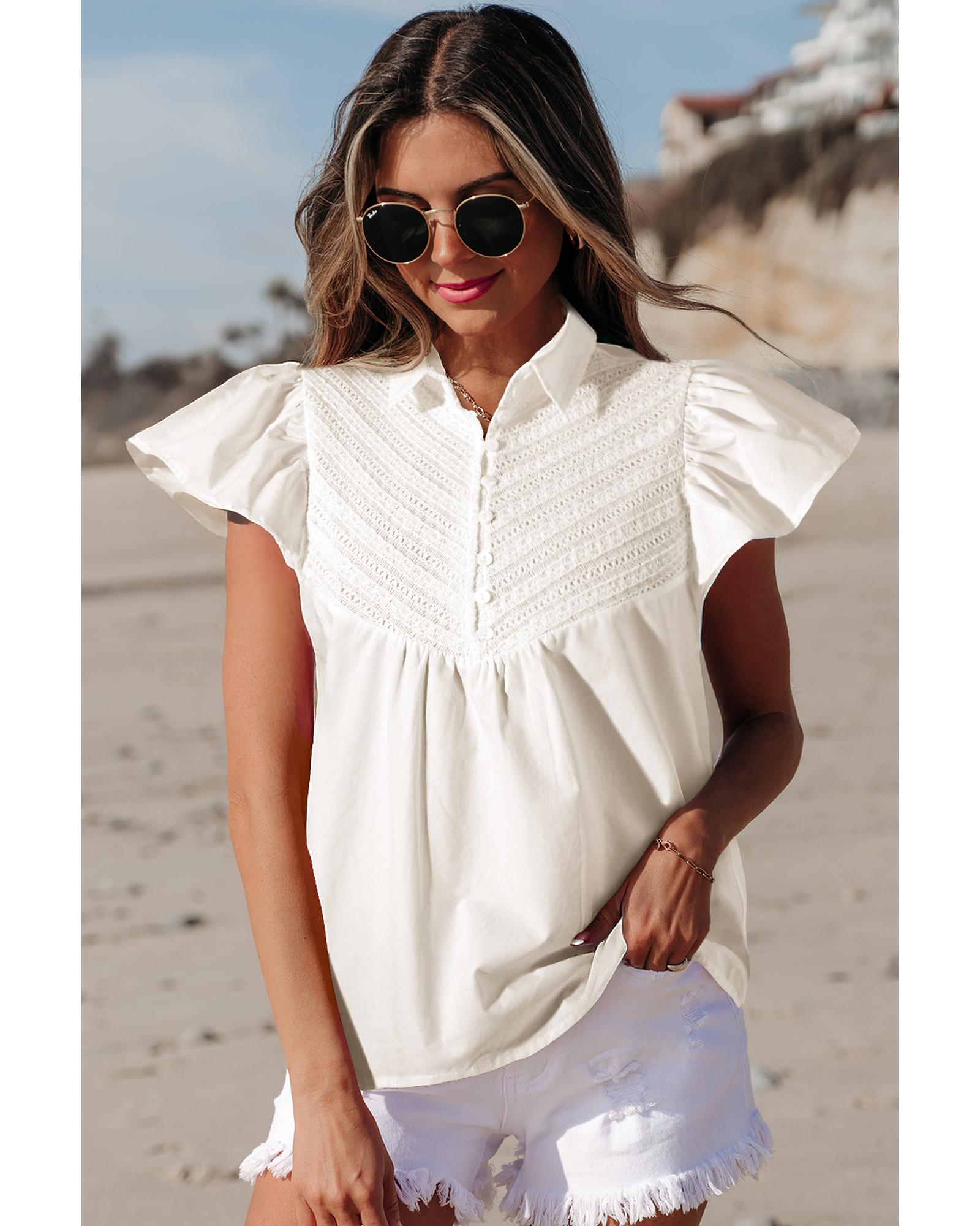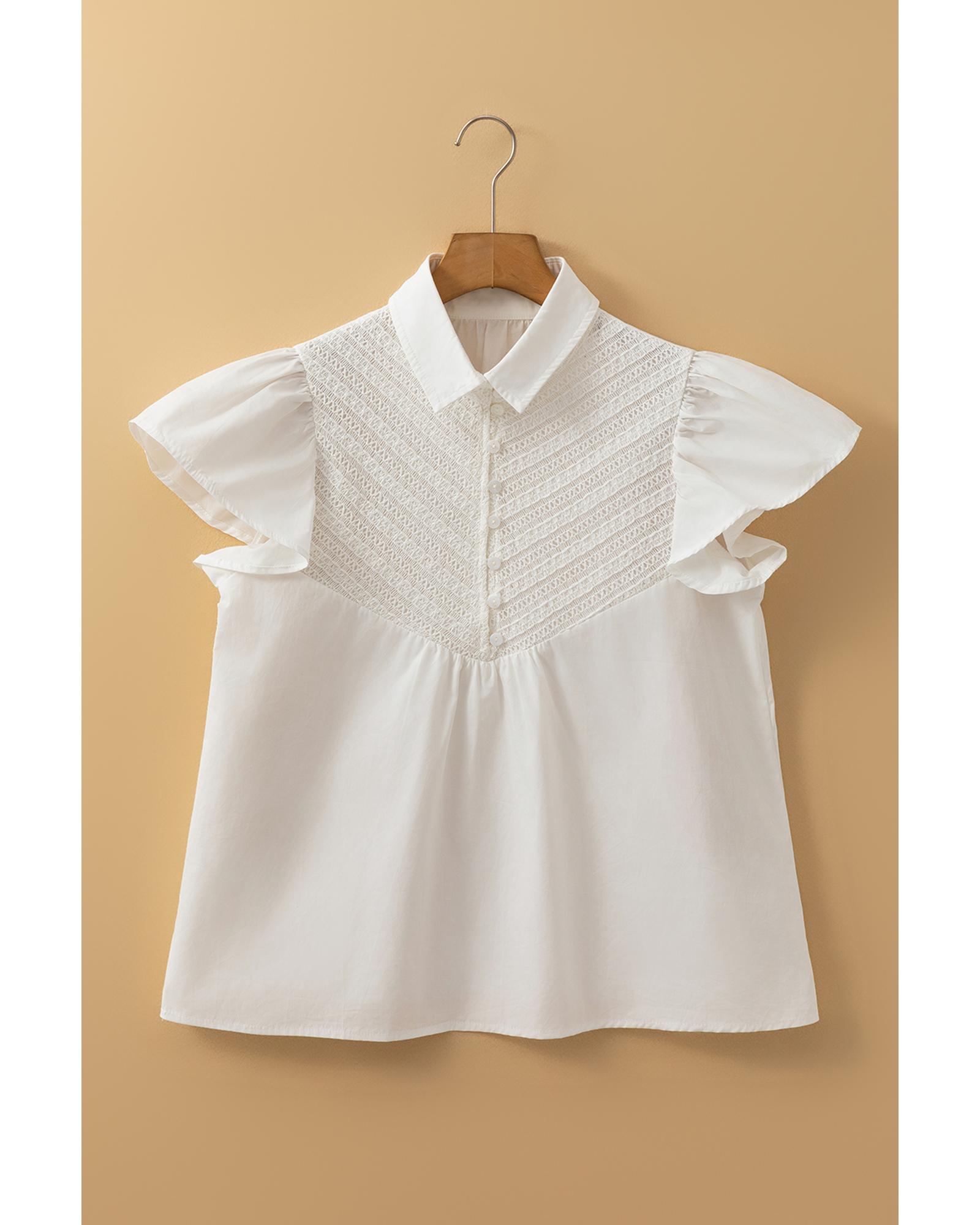 • White Half Button Lace Patchwork Flutter Sleeve Blouse