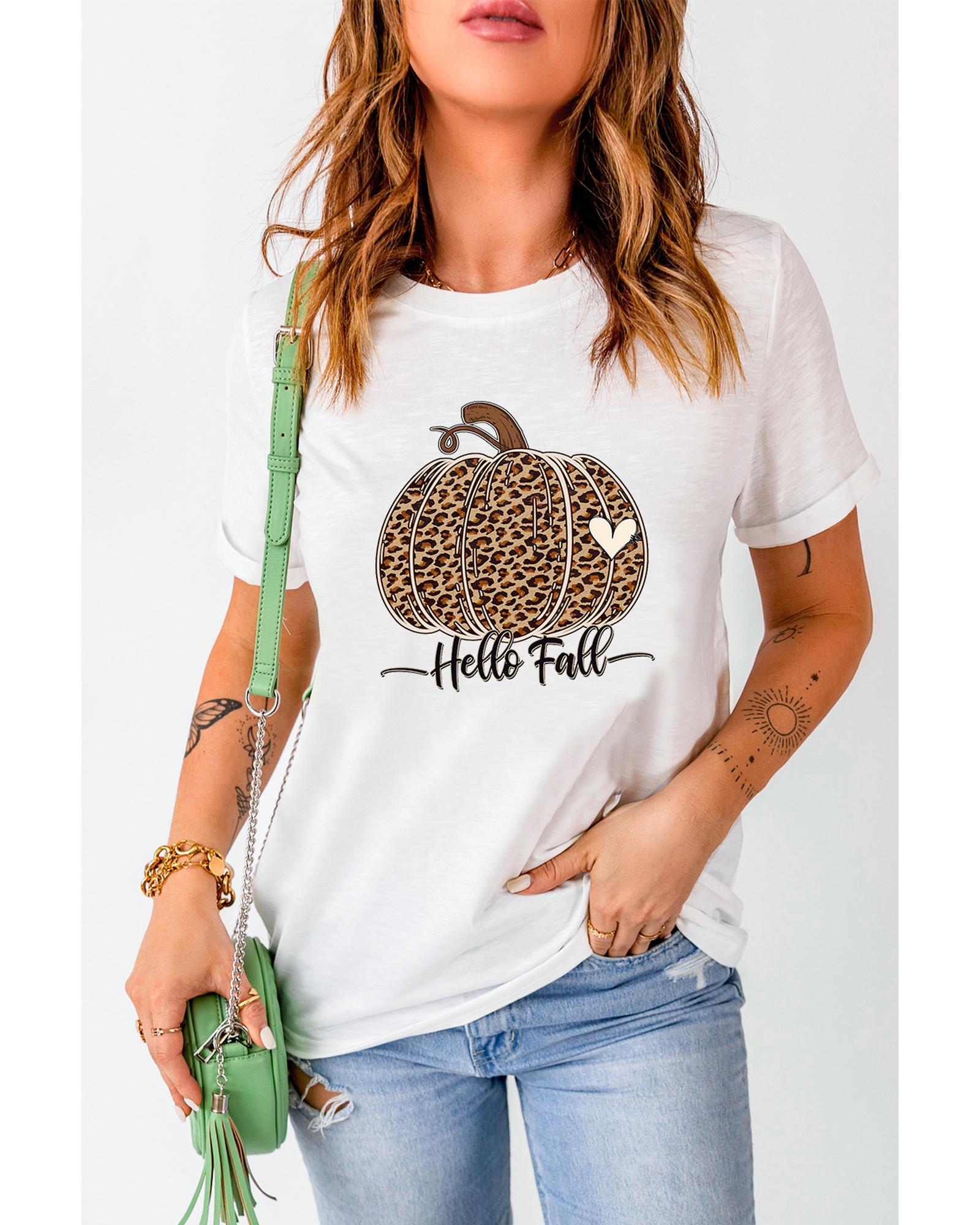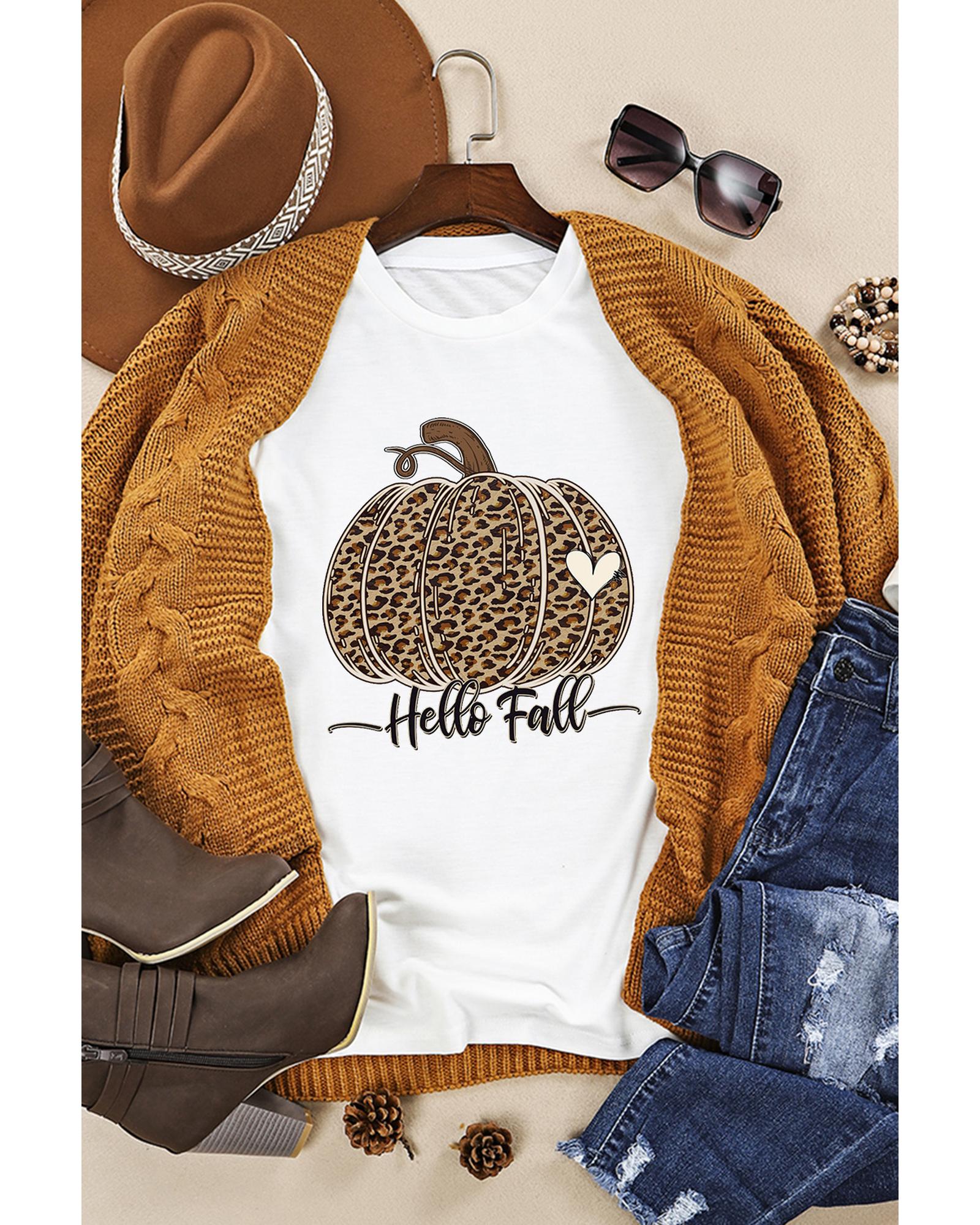 White Hello Fall Leopard Pumpkin Graphic T Shirt – 2XL