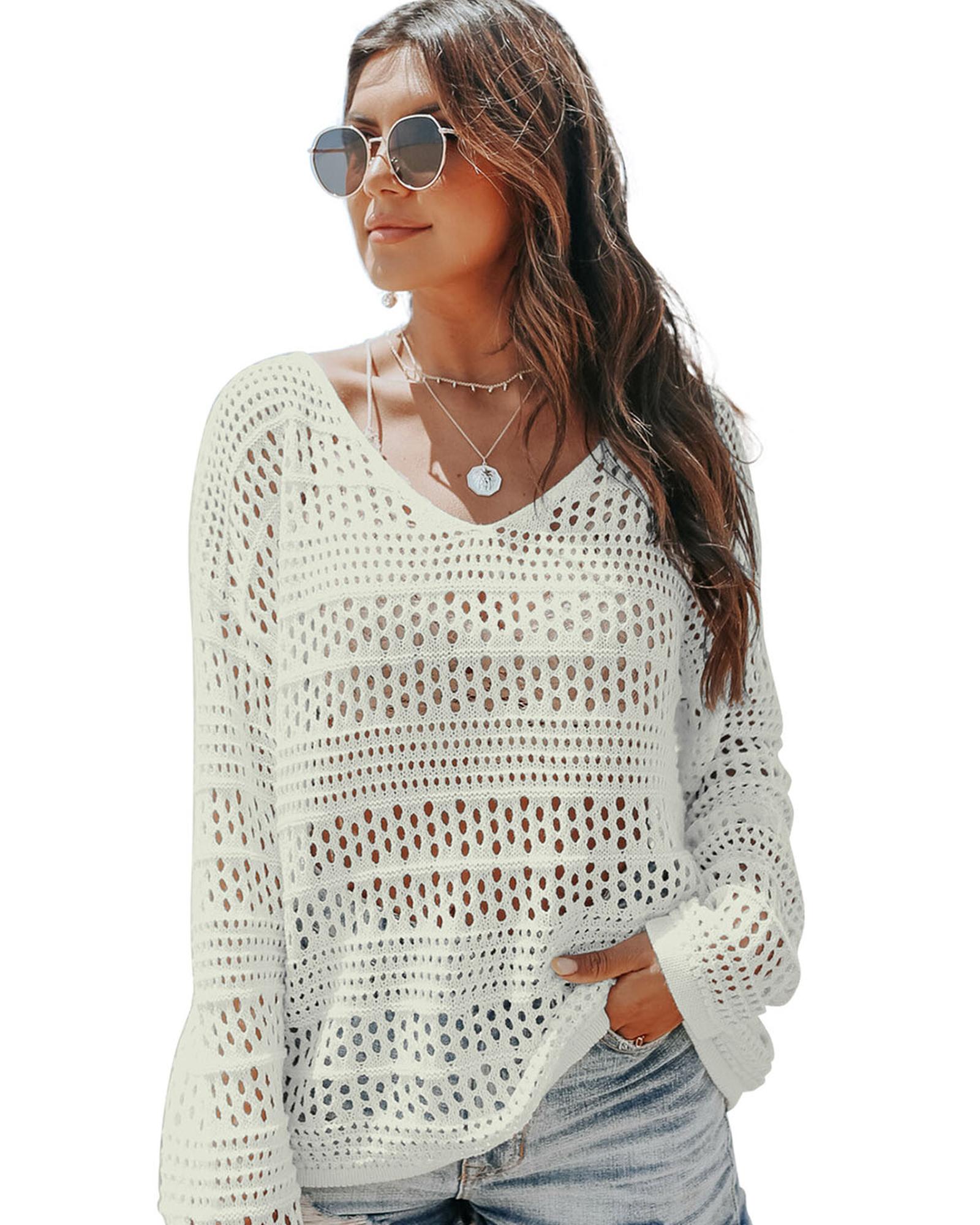 White Hollow Out Crochet V Neck Pullover Sweater – XL