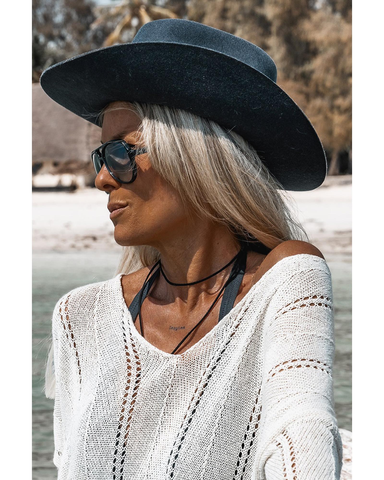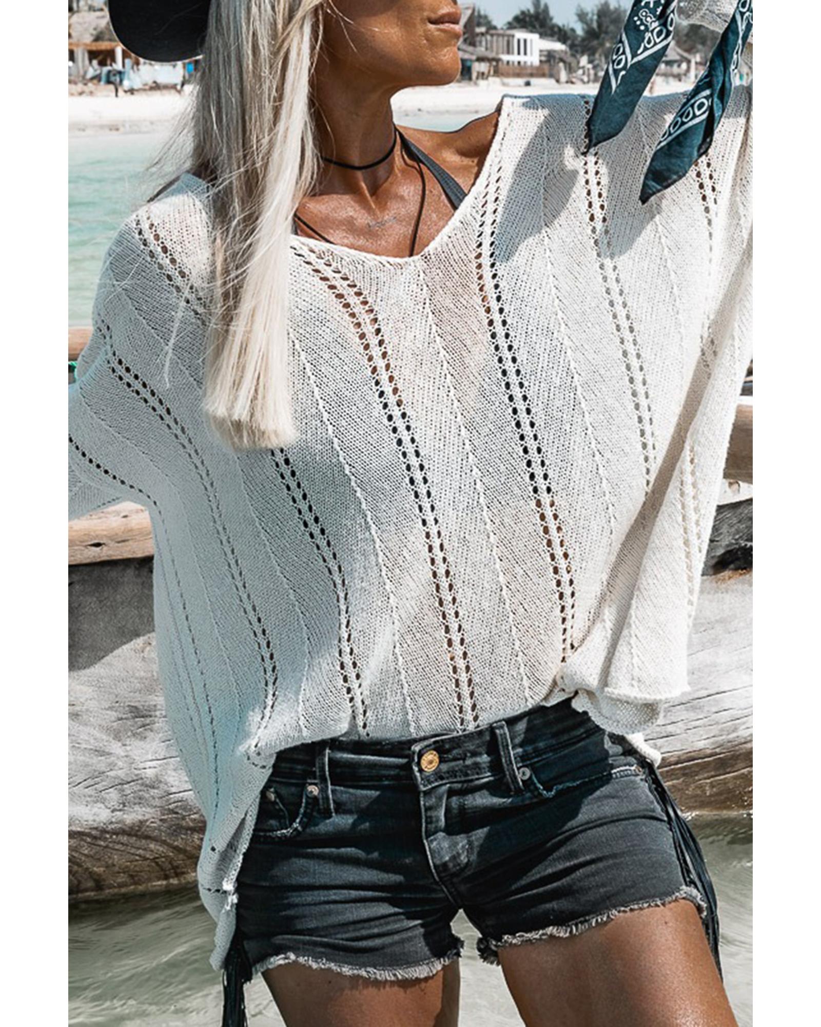 White Hollowed Detail Knitted Loose V Neck Sweater – L