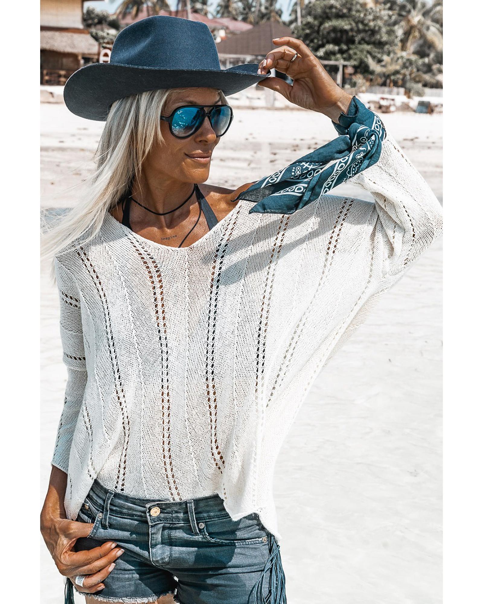 White Hollowed Detail Knitted Loose V Neck Sweater – M