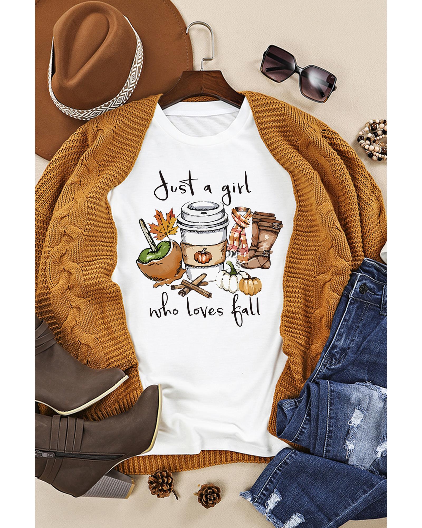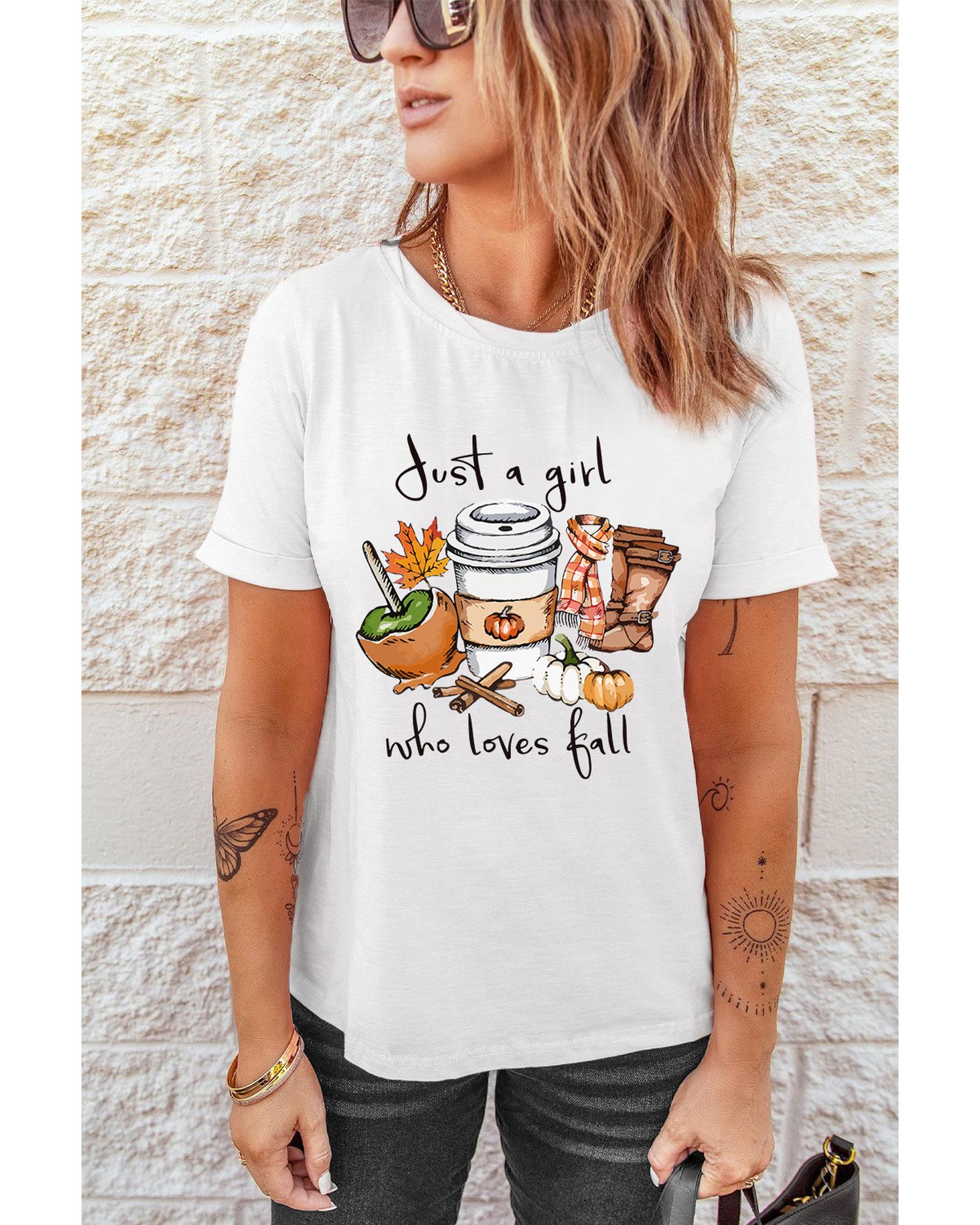 White Just A Girl Who Loves Fall Graphic T Shirt Fall Vibe Graphic Print Crew Neck High
