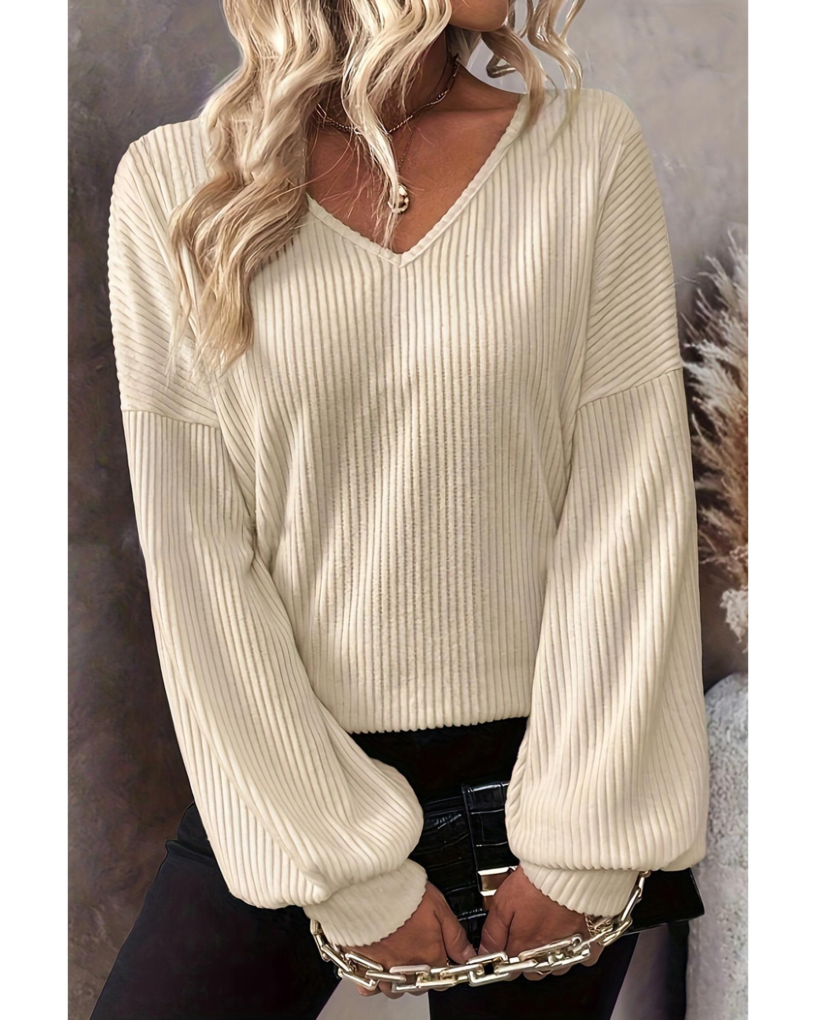 White Knot Back Drop Shoulder Ribbed Long Sleeve Blouse – L