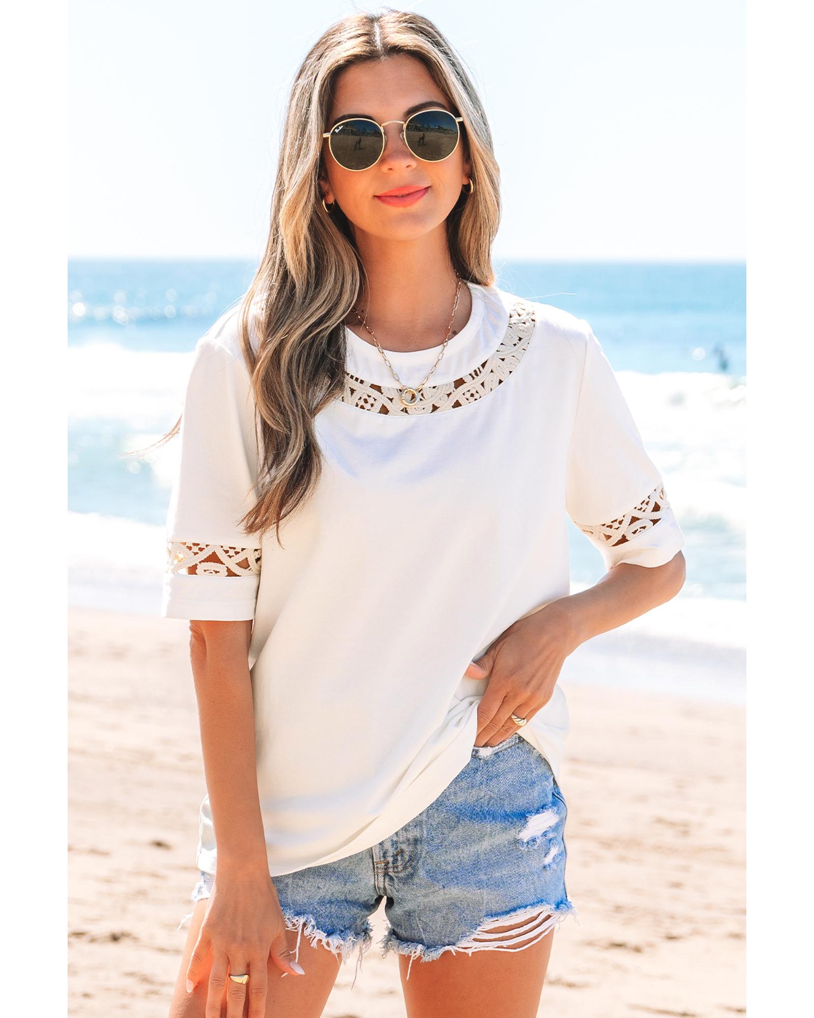 White Lace Crochet Crew Neck Casual T Shirt – XL