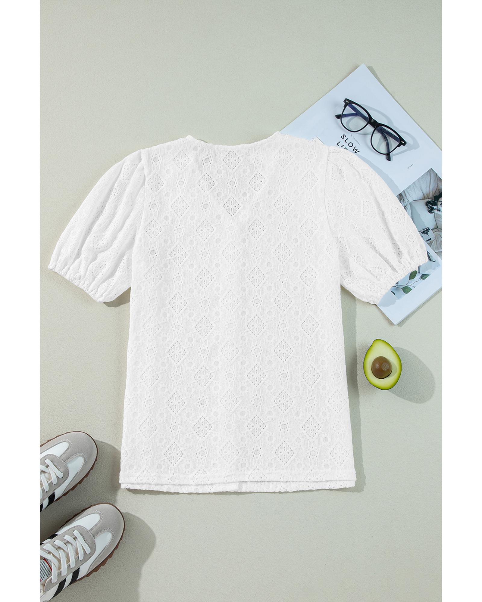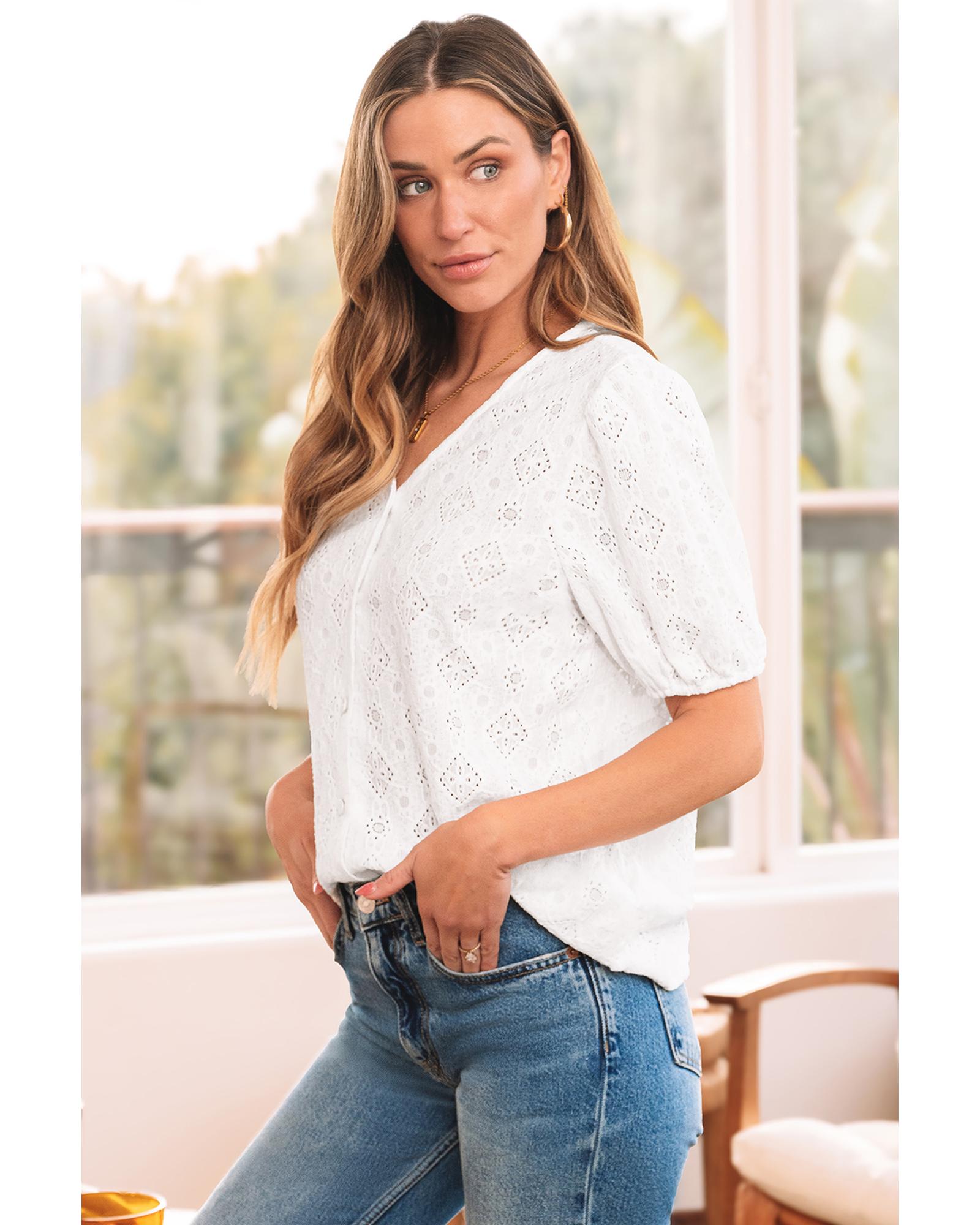 White Lace Puff Sleeve V Neck Button Up Shirt – M