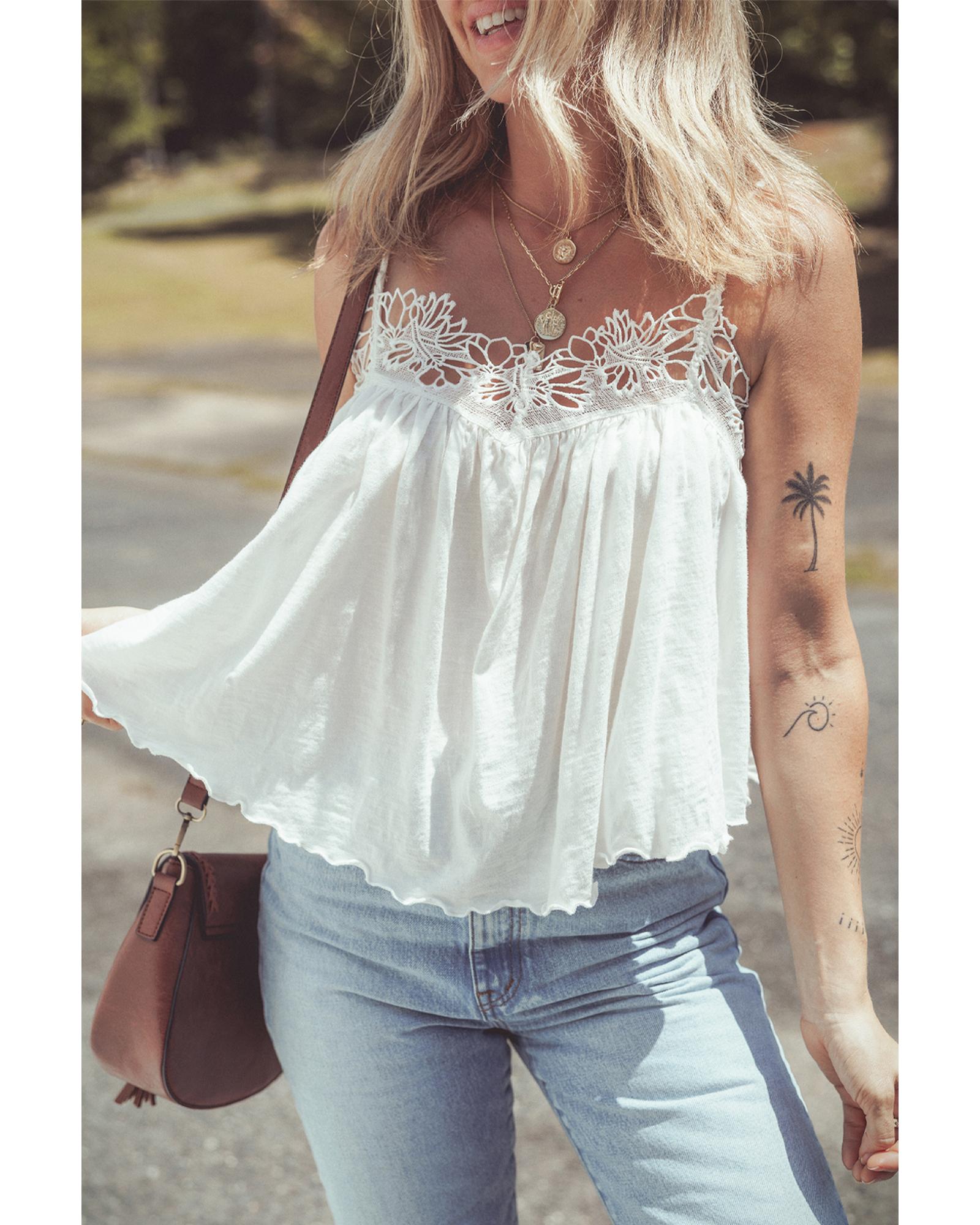 White Lace Splicing Spaghetti Straps Ruffle Flared Tank Top – L